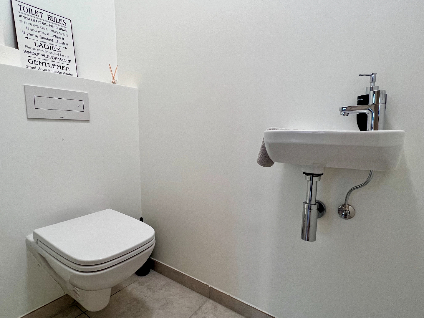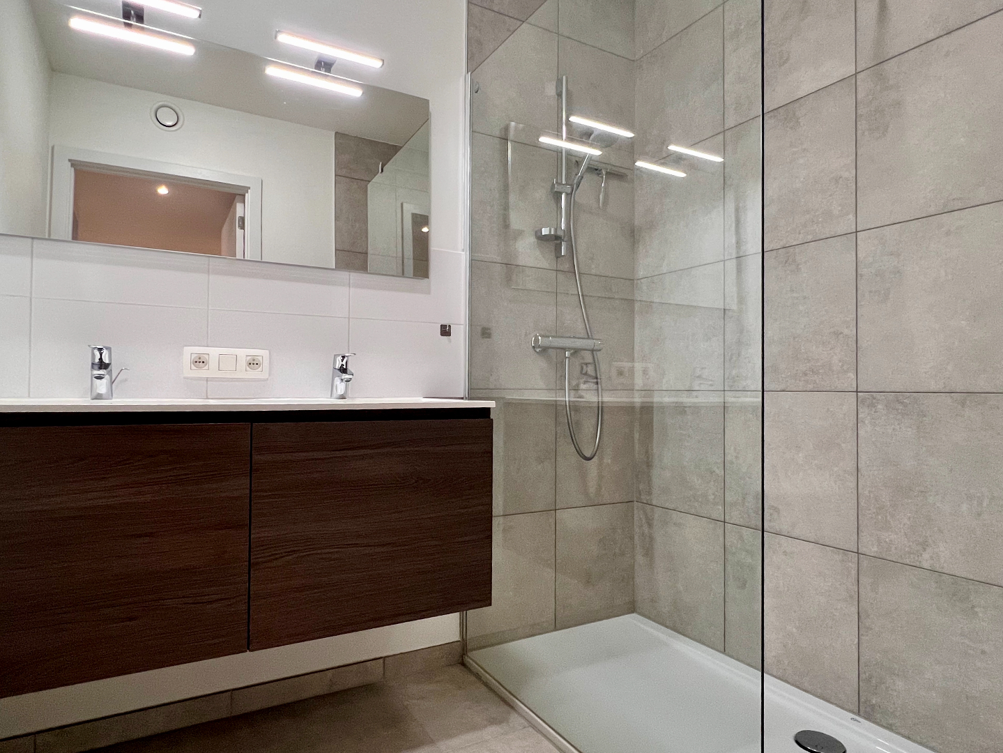 De slaapvertrekken zijn vooraan gelegen, de badkamer uitgerust met een royale inloopdouche en dubbele wastafel. Het gastentoilet bevindt zich in de gang. Was-en berging pal aan de keuken waar zich tevens het ventilatiesysteem en hoogrendementsketel (Warmtenetten IMOG).