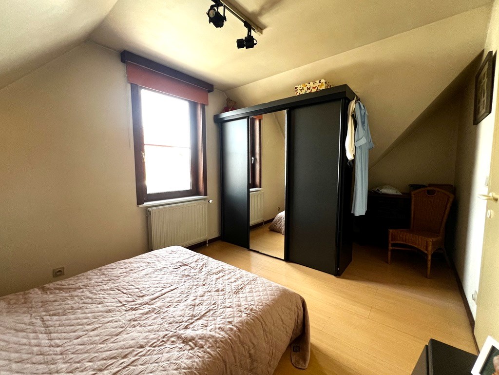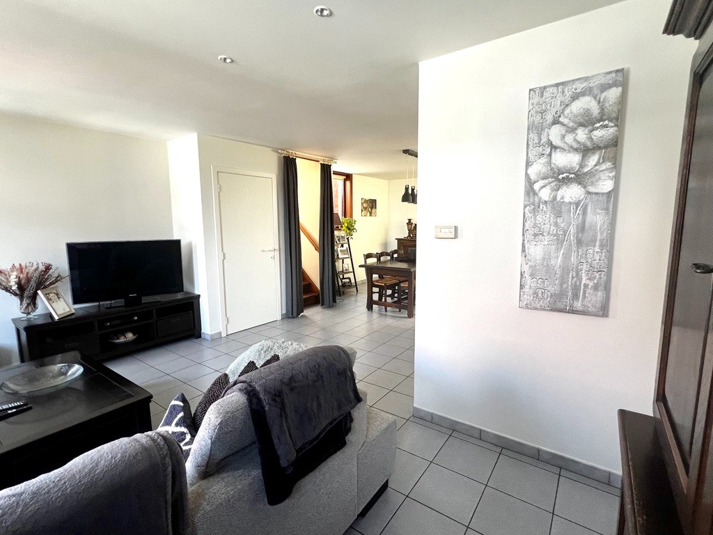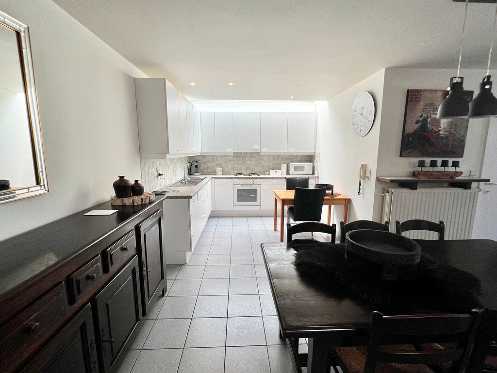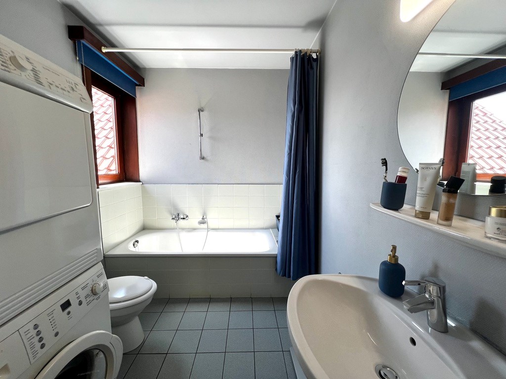 De trap op en u komt in de inkomhal met gastentoilet. Van daaruit stapt u naar de ruime leef- en eetruimte met open keuken. Een praktische berging onder de trap. Op het halfhoge verdiep vindt u het zuidgericht terrasje, een halve trap hoger komt u bij twee grote slaapkamers en een badkamer met toilet, lavabo, ligbad en aansluiting voor de wasmachine en droogkast.