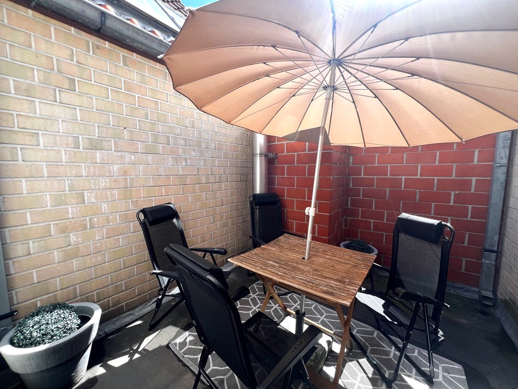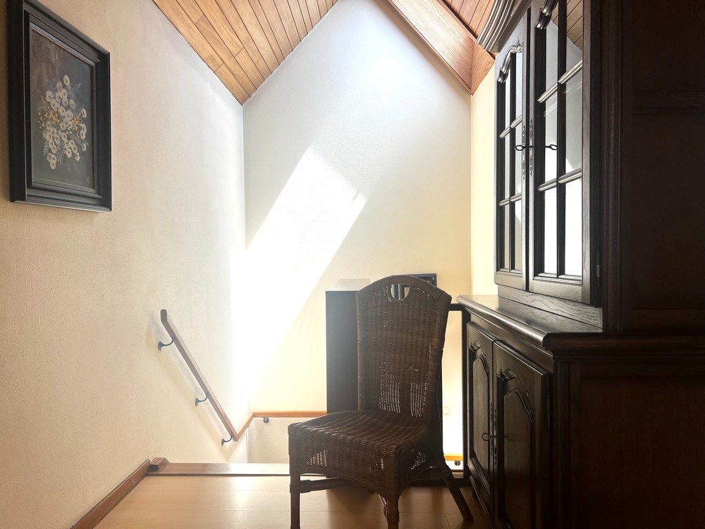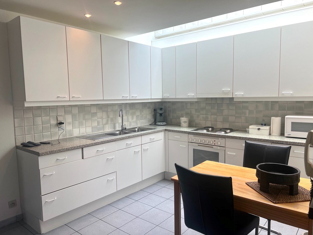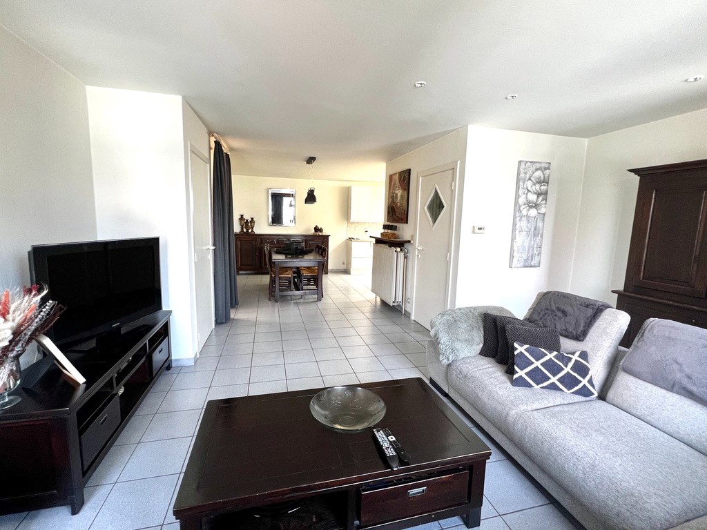 De trap op en u komt in de inkomhal met gastentoilet. Van daaruit stapt u naar de ruime leef- en eetruimte met open keuken. Een praktische berging onder de trap. Op het halfhoge verdiep vindt u het zuidgericht terrasje, een halve trap hoger komt u bij twee grote slaapkamers en een badkamer met toilet, lavabo, ligbad en aansluiting voor de wasmachine en droogkast.