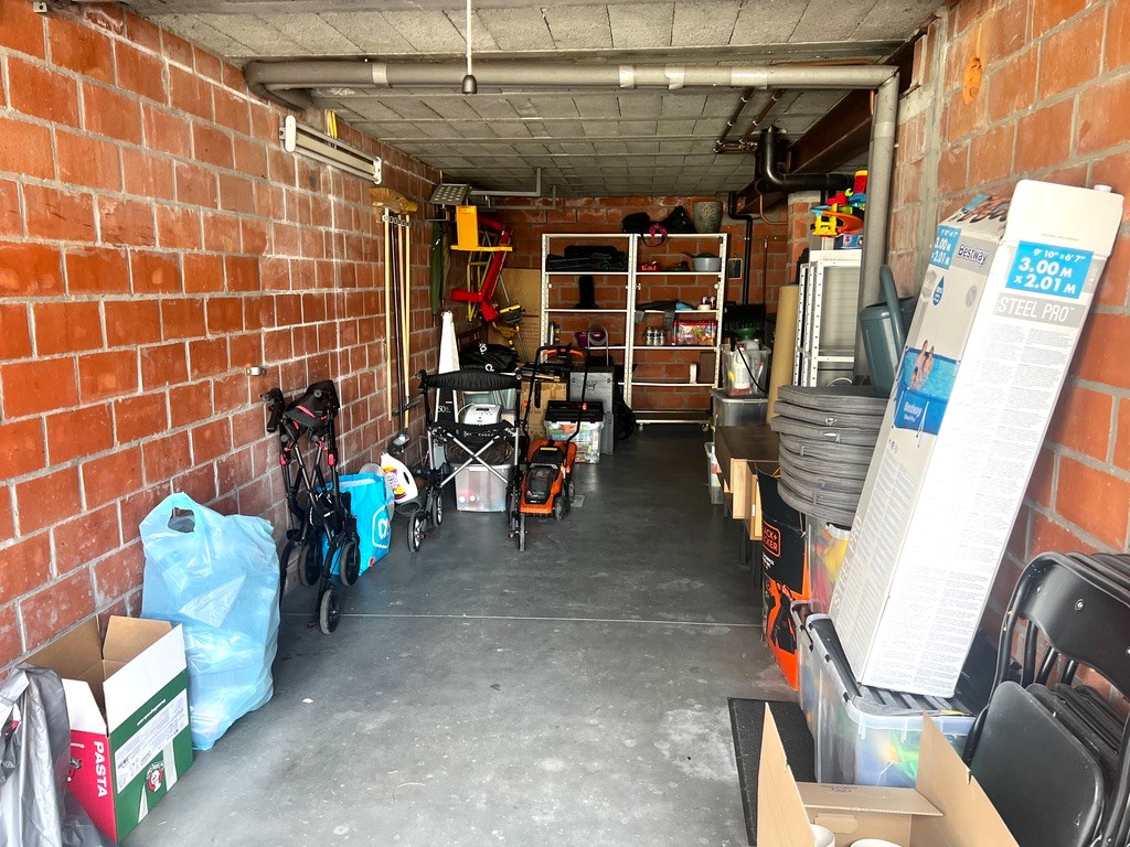 Een heel grote garage waar fietsen en auto hun plaatsje vinden.