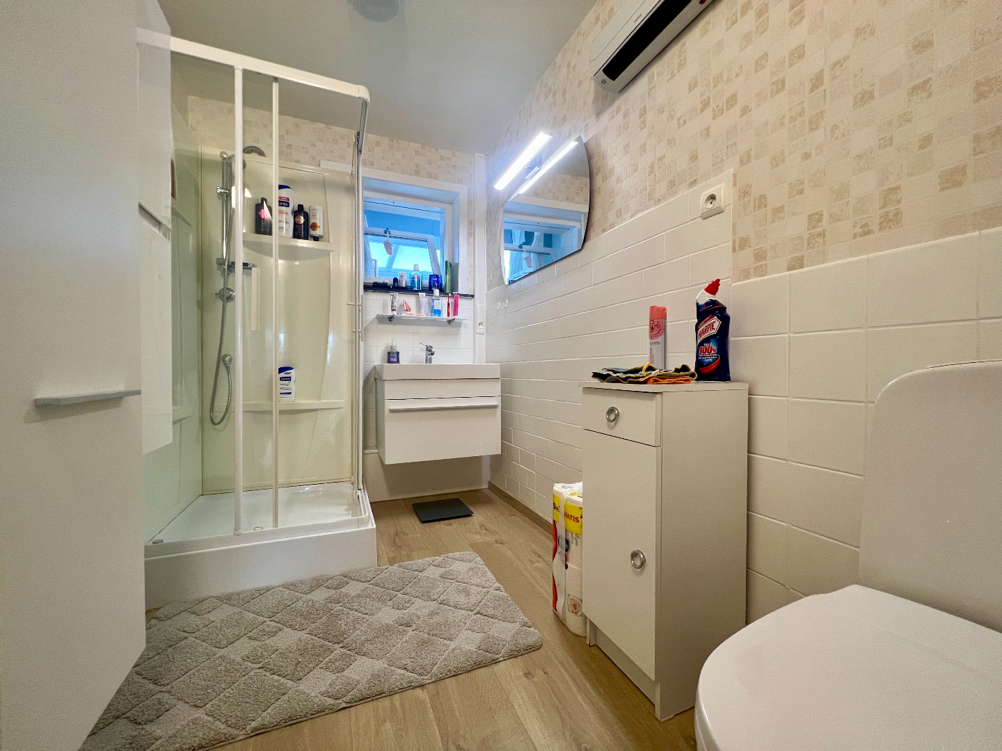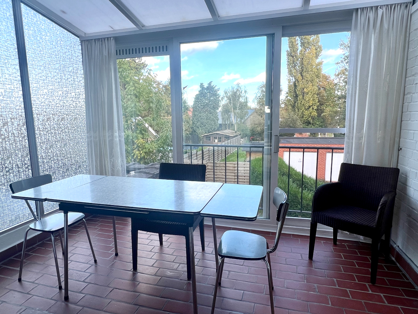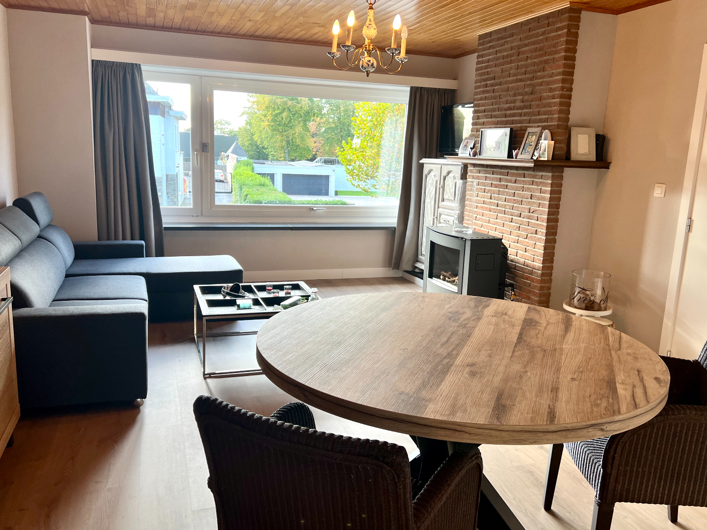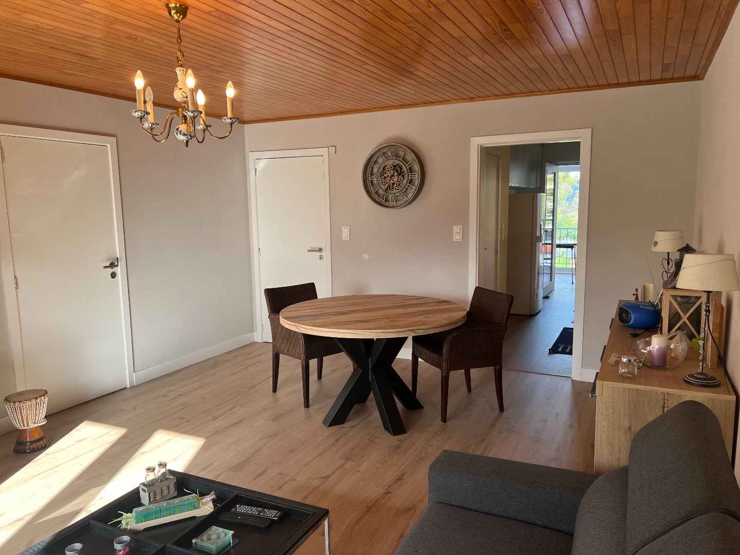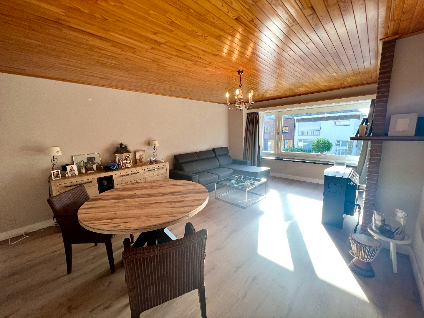 Binnenkomen in de inkomhal, een heel gezellige leef- en eetruimte met zicht op de straatzijde, een goed-uitgeruste keuken met aanpalend een berging voor de wasmachine. Tevens een veranda met zicht op groen, hier is het heerlijk om 's morgens te ontbijten. Twee ruime slaapkamers, badkamer met wasmeubel, toilet en douche en een berging voor de proviand.