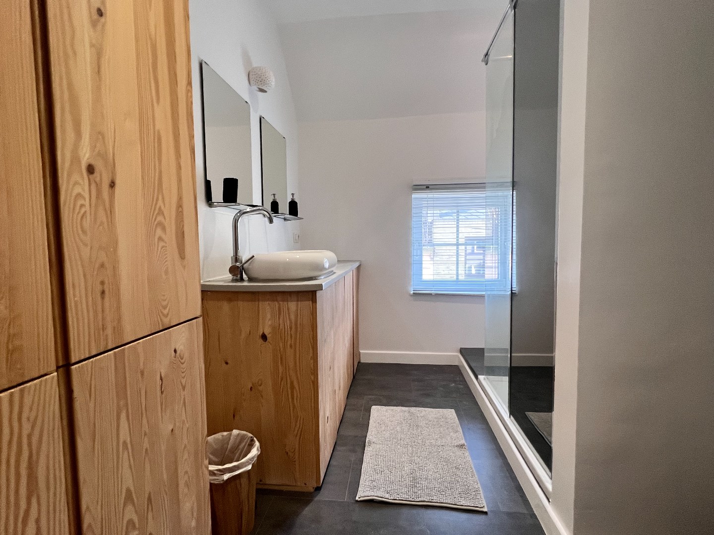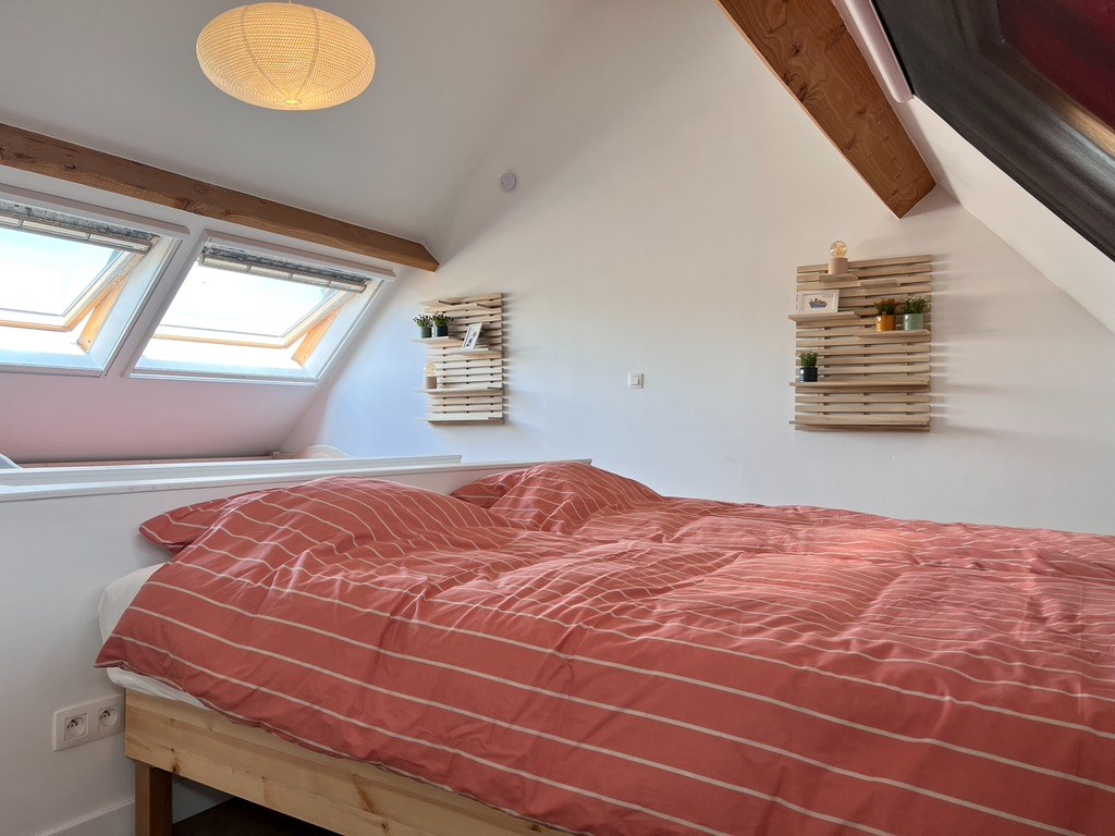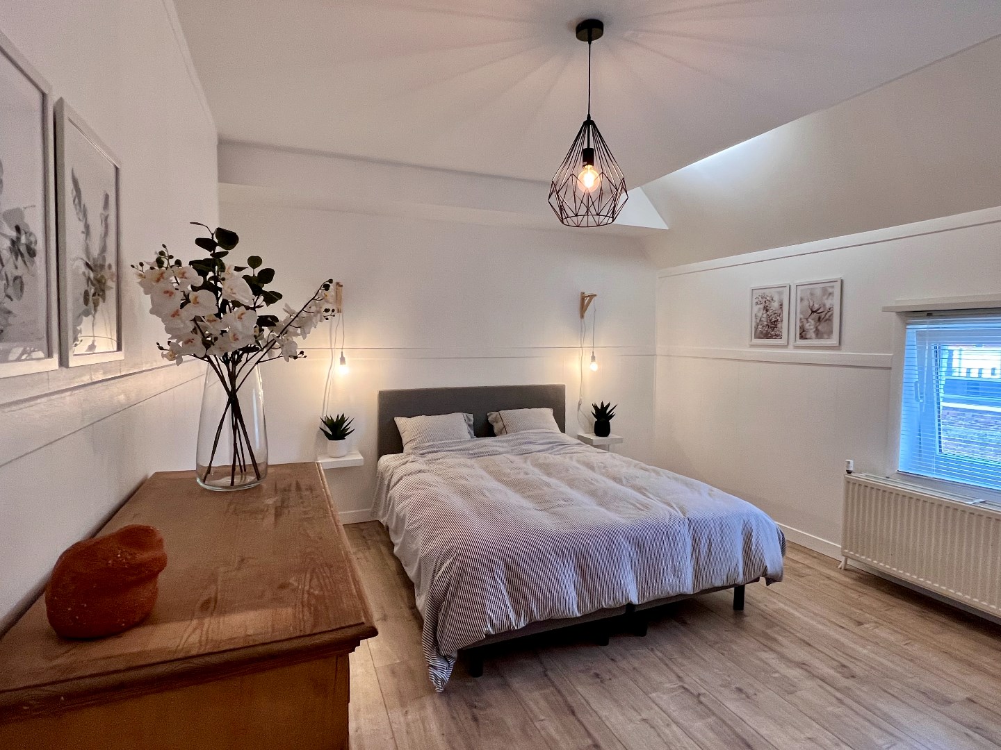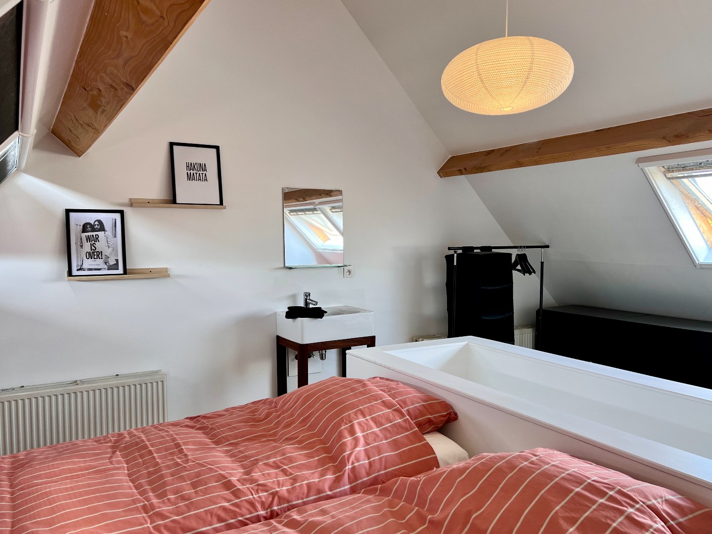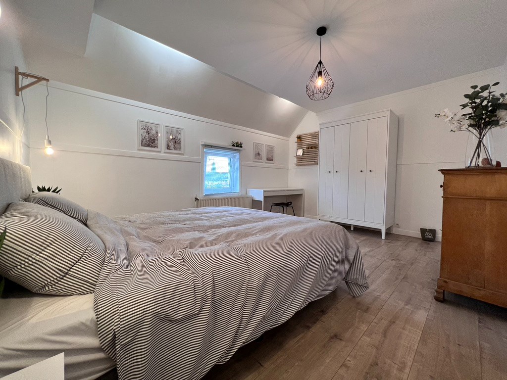 Het derde verdiep is volledig ingericht in een grote slaapkamer met wasmeubel.