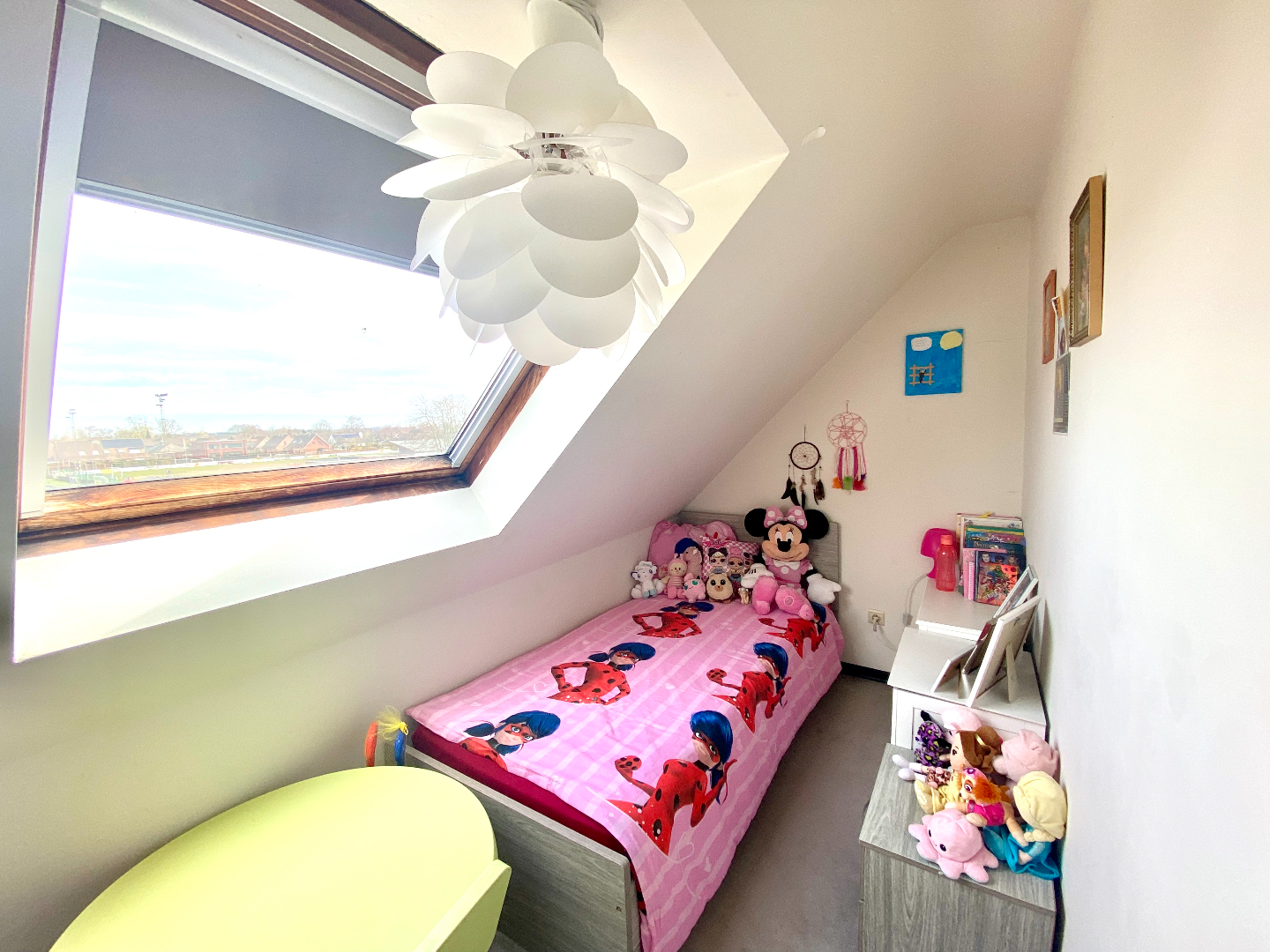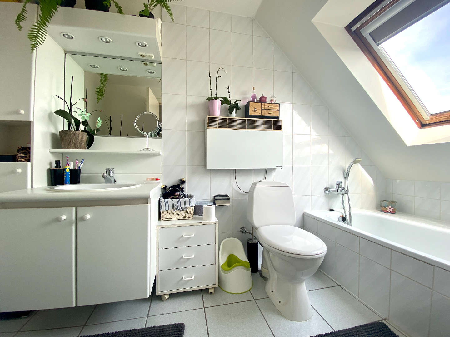 Op het verdiep een hele grote slaapkamer en een kleine slaapkamer, badkamer met ligbad, wastafel en toilet (nutsleidingen wasmachine voorzien).