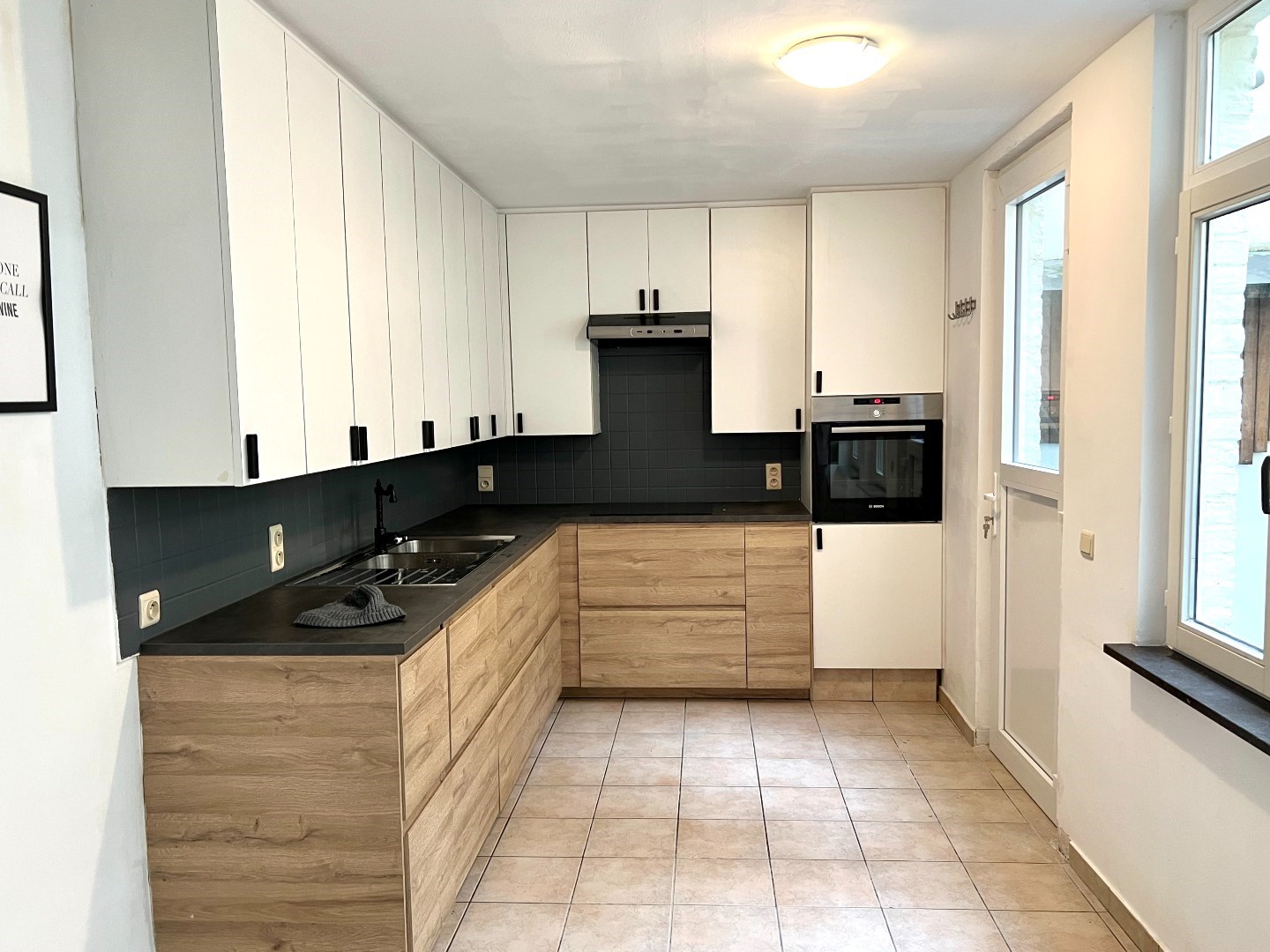 Gelijkvloers: gang, leefruimte in 2 delen, keuken, groot terras.