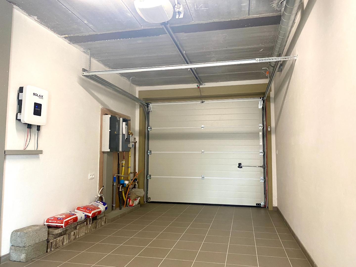 De garage met elektrische poort paalt aan de keuken, gemakkelijk om de boodschappen binnen te brengen en tevens kan u er uw wasmachine en droogkast in kwijt.