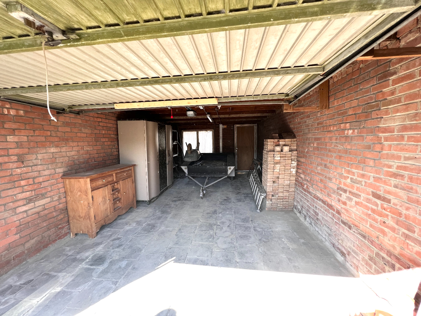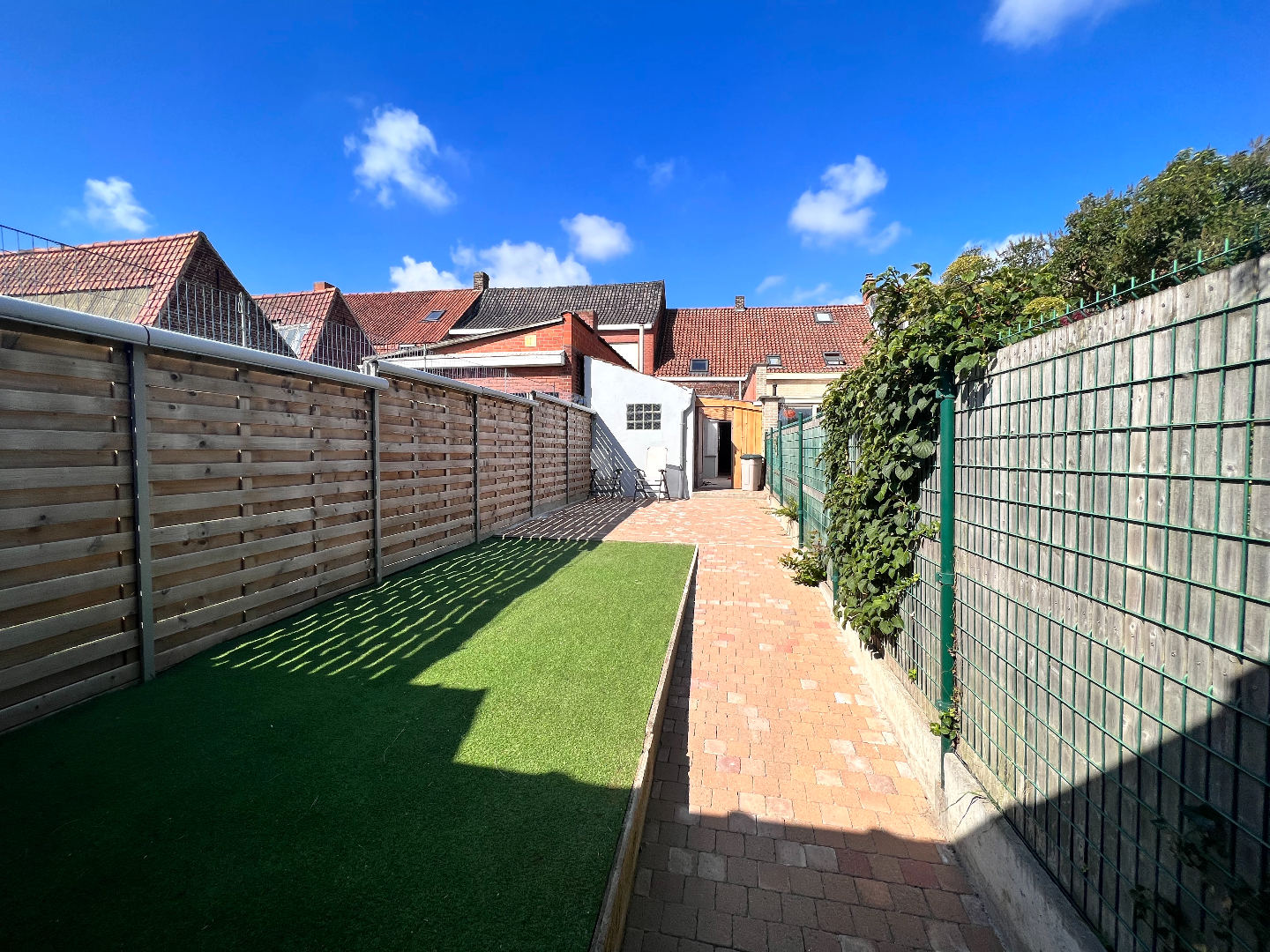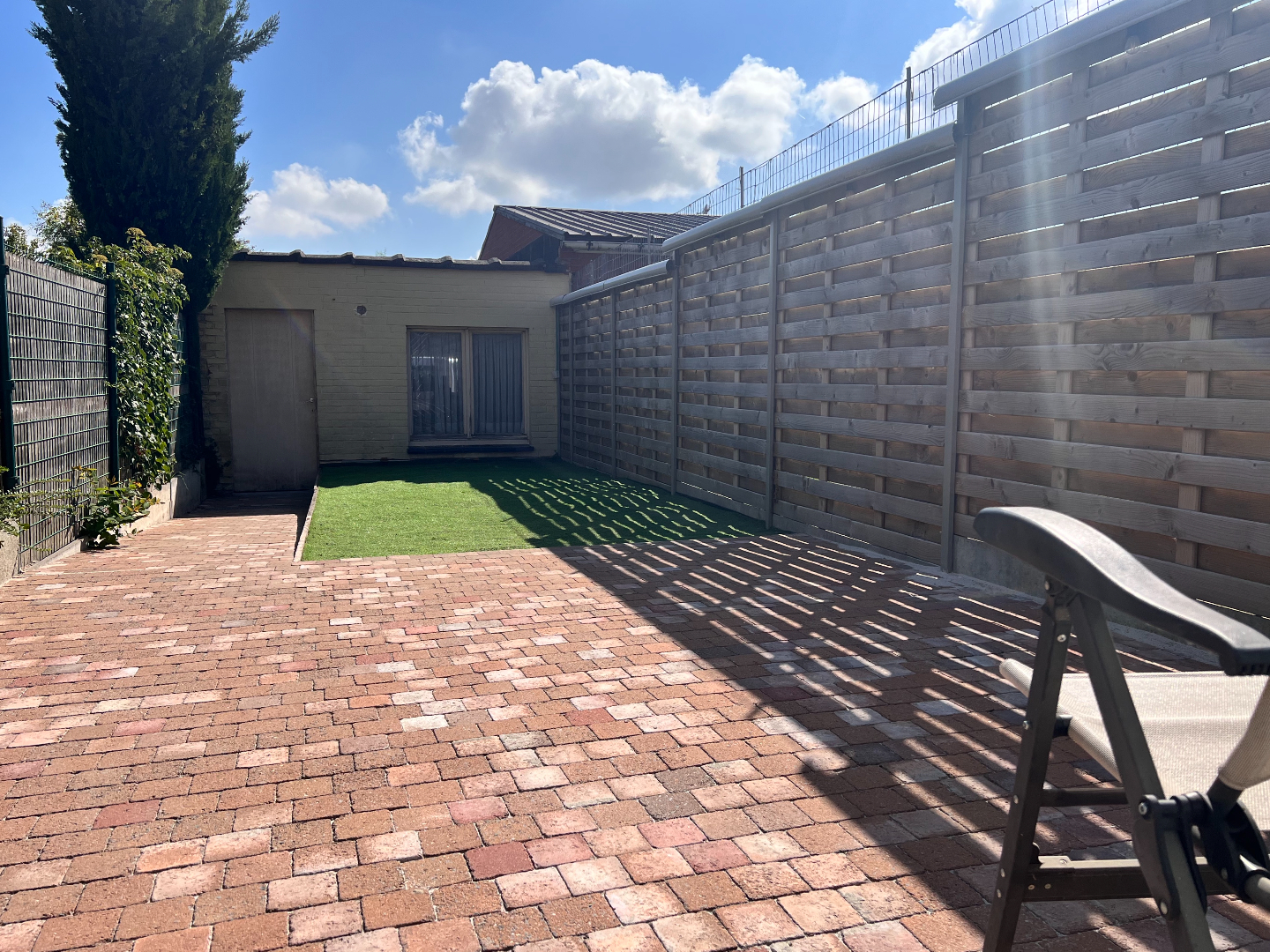 Zonnig terras en onderhoudsvriendelijke tuin met toegang tot de garage die 23m2 groot is en makkelijk te bereiken via een weg achteraan.