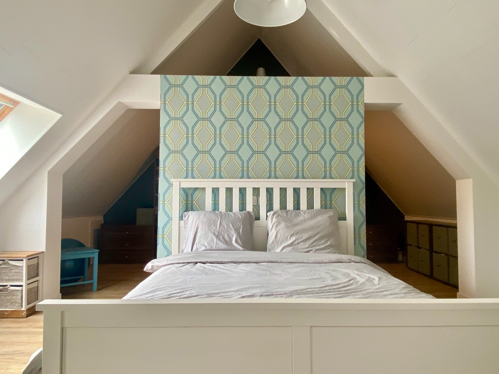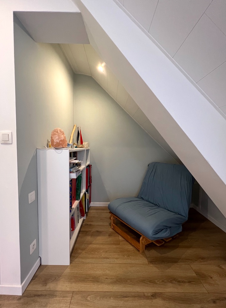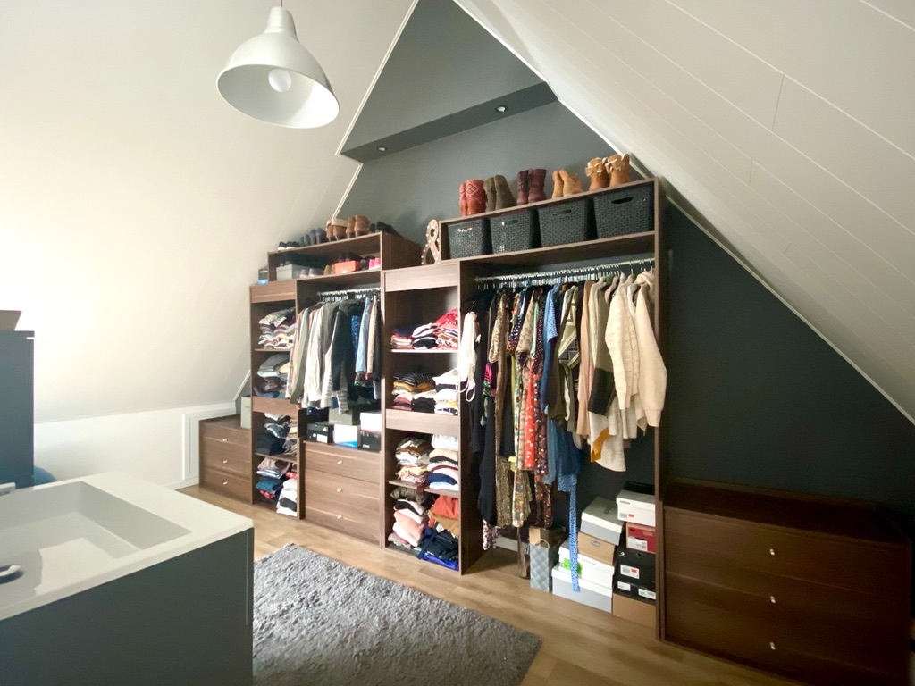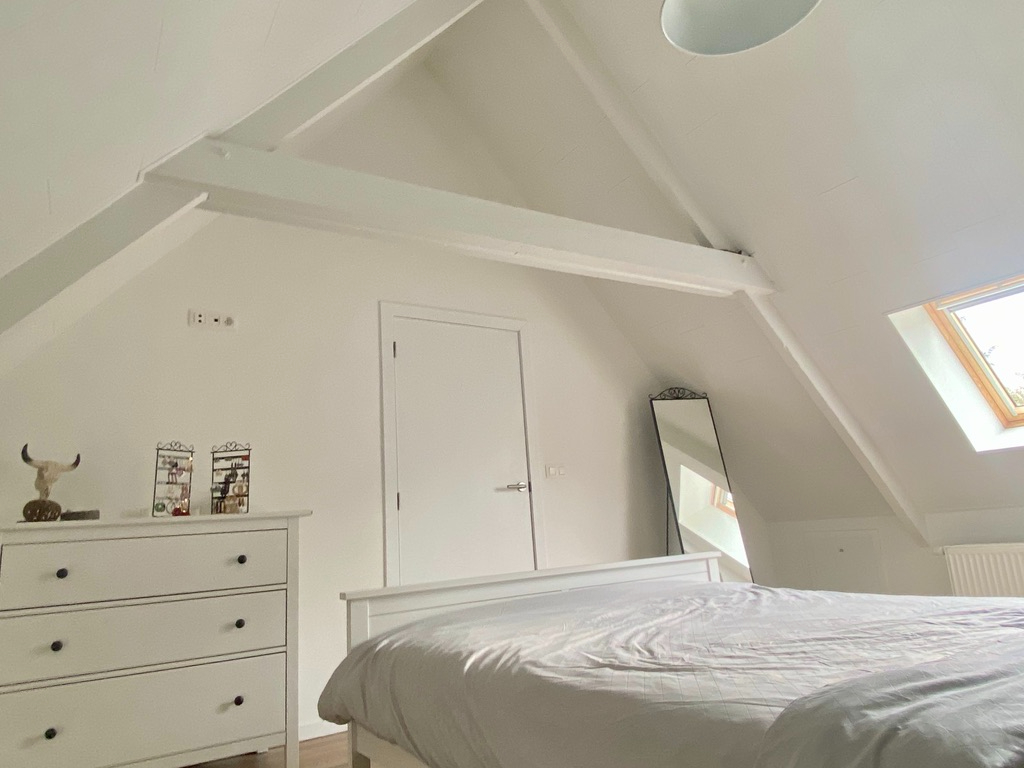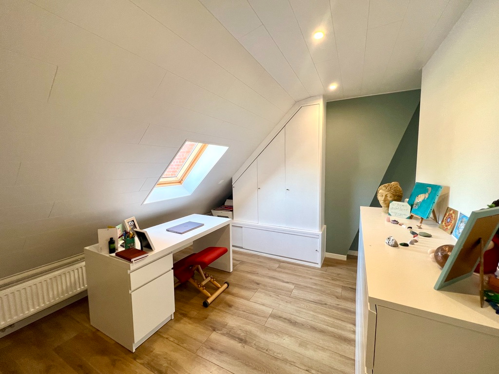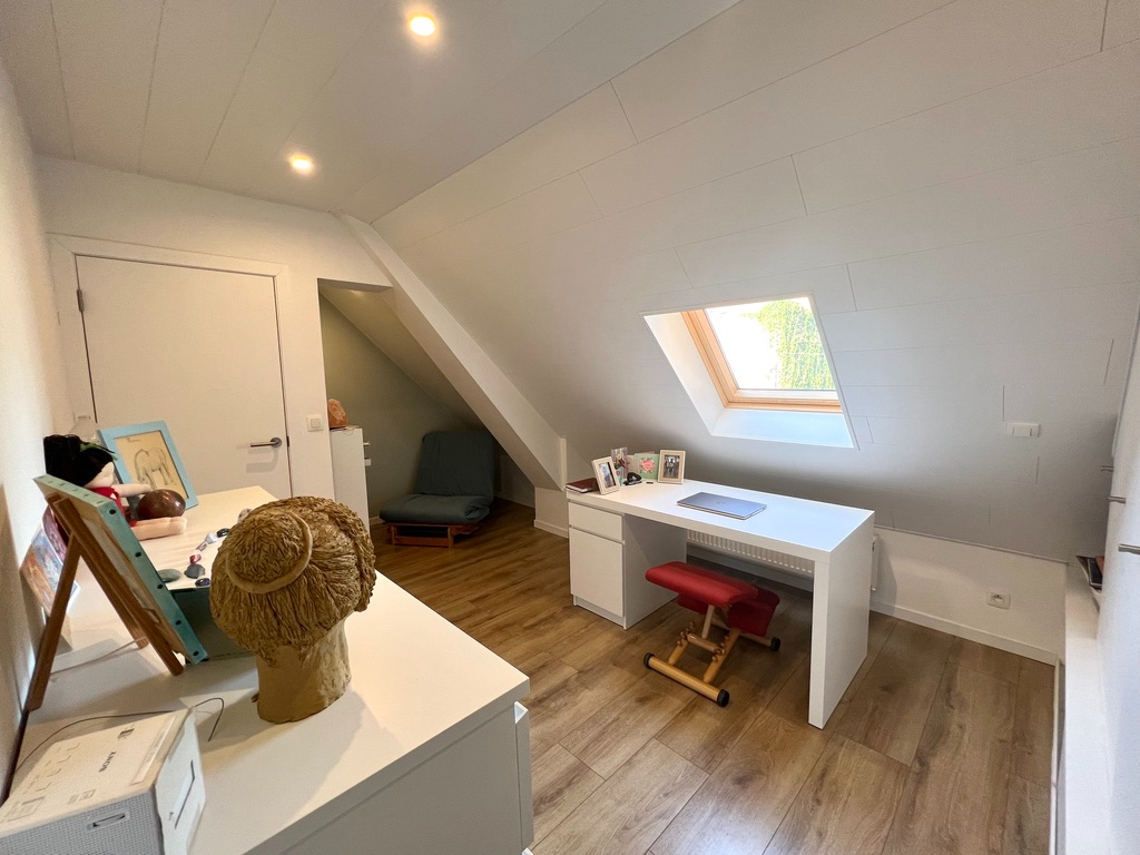 Op het eerste verdiep tref je er een toilet aan, een knappe slaapkamer met dressing en wasmeubel, een kinderslaapkamer en een bureauruimte.