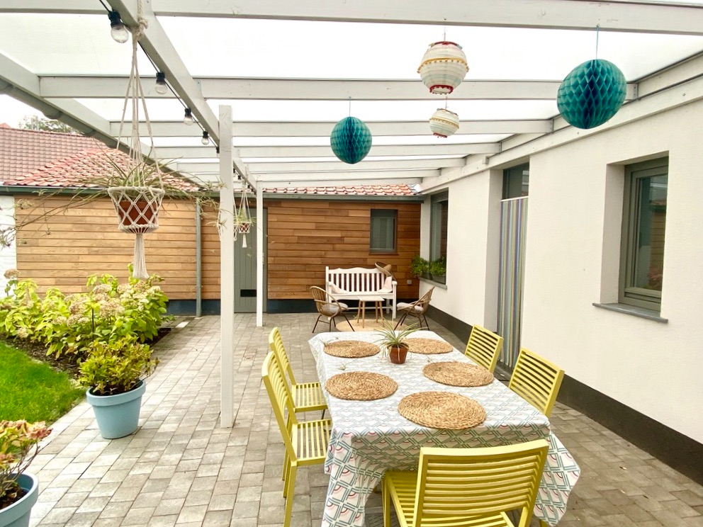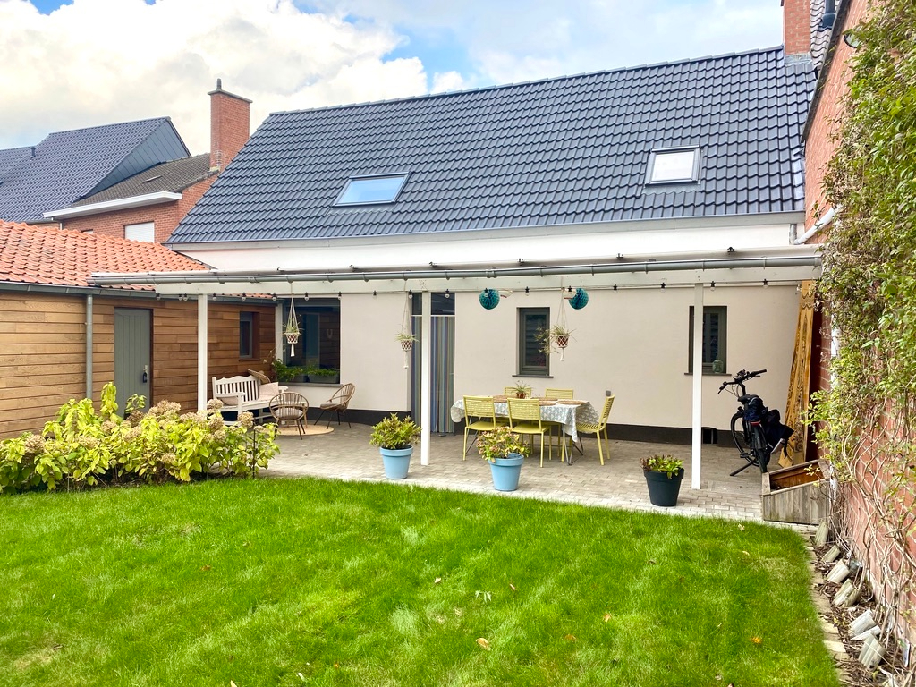 De tuin is volledig omheind en voorzien van een overdekt terras. Berging en technische ruimte alsook een kleine carport voor de fietsen vooraan het gebouw.