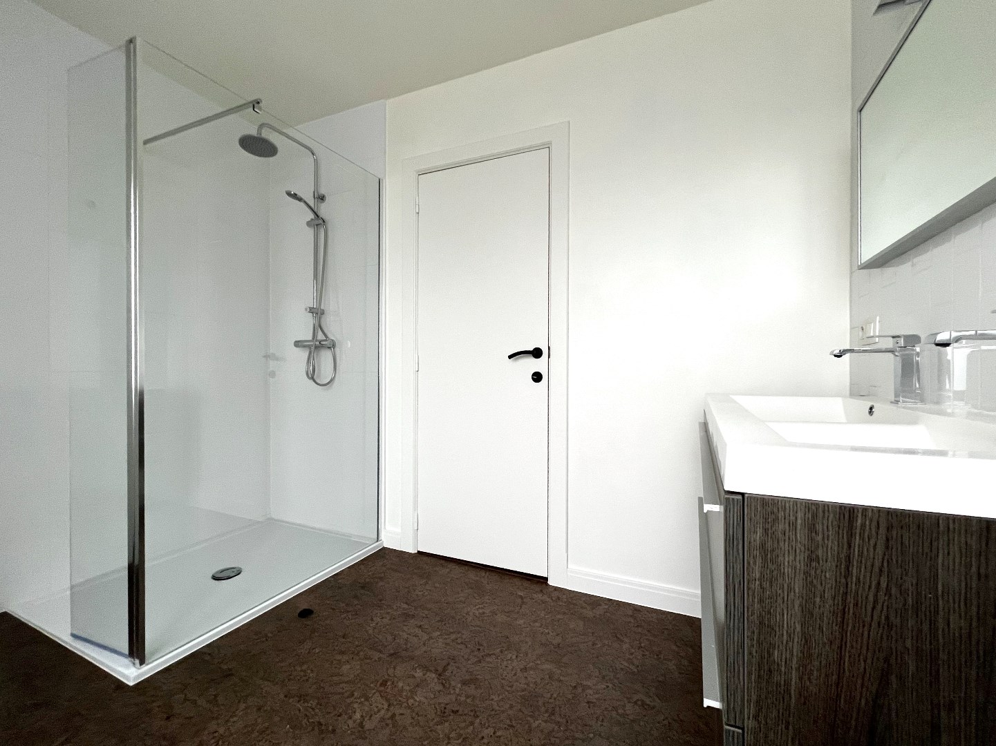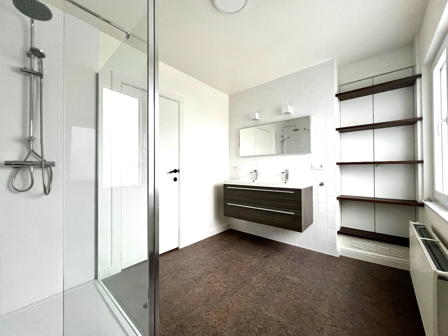 Op het eerste verdiep ruime slaapkamer, badkamer met inloopdouche en dubbele wastafel, apart toilet.