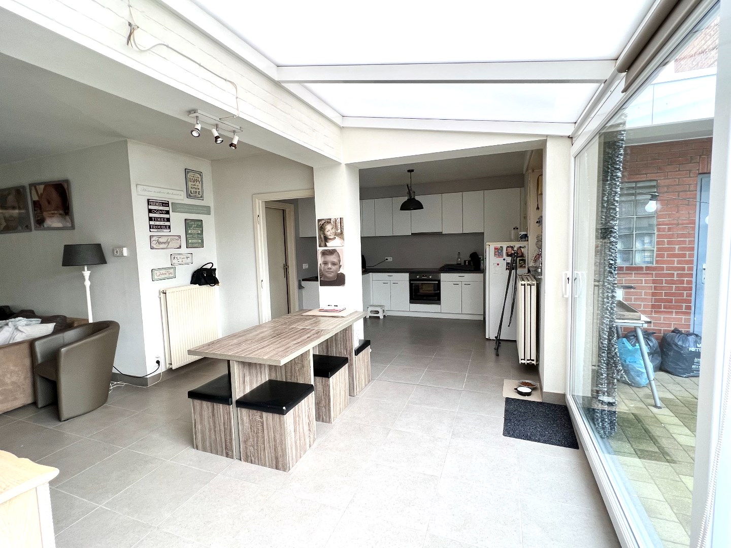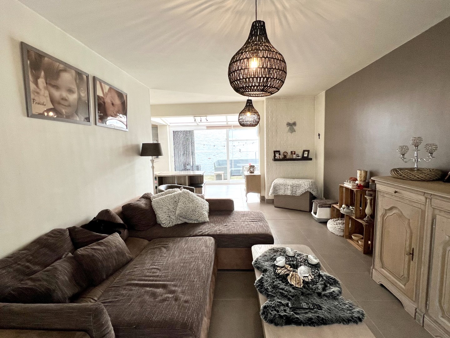 Binnenkomen in de inkomhal, grote leefruimte met aanpalend de eetruimte en open keuken. Vanuit de leefruimte en eetruimte heb je zicht en toegang tot het terras.