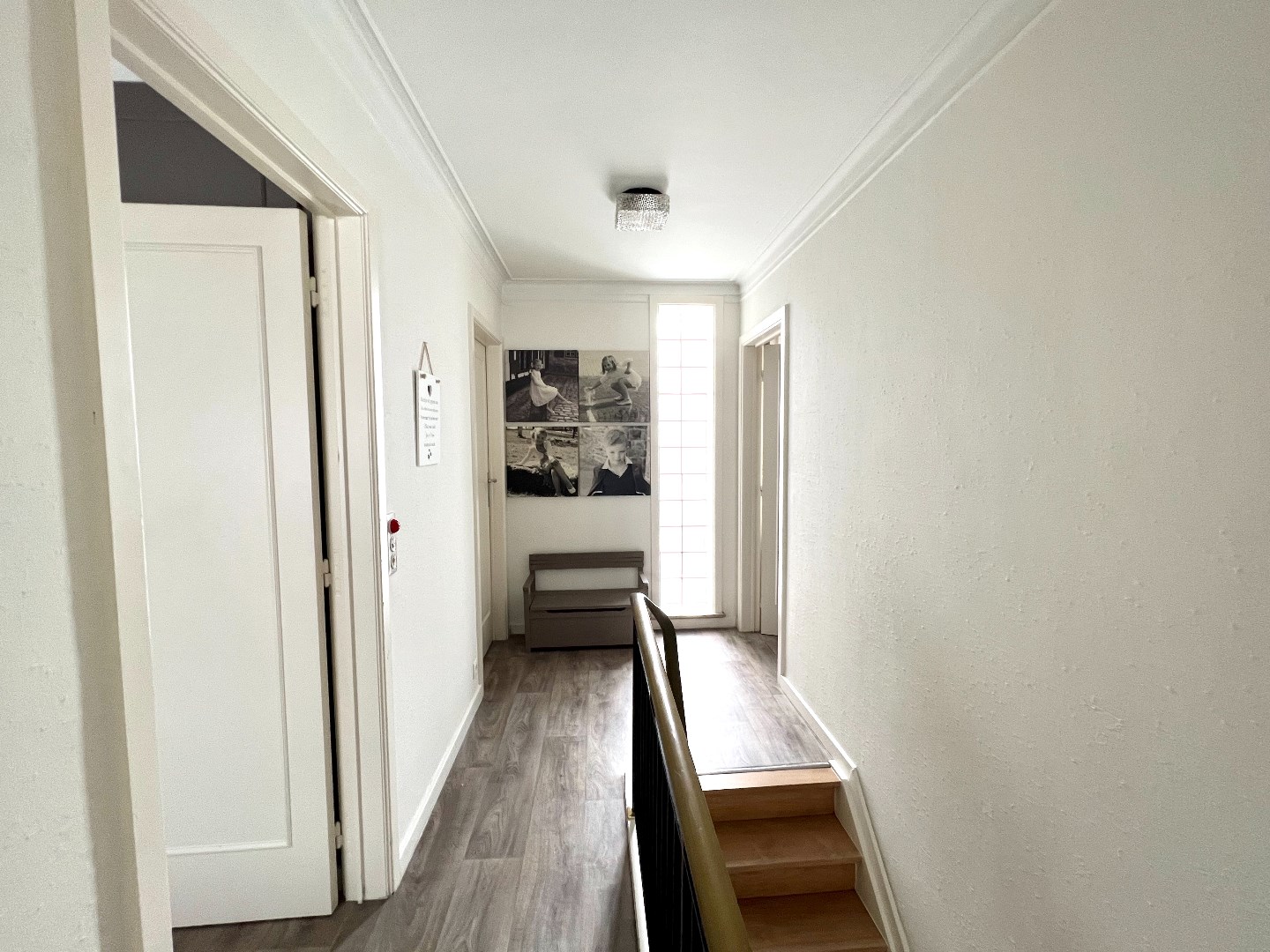 Op het verdiep drie grote slaapkamers en een badkamer met toilet-douche en wasmeubel.