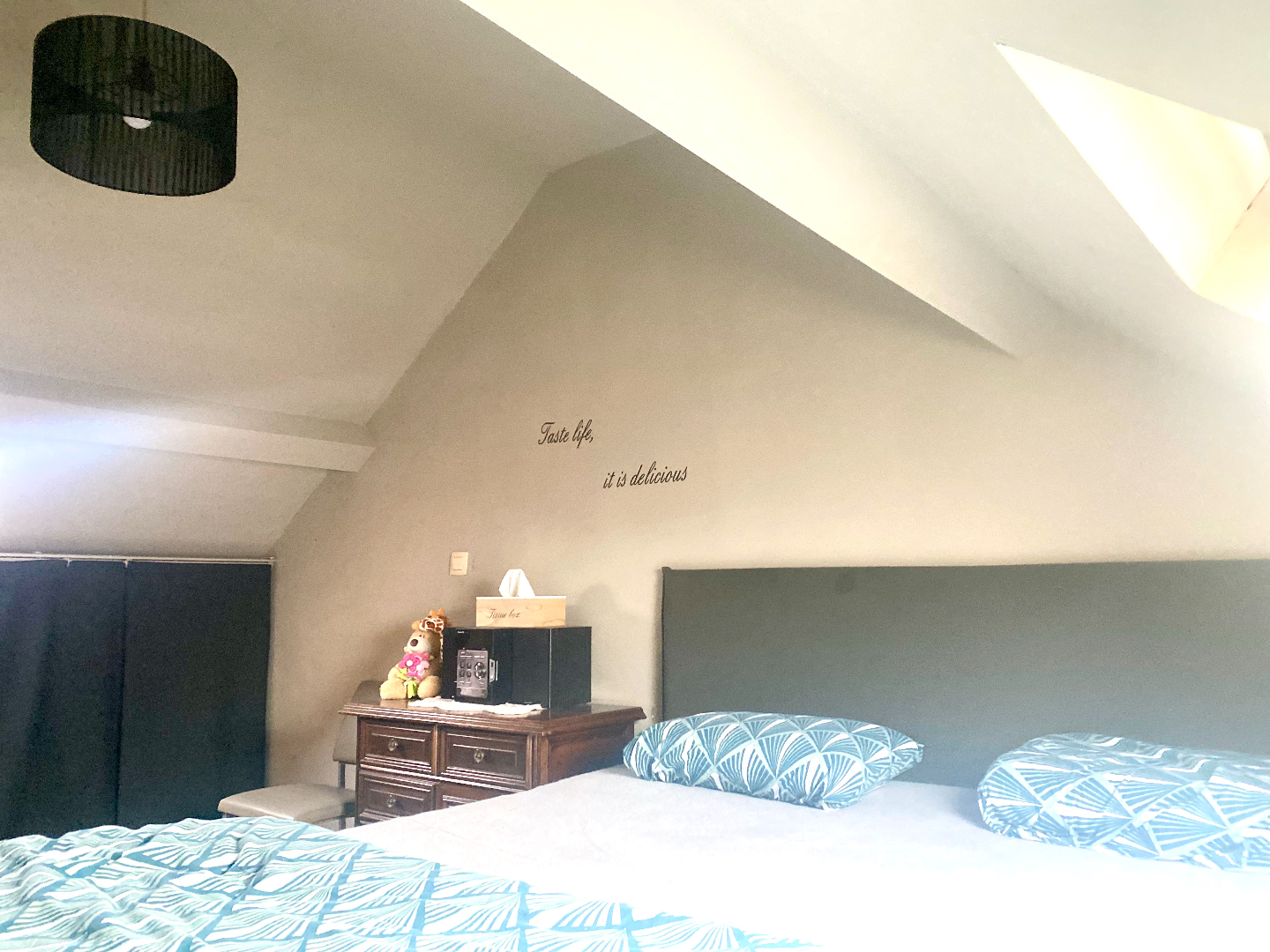 Vanuit de badkamer via de trap kom je in de nok van het dak waar de slaapkamer is ingericht.