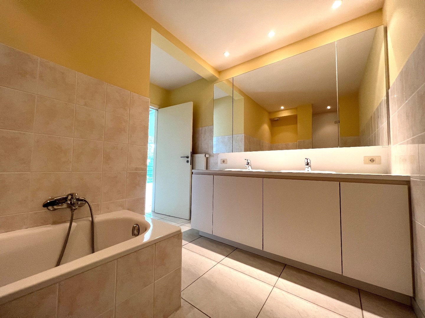 Badkamer is uitgerust met een dubbele wastafel, douche en ligbad.
