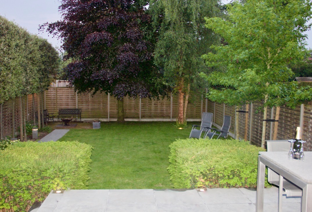 De zuidgerichte tuin met fraaie eikenbomen ligt er heel verzorgd bij, volledig omheind met een terras zowel aan de keuken als aan de leefruimte.