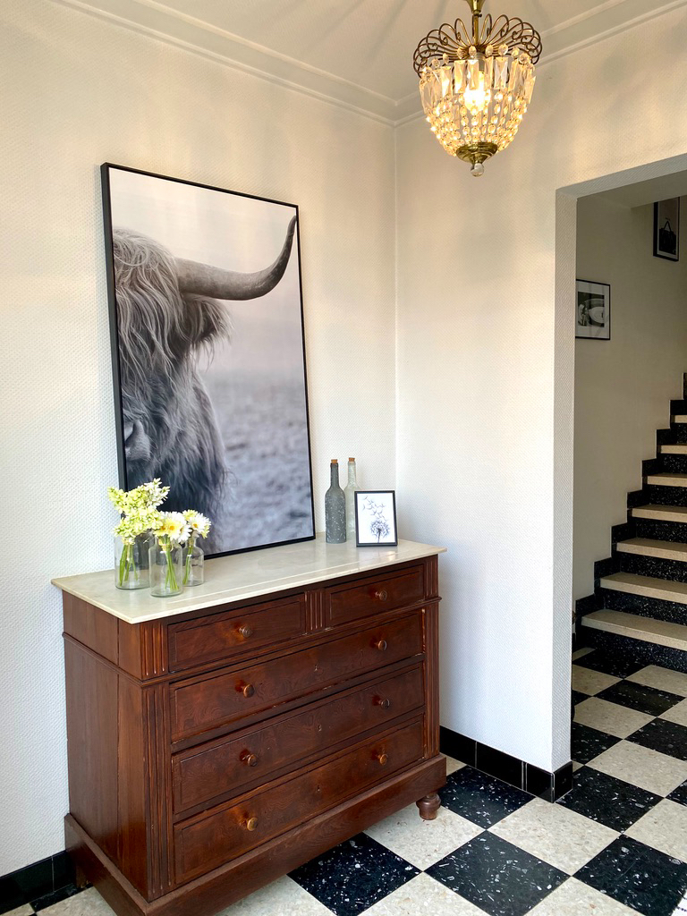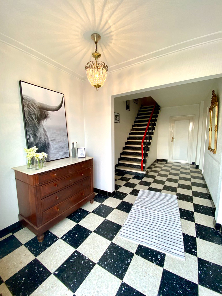 - prachtige inkomhal met toegang naar de bijkeuken en apart toilet, garage en hobbyruimte en groot zonne-terras.