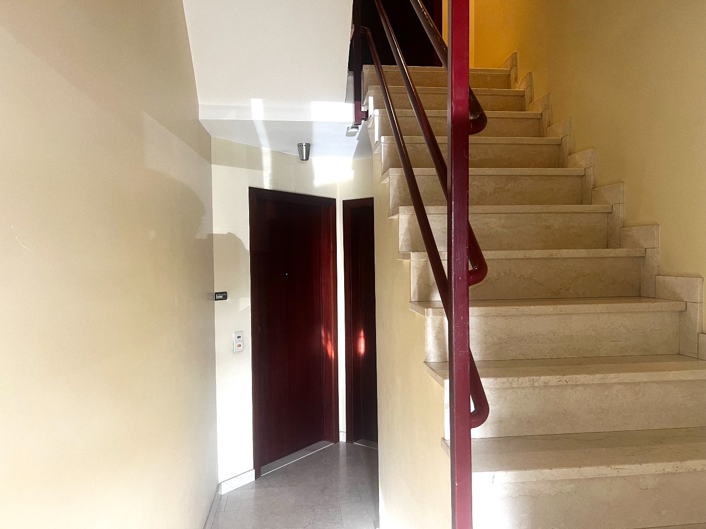 Dit gezellige duplexappartement op de 2e en 3e verdieping biedt een lichte leefruimte met keukenhoek, apart toilet met vestiarekast en een zonnig balkon. Boven 2 slaapkamers, badkamer met ligbad - wasmeubel en toilet. Extra pluspunten zijn de kelderberging en de ruime garage met watervoorziening en elektriciteit.
