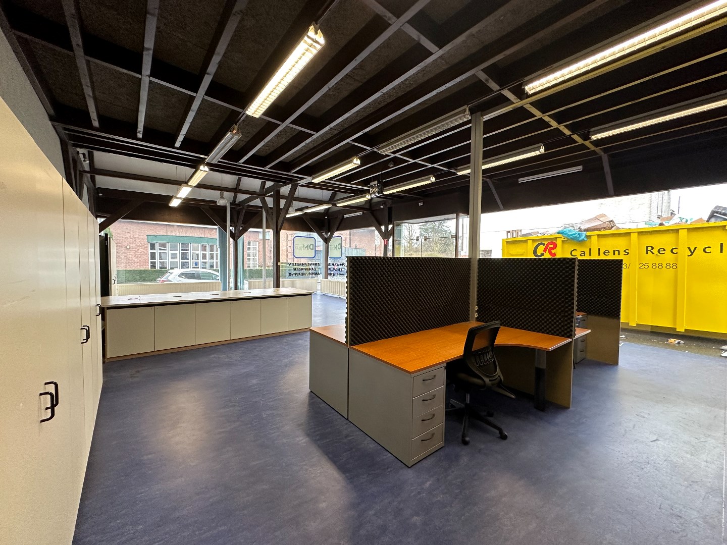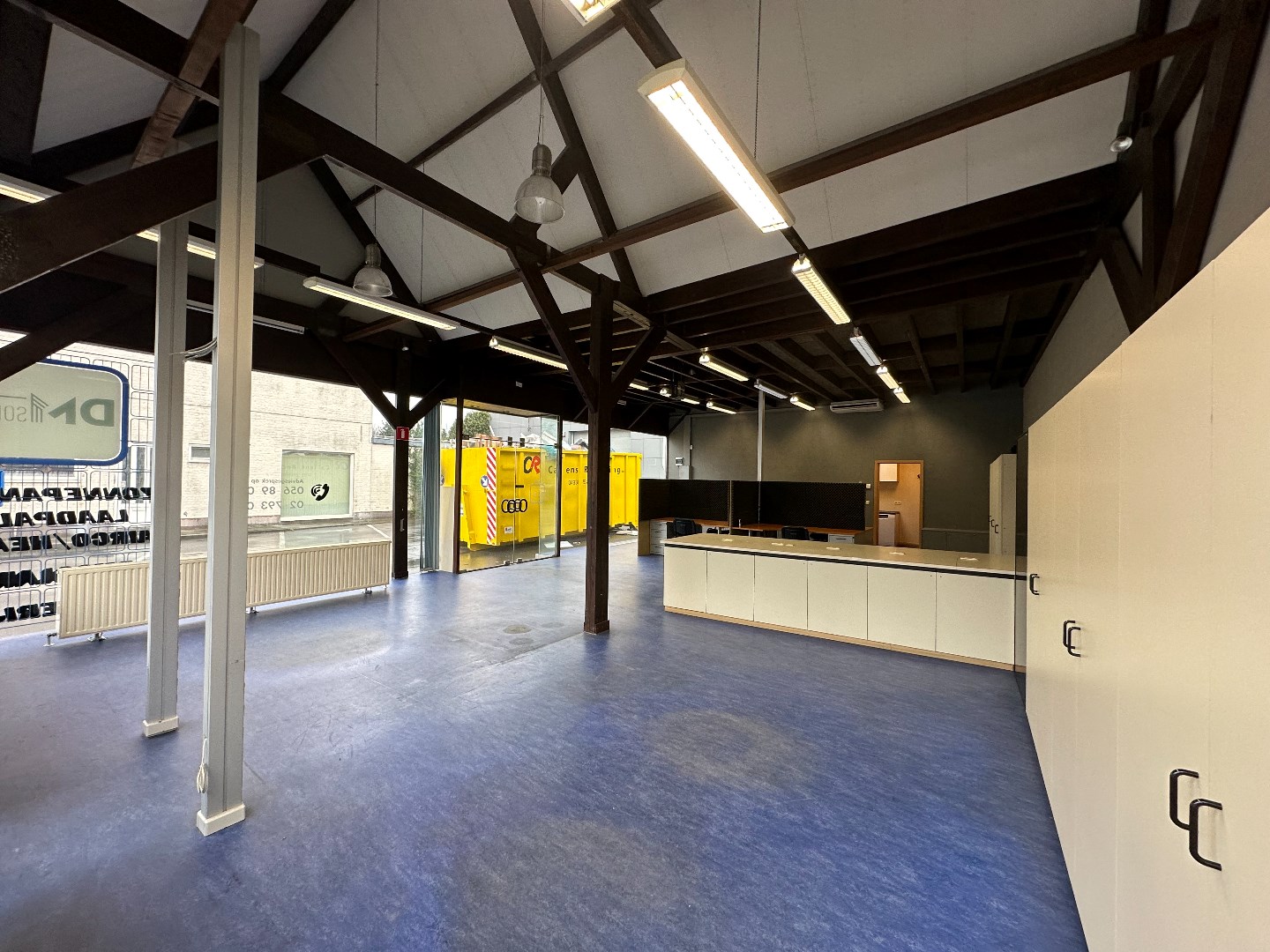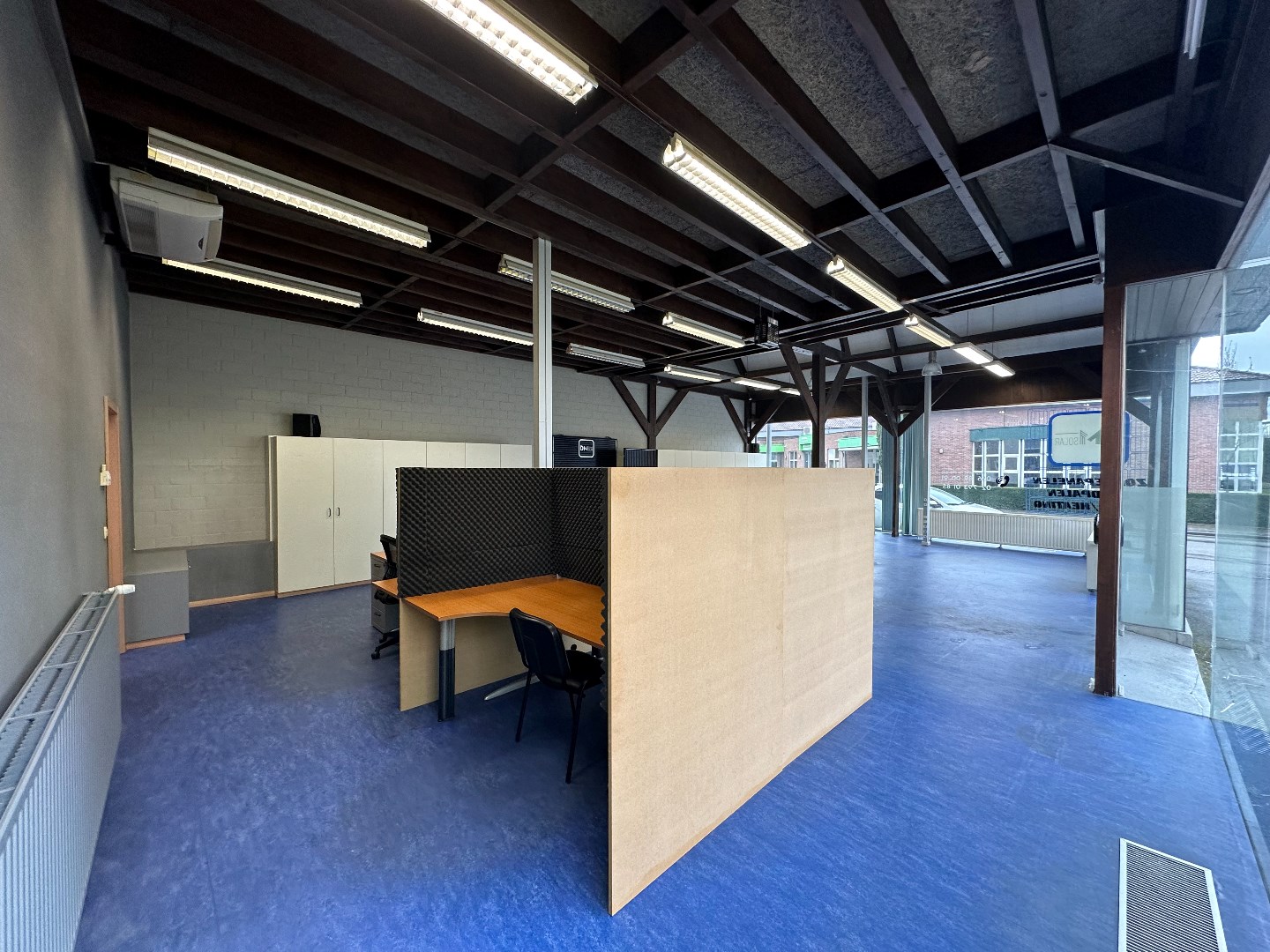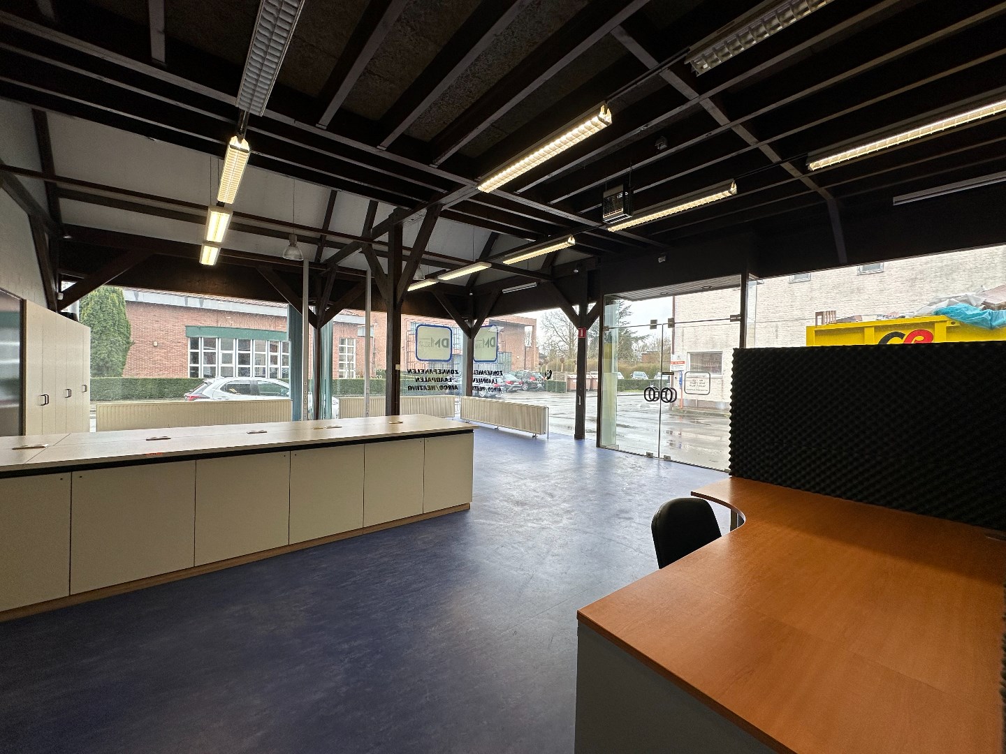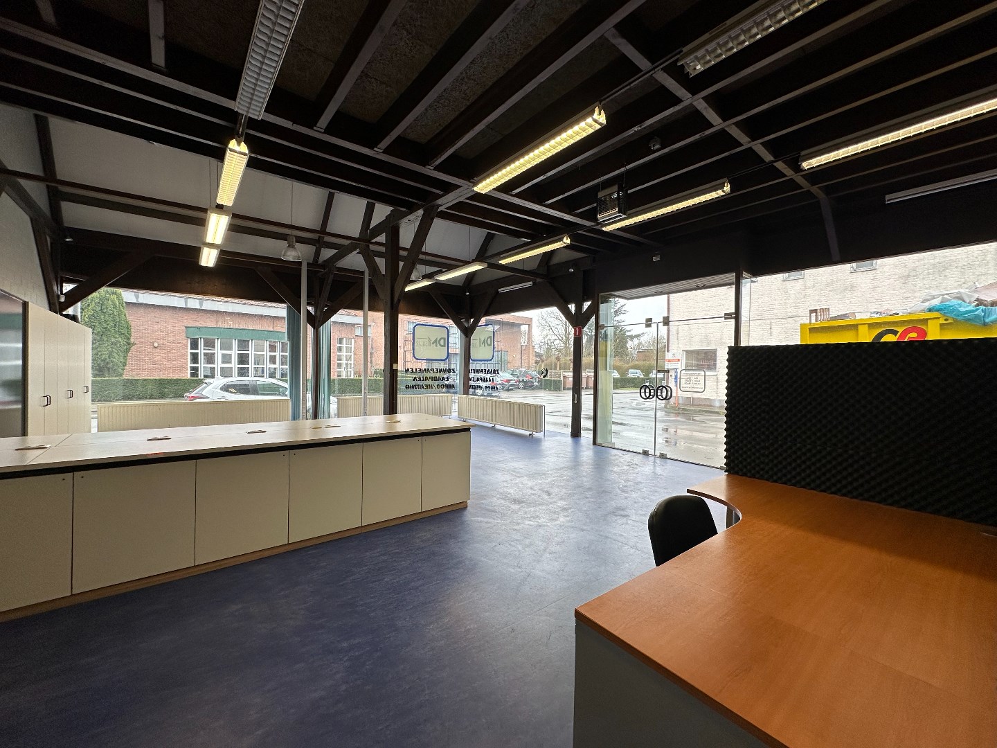 Kantoor met grote etalageramen voor maximum visibiliteit, keukentje en toilet. (vernieuwd dak, niet geïsoleerd) Vloeroppervlakte ongeveer 116m2