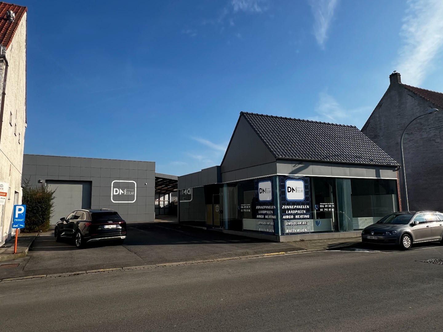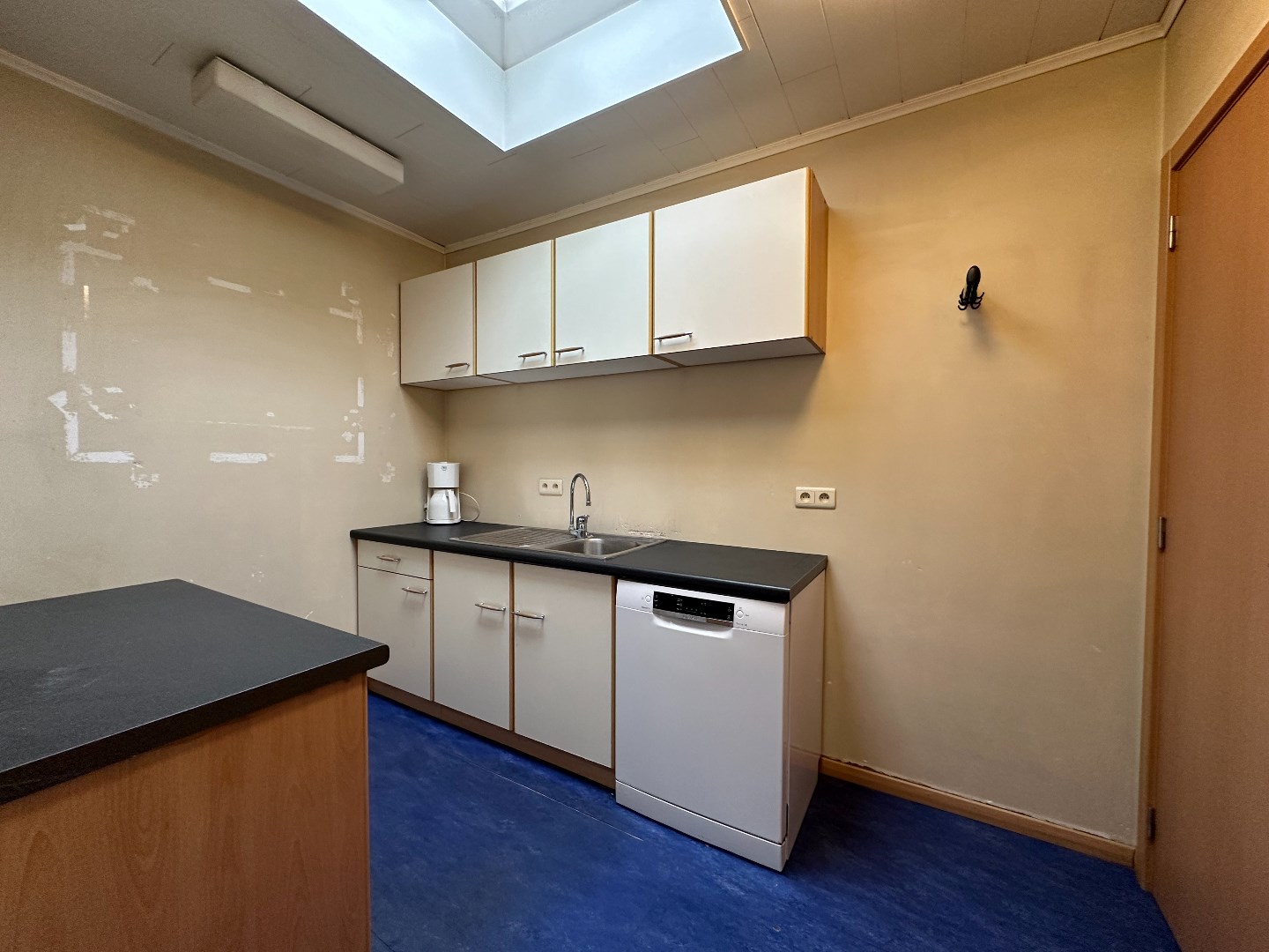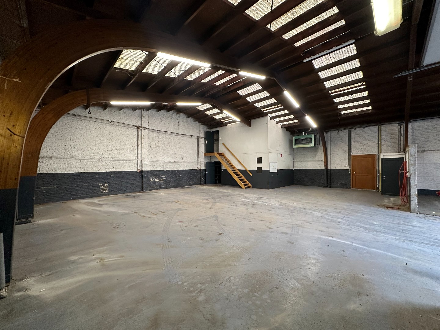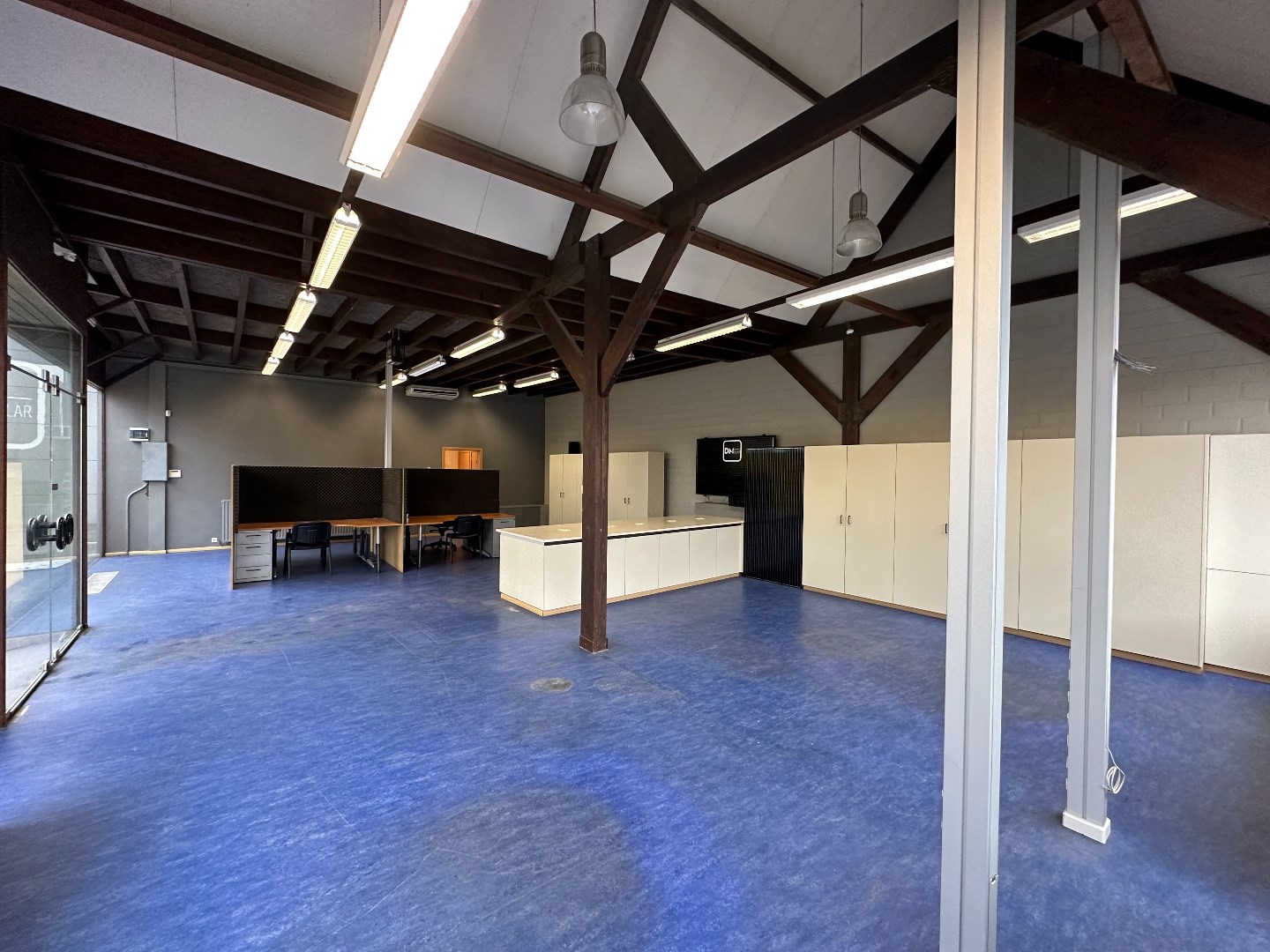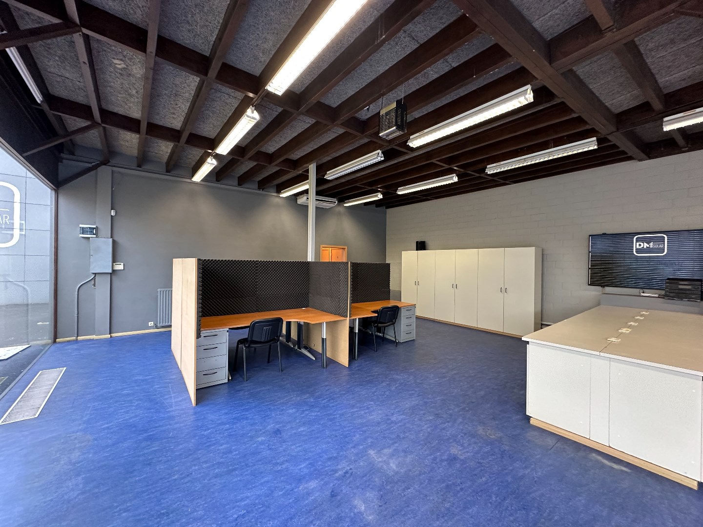 Kantoor met grote etalageramen voor maximum visibiliteit, keukentje en toilet. (vernieuwd dak, niet geïsoleerd) Vloeroppervlakte ongeveer 116m2