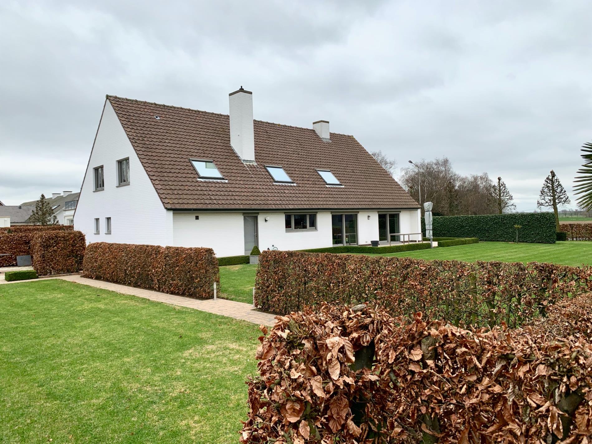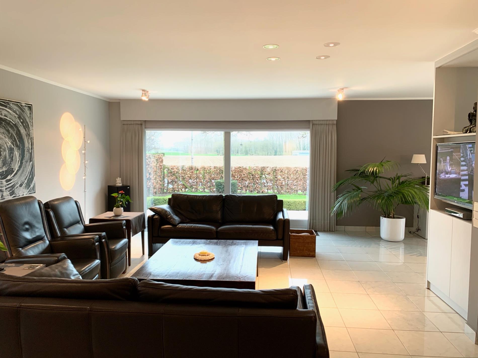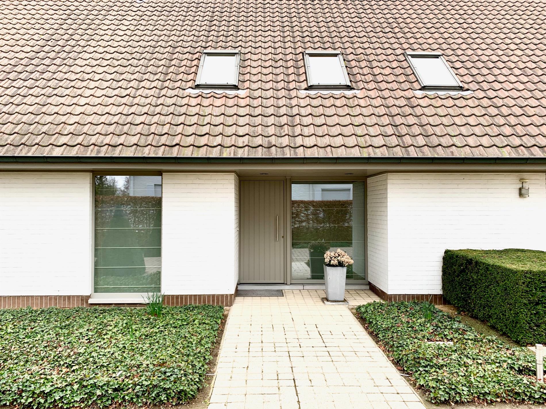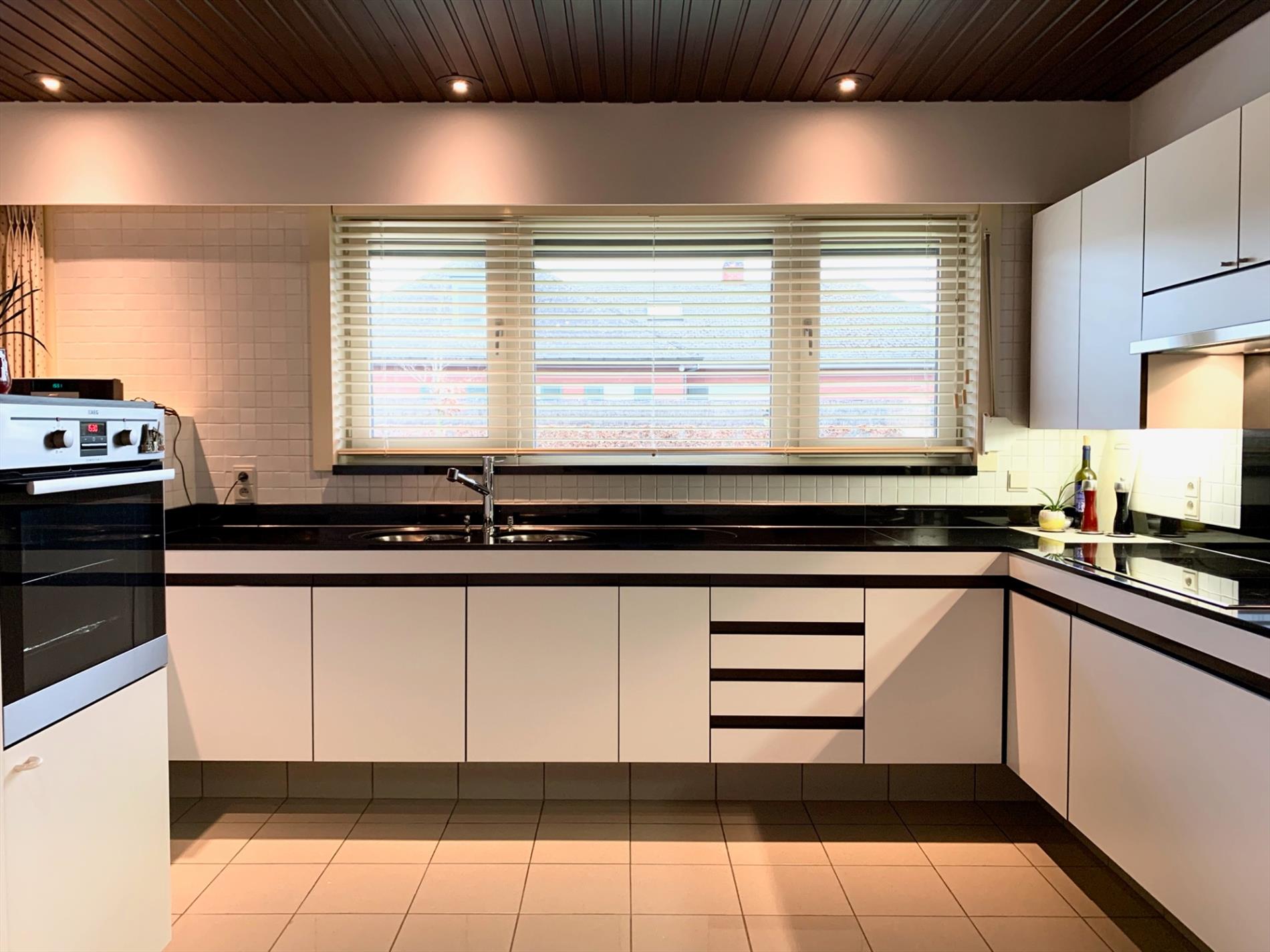 Glvl.: Inkomhal met trapzaal, vestiaire en gastentoilet, grote leefruimte en aansluitende eetplaats, grote ingerichte leefkeuken met aparte ontbijthoek, ruime wasplaats, koele berging en dubbele garage.