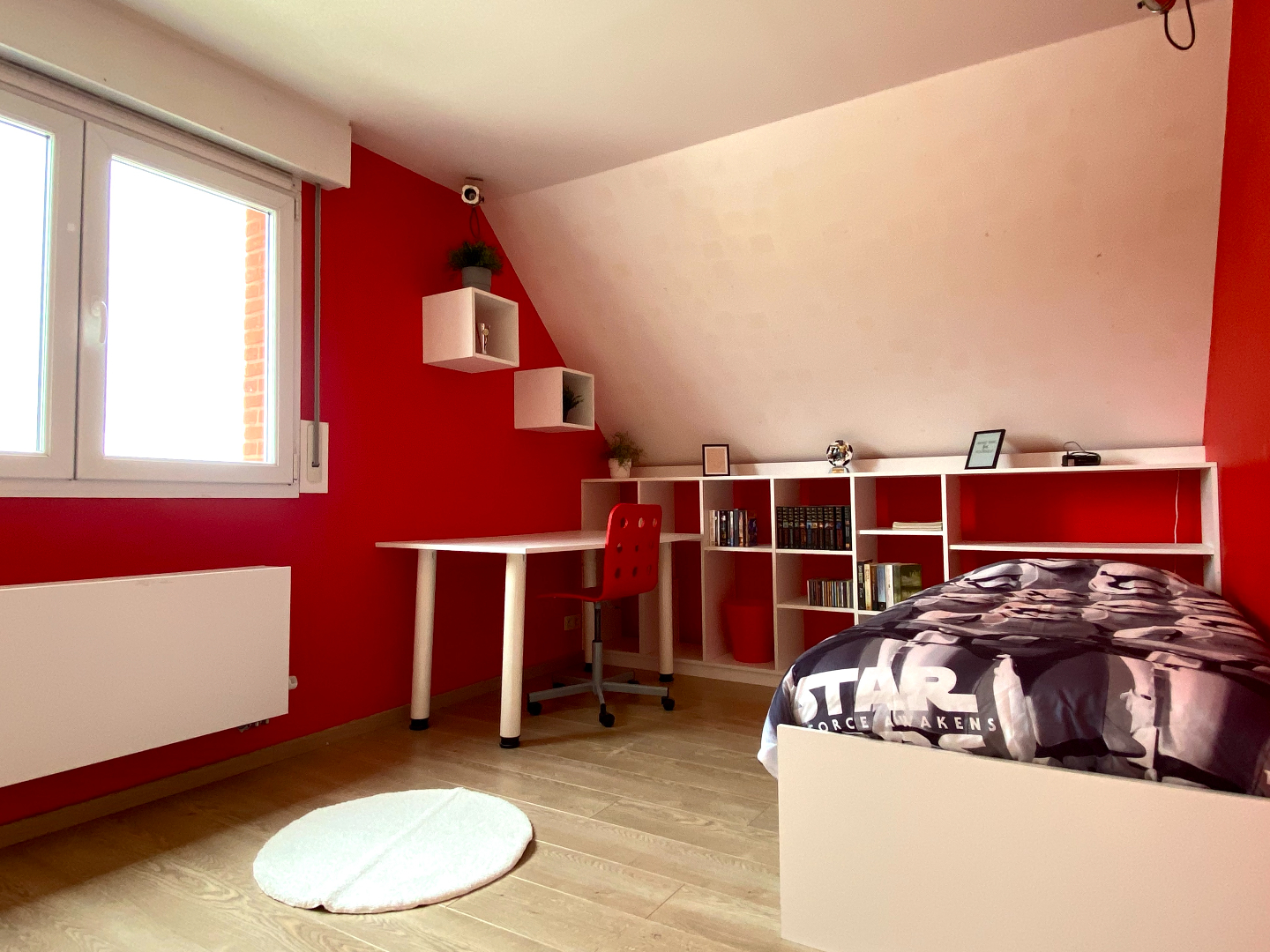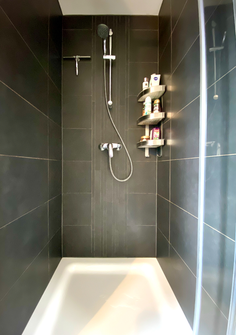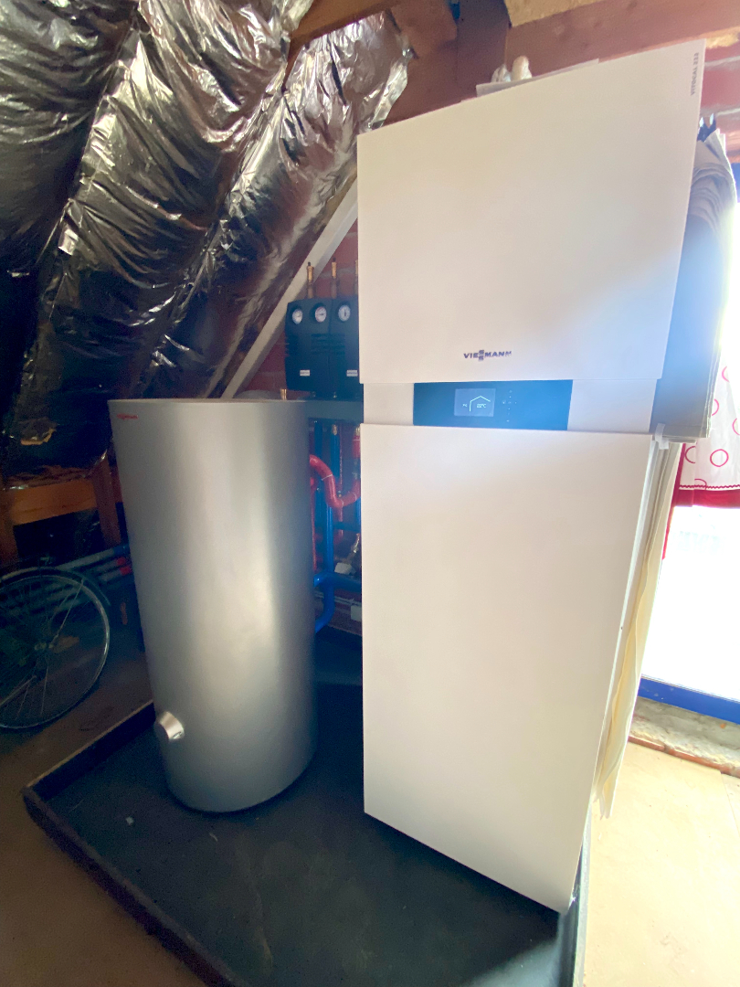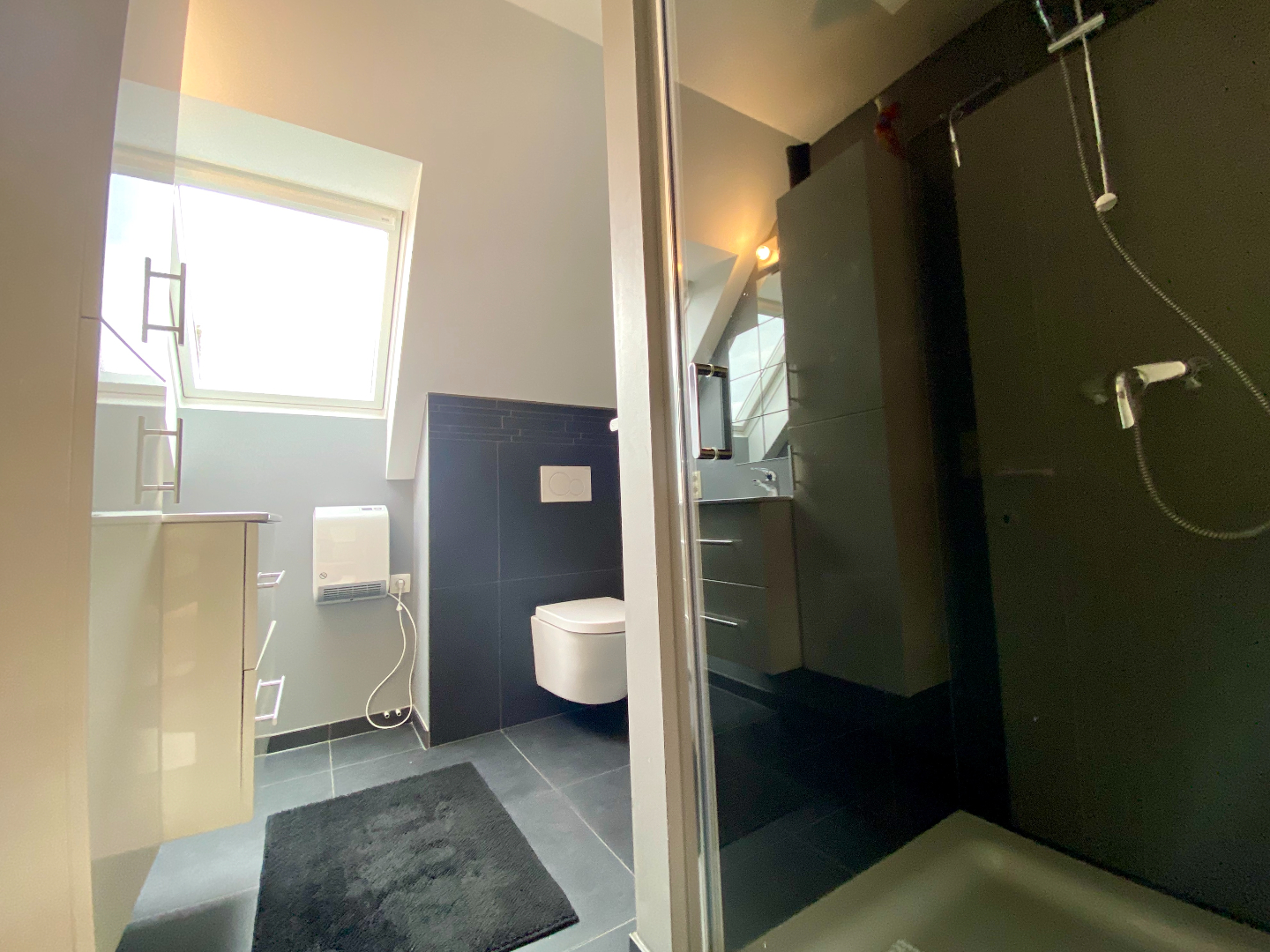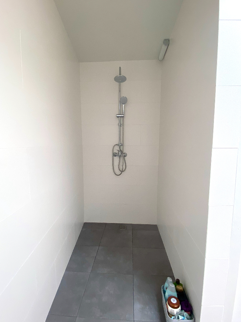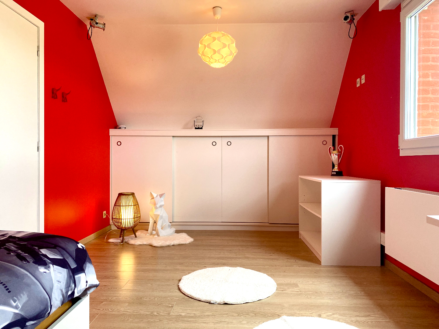 Op het verdiep 3 slaapkamers, een badkamer met douche - toilet en wastafel, dit was het heerlijke domein van de jongens. Een grote zolder om gerief op te bergen (met 6 mensen heb je nood aan ruimte :-). Hier vind je er de lucht-water warmtepomp terug alsook de installatie van de vloerverwarming (leidingen moeten nog worden gelegd) van het gelijkvloers en de omvormer van de zonnepanelen.