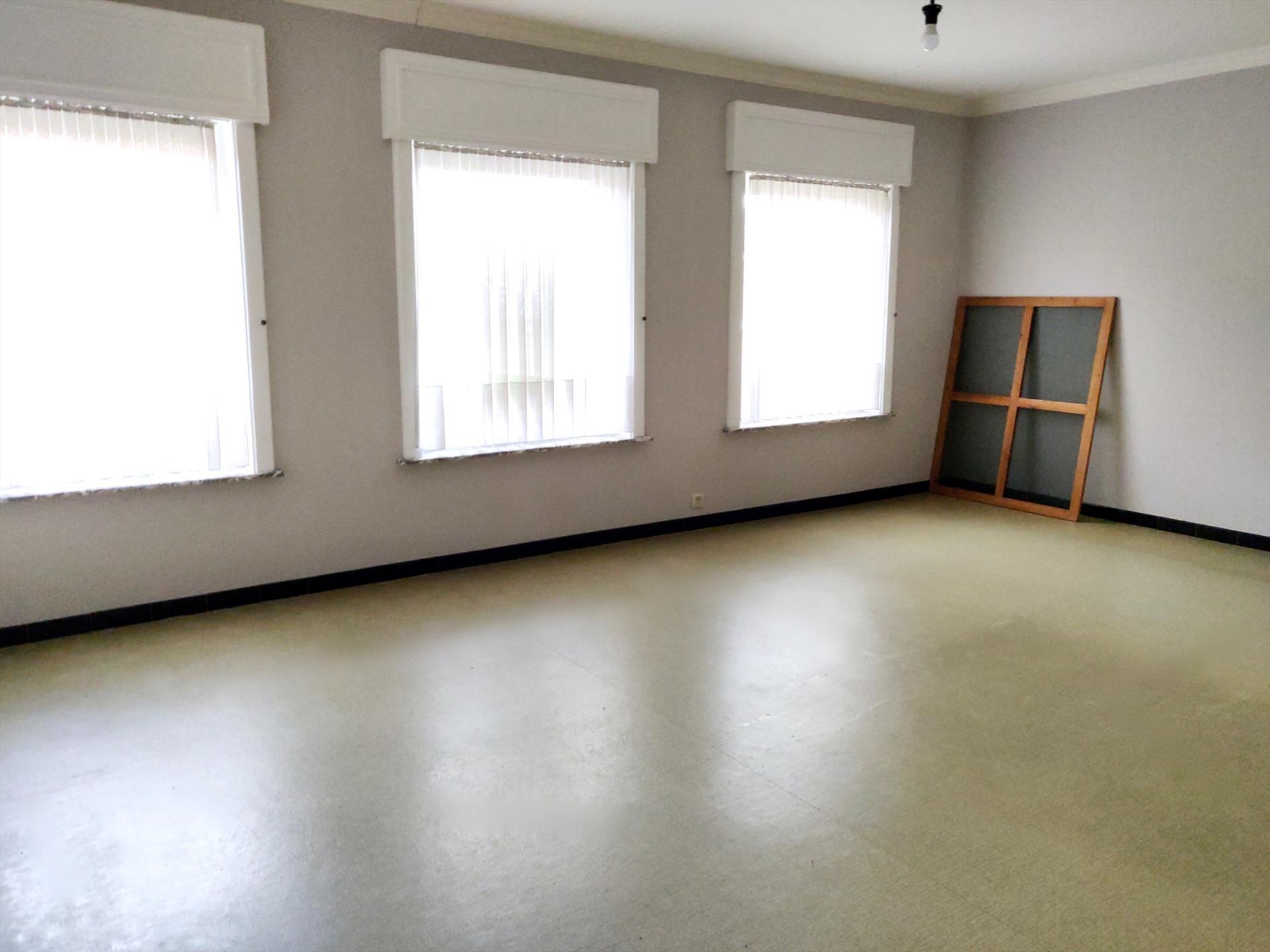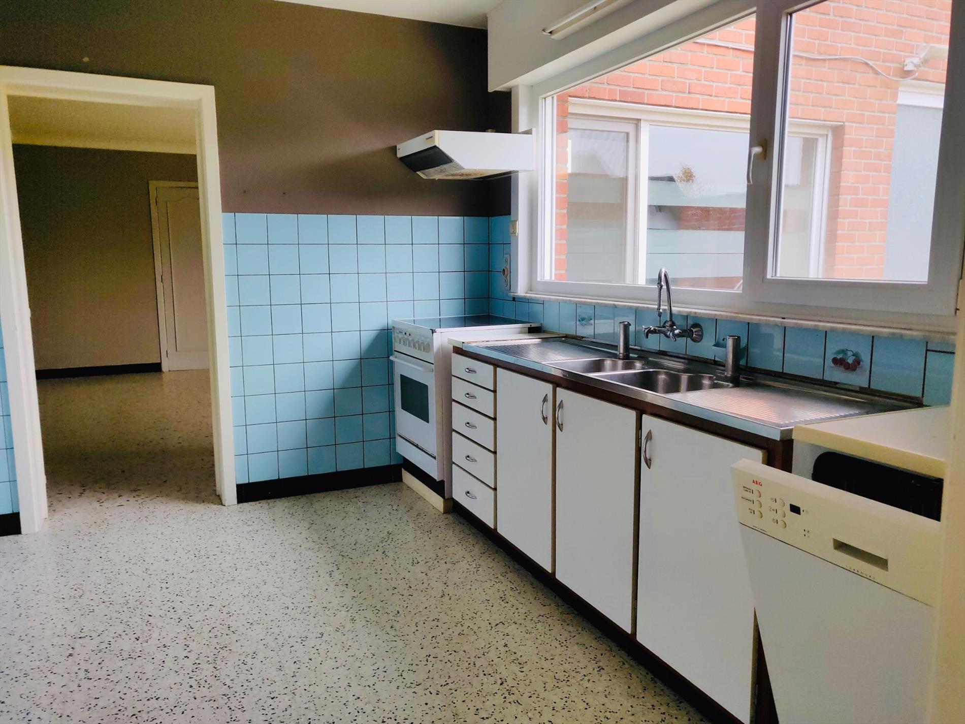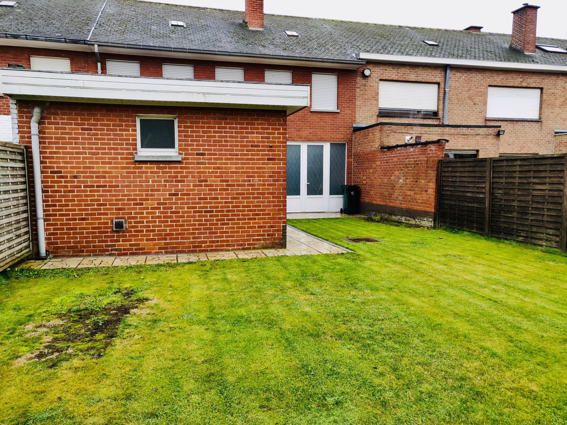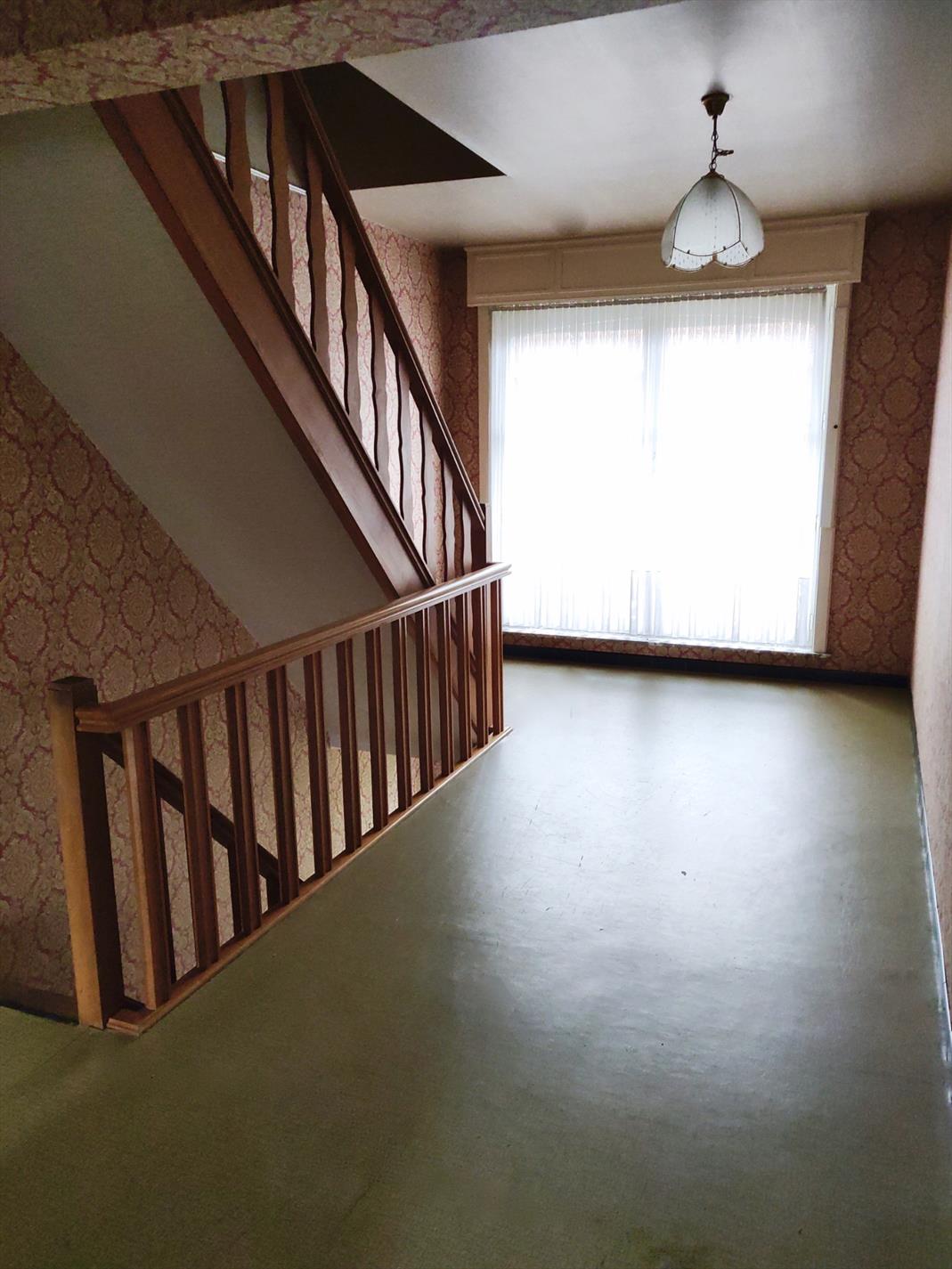 Deze kloeke woning omvat een inkomhal, leefruimte in L-opstelling, gesloten keuken met toegang tot de tuin, apart toilet en berging.