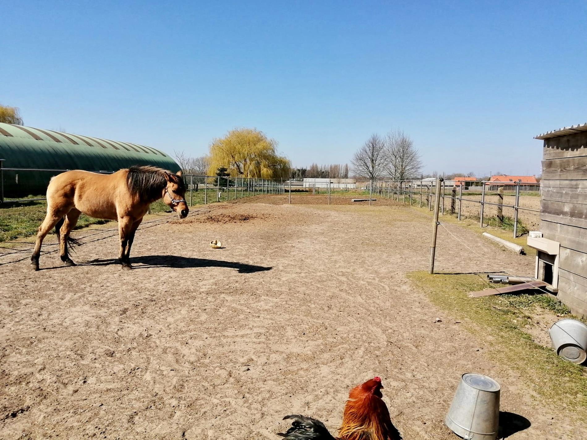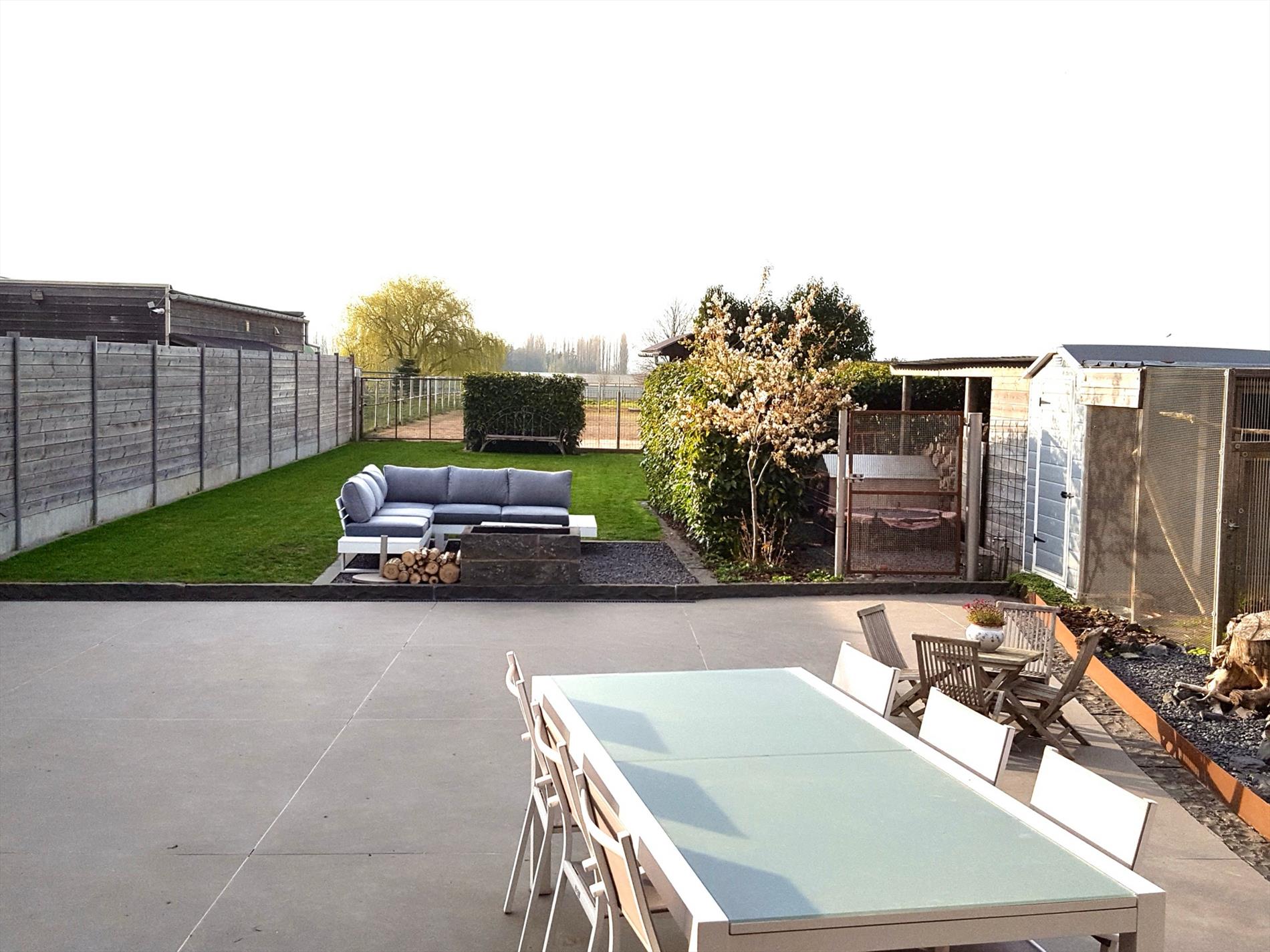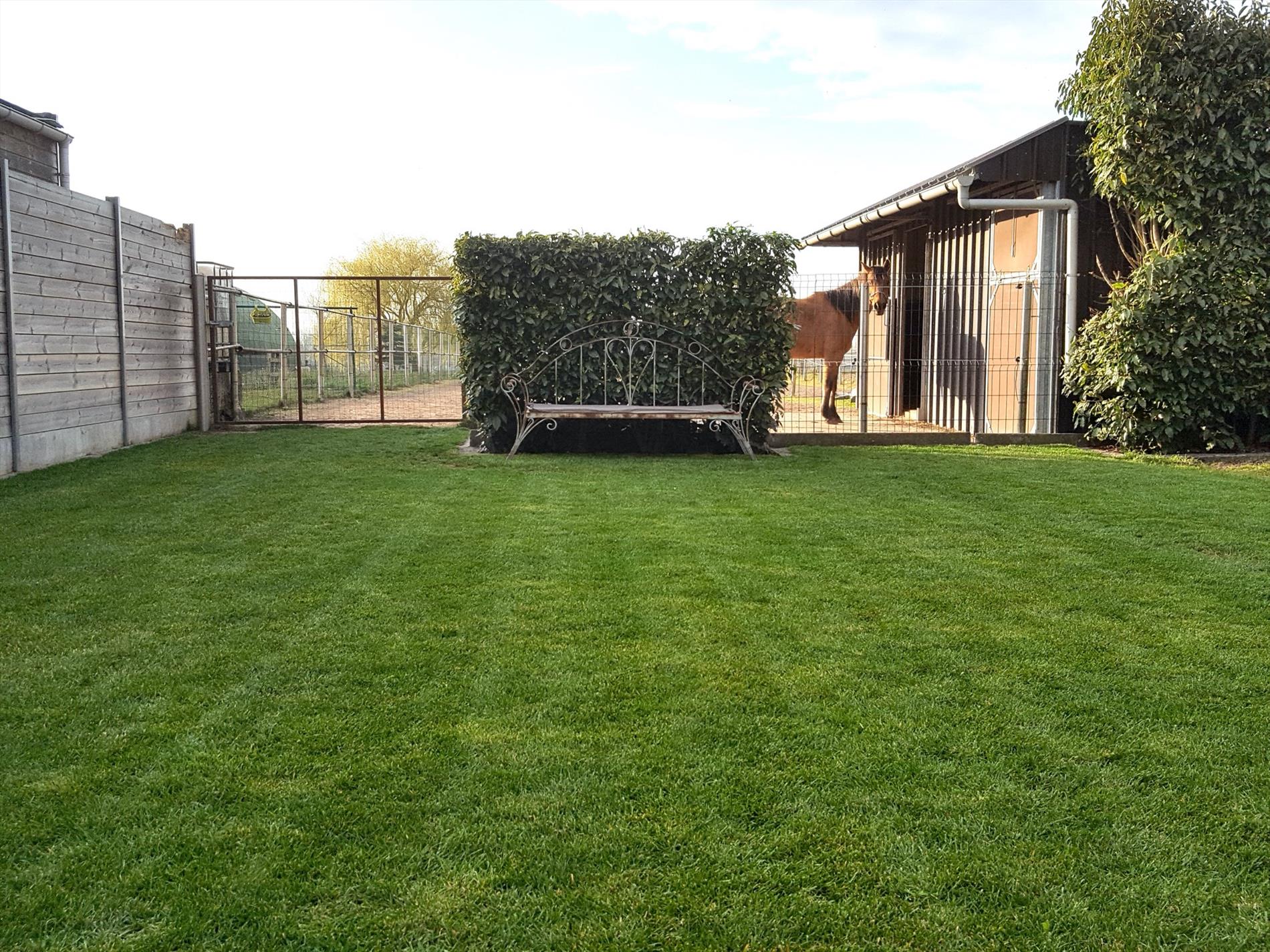 De tuin is in één woord zalig! Met een terras van ongeveer 72m2 gepolierde beton heb je hier een uitkijk over de velden, achter het gazon is er de volledig omheinde (inox) weide met de dubbele verplaatsbare paardenbox voorzien van licht en stopcontacten.