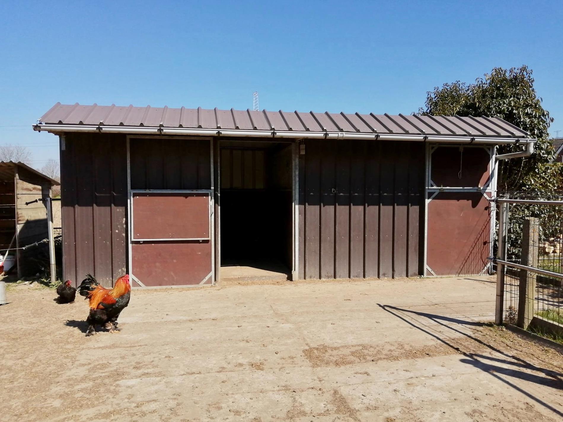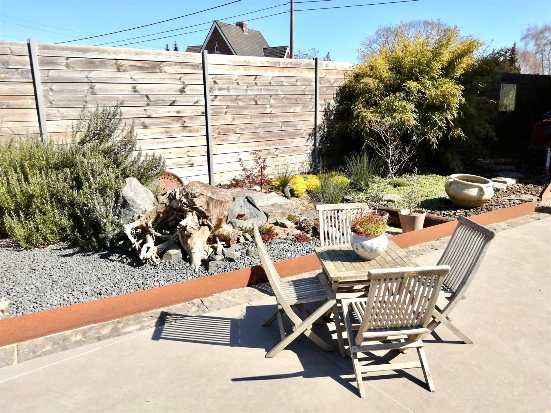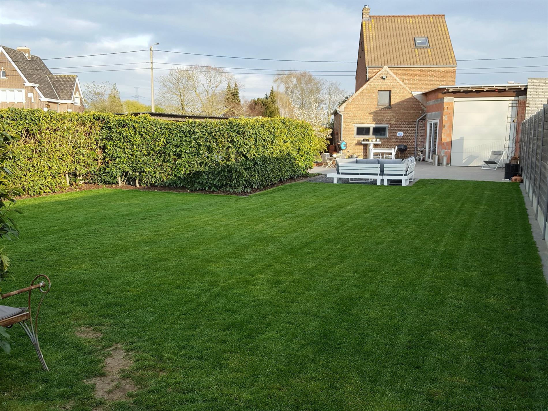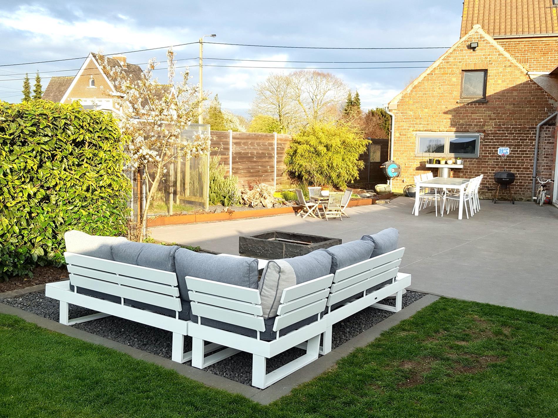 De tuin is in één woord zalig! Met een terras van ongeveer 72m2 gepolierde beton heb je hier een uitkijk over de velden, achter het gazon is er de volledig omheinde (inox) weide met de dubbele verplaatsbare paardenbox voorzien van licht en stopcontacten.