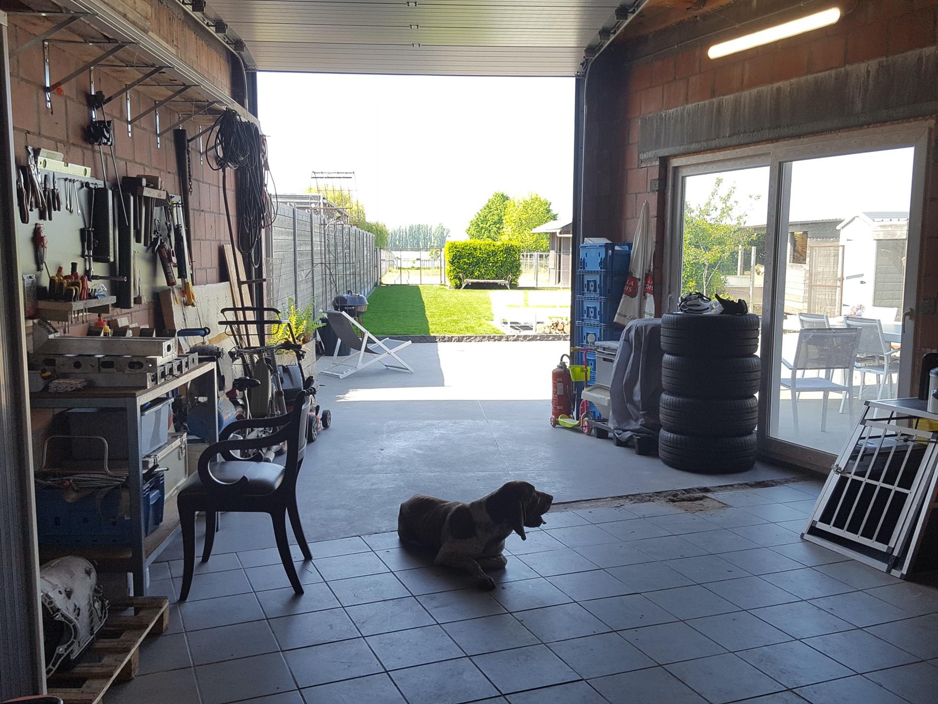 De grote garage bevat twee elektrische sectionale poorten die dus ook toegang geven tot de grote tuin.