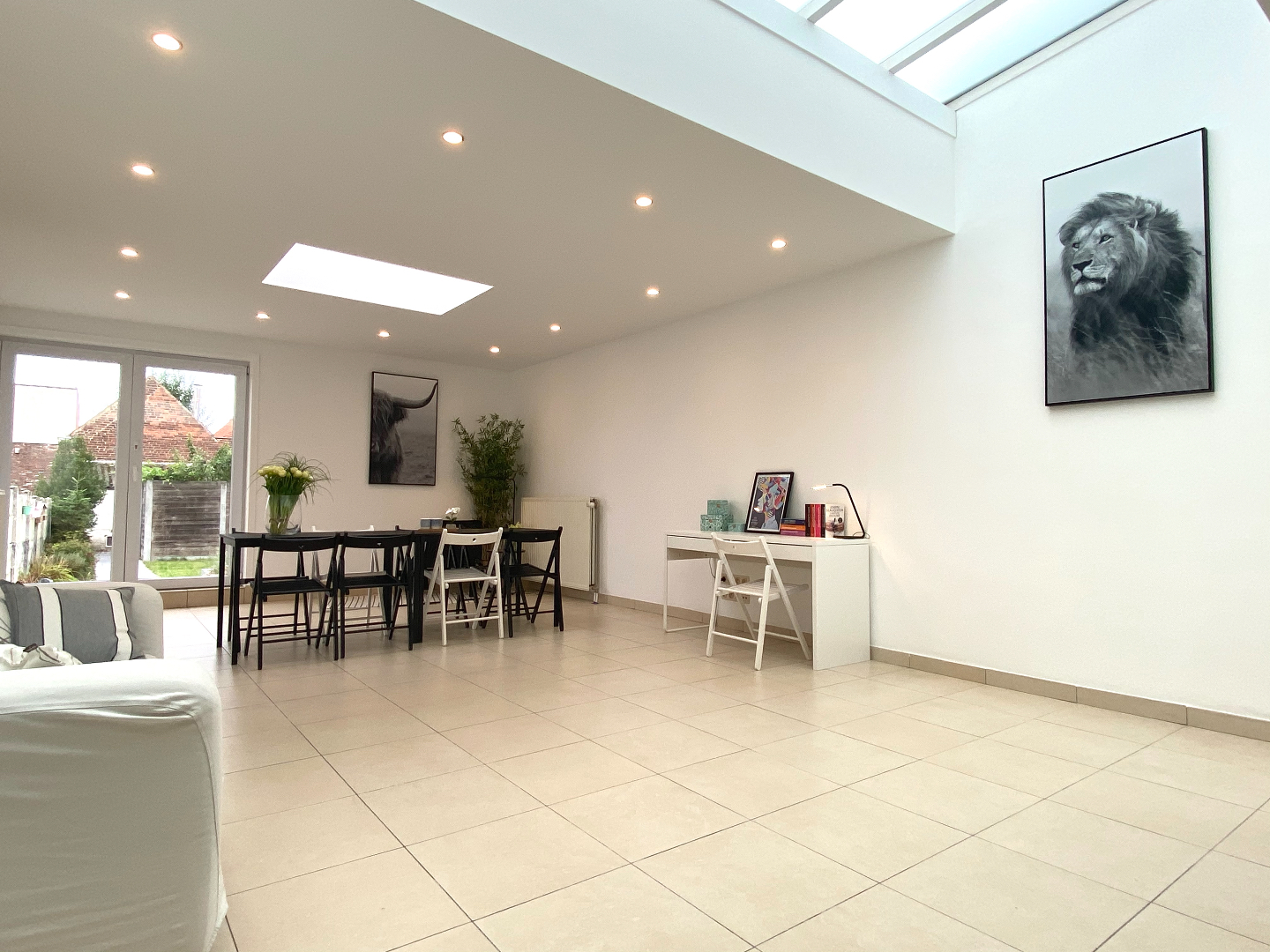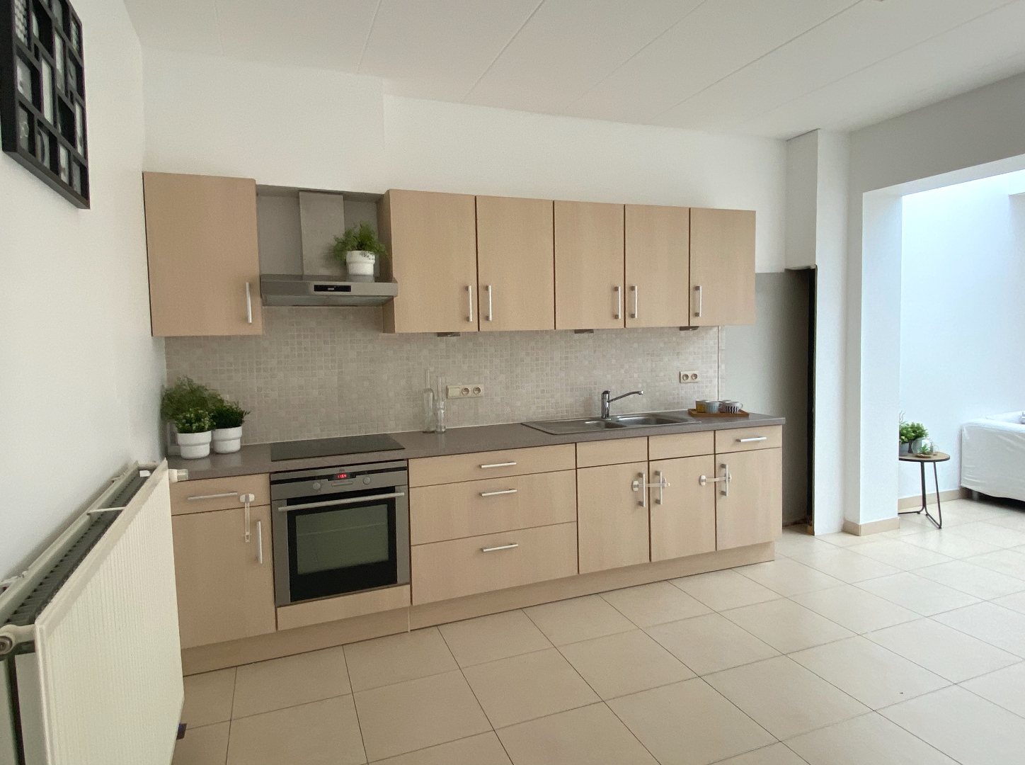 Achter de kleine gevel schuilt een grote woning! Heel ruime en klare leefruimte met toegang naar de tuin, open keuken, droge kelder. Verder tref je er de badkamer met was- en berging aan, een gastentoilet.
