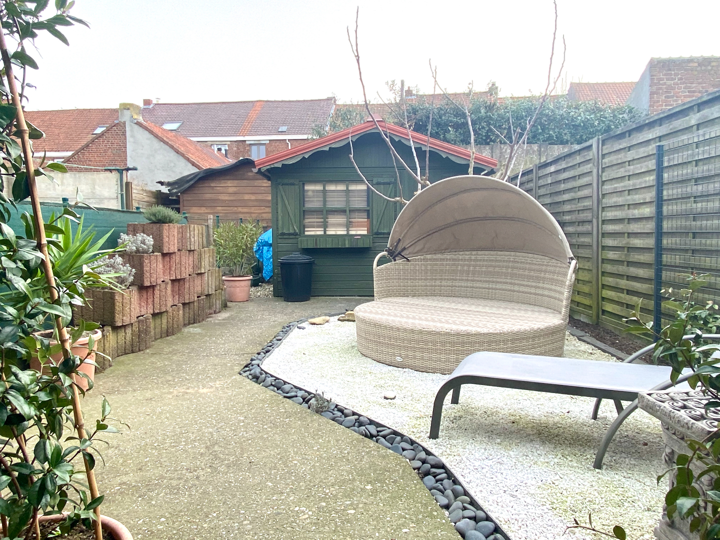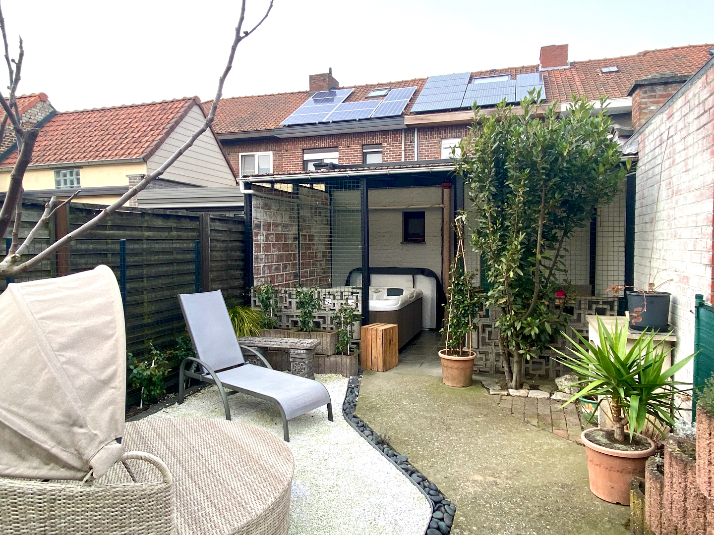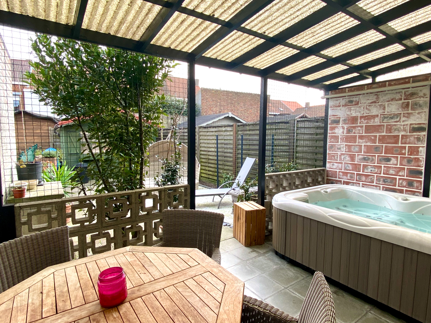 Droge kelder, terras met jacuzzi, onderhoudsvriendelijke tuin met tuinhuis.