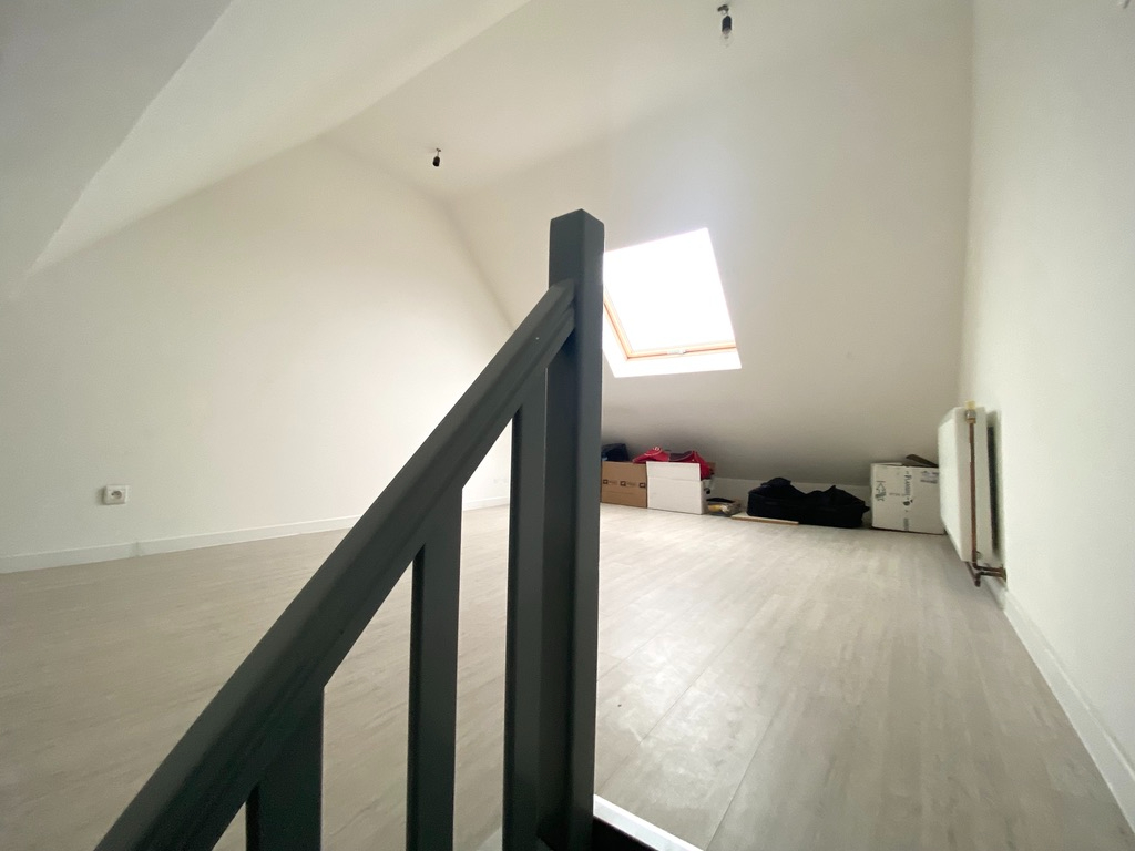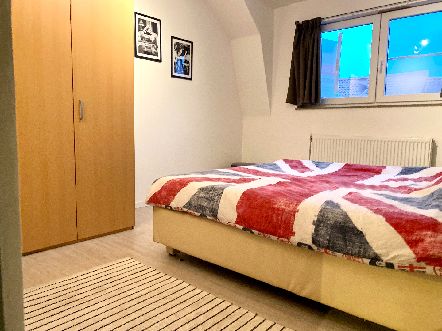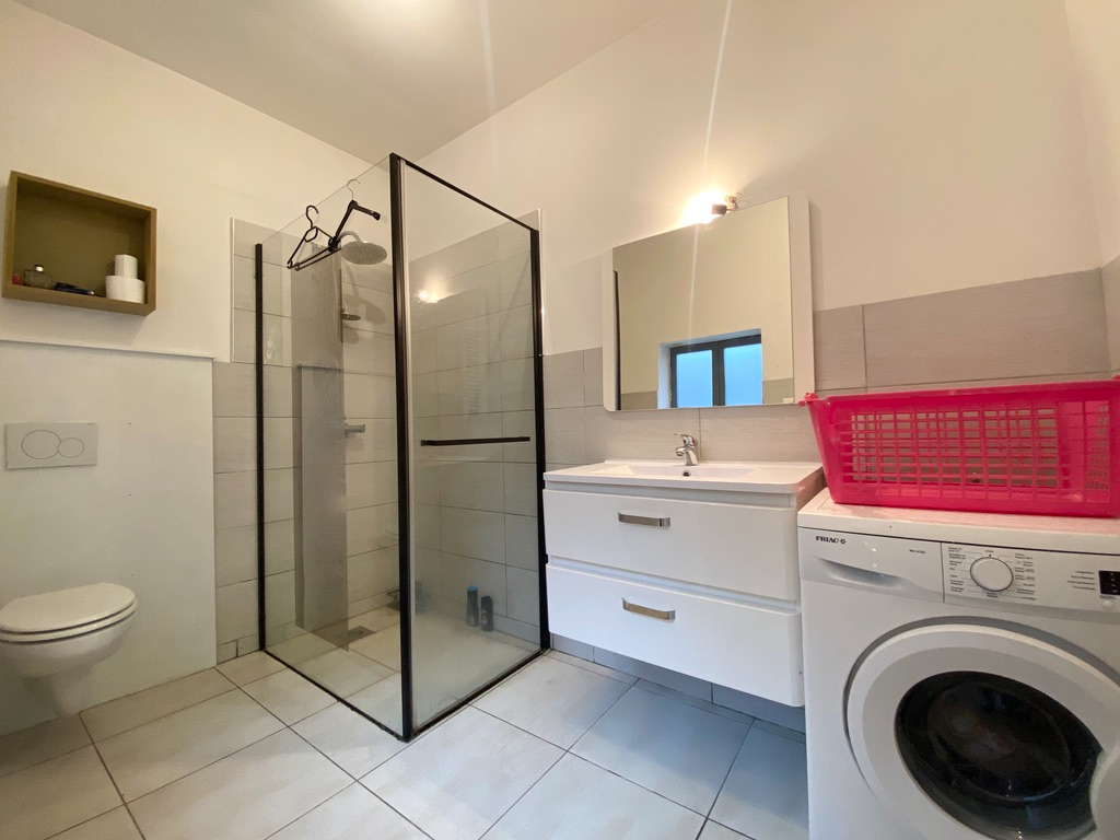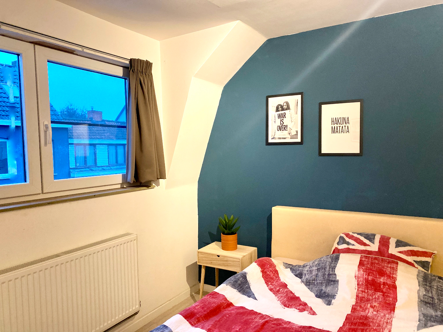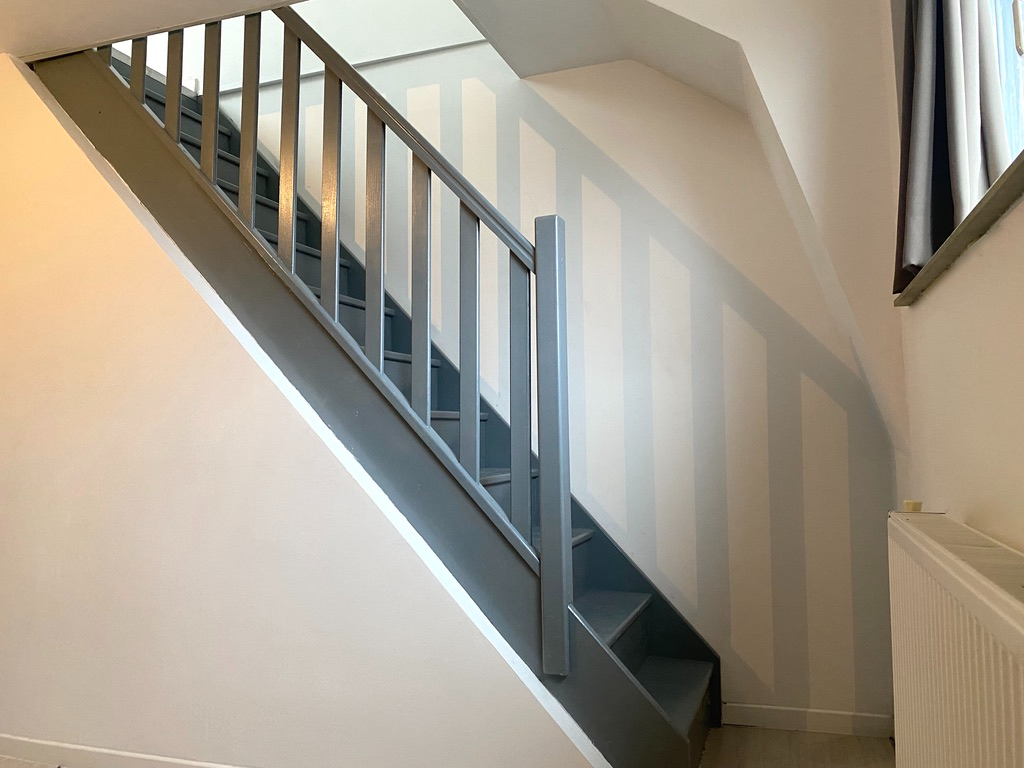 Leefruimte en open keuken, badkamer met douche - toilet en wastafel (+ aansluiting wasmachine). Op het eerste verdiep 2 slaapkamers waar vanuit de 2de slaapkamer een trap vertrekt naar de zolderkamer (derde slaapkamer).