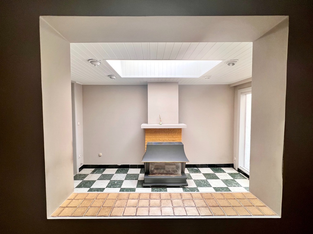 Grote leefruimte met aansluitend de keuken (je kan deze gemakkelijk omvormen tot een keukeneiland) én met zicht op het grote terras. Badkamer en toilet achteraan gelegen.
