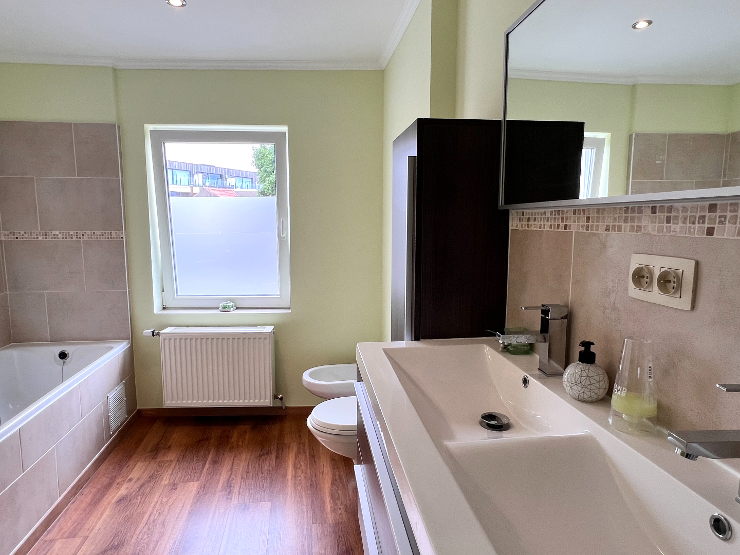 Het eerste verdiep telt drie slaapkamers en een badkamer met ligbad, toilet, bidet en dubbele wastafel.
