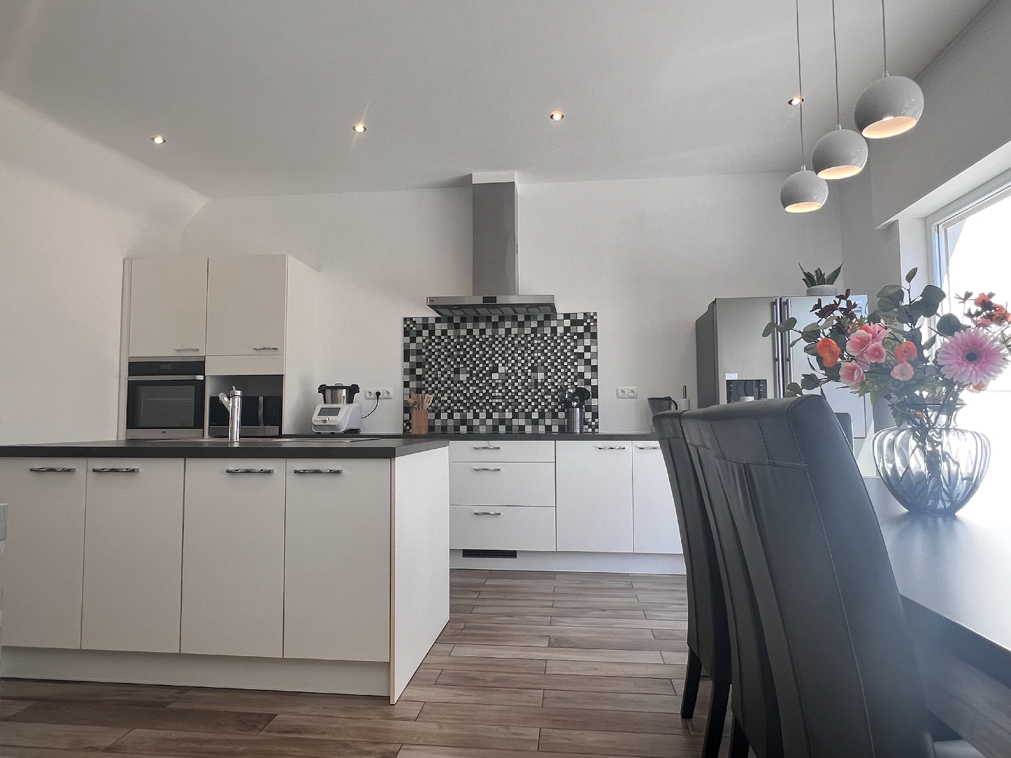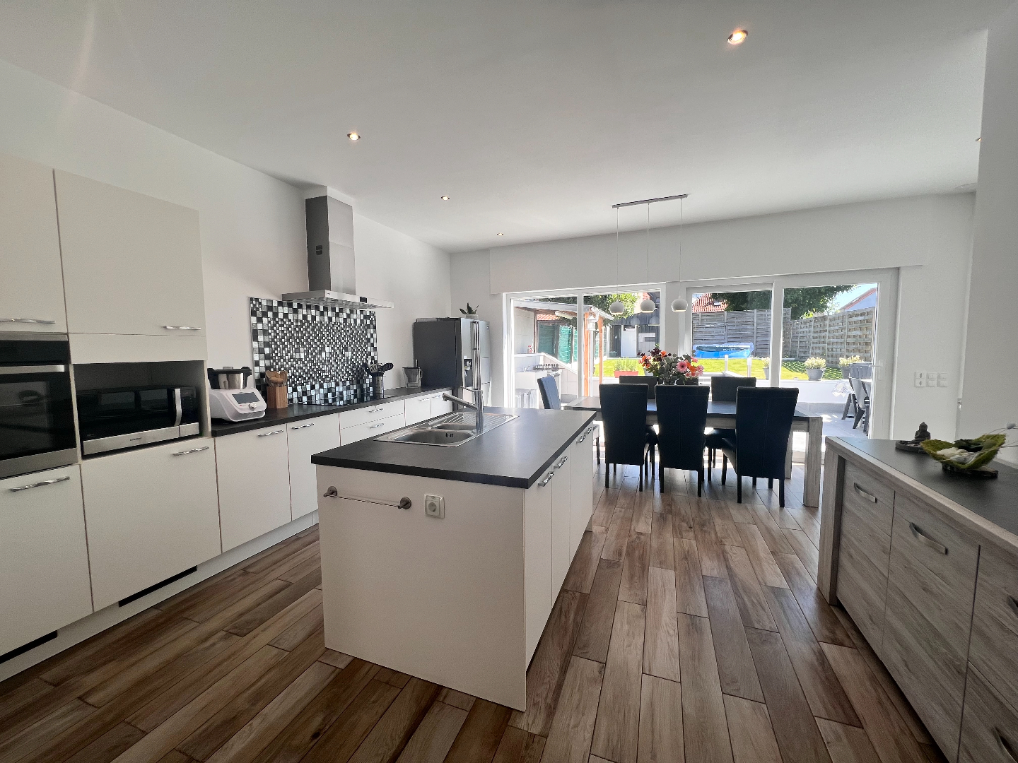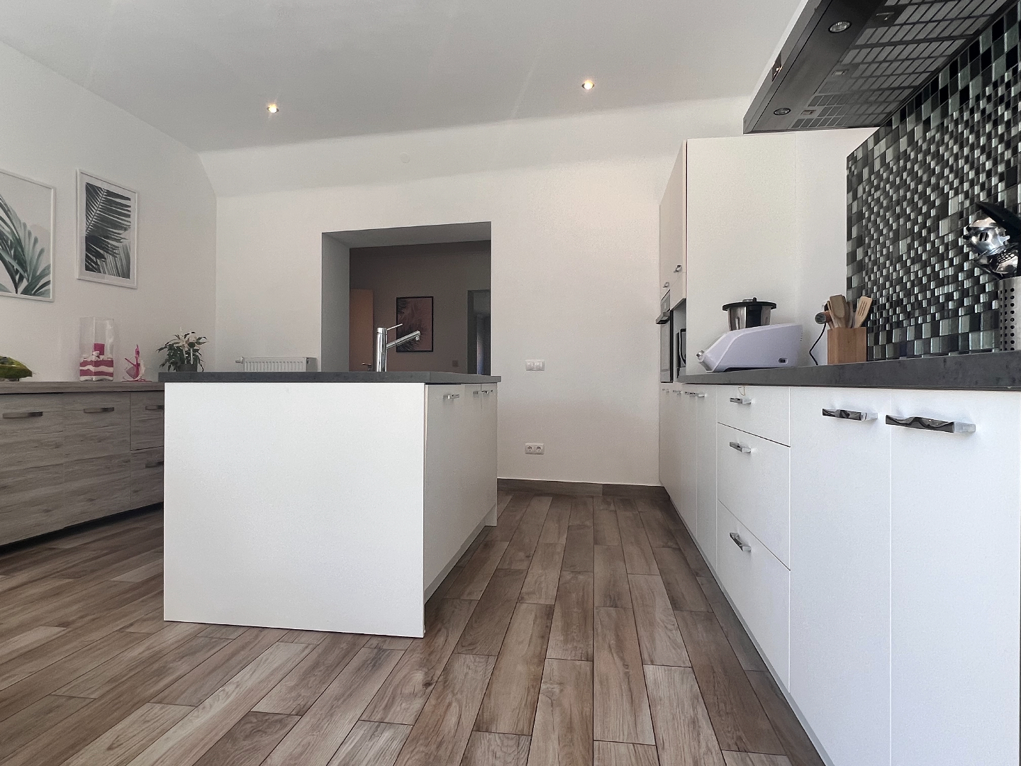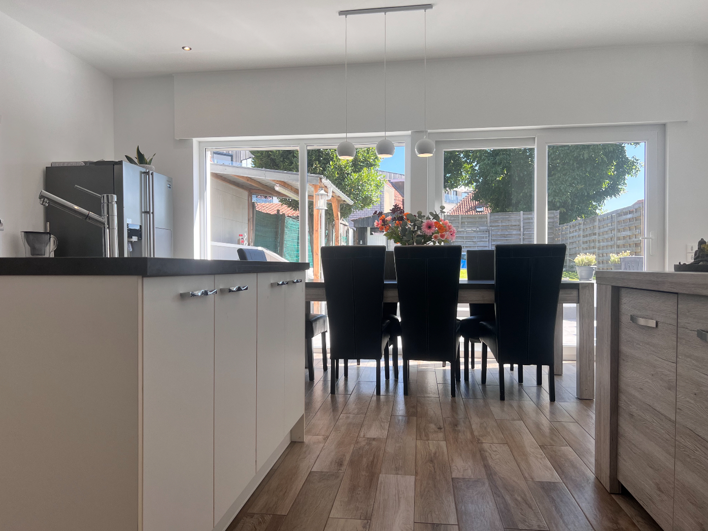 Deze woning heeft het allemaal: een strategische ligging voor vlot woon-werkverkeer, een zongerichte tuin én instapklaar. Je voelt hier de levendigheid van het centrum én je kan genieten van de residentiële rust. De grootste troeven zijn de grote ruimtes: binnenkomen doe je via de aparte inkomhal met vestiairekast onder de trap. Je stapt verder naar de mooie leefruimte met aanpalend de open keuken met eiland. De hele dag door valt het zonlicht binnen via de grote glasramen die over de volledige achtergevel zijn doorgetrokken. Schuif de grote glazen schuifdeur open en geniet van een ongeëvenaard binnen-buiten gevoel ’s. De buitenkeuken maakt het plaatje compleet, lekker aanschuiven voor de barbecue, zalig toch!