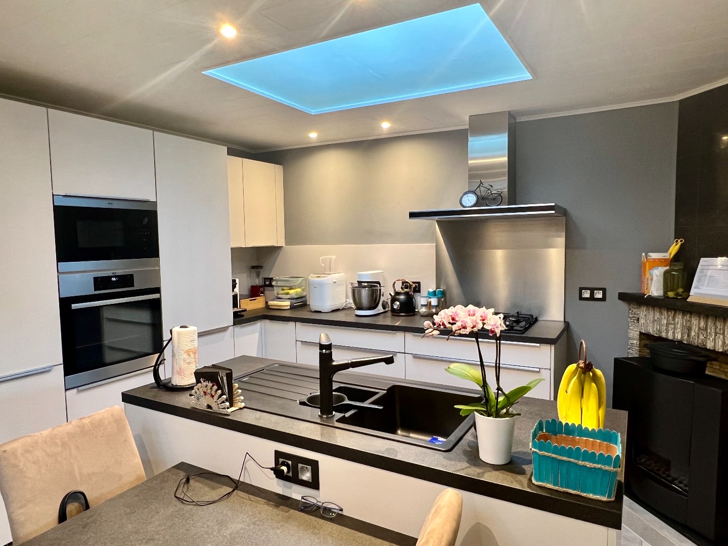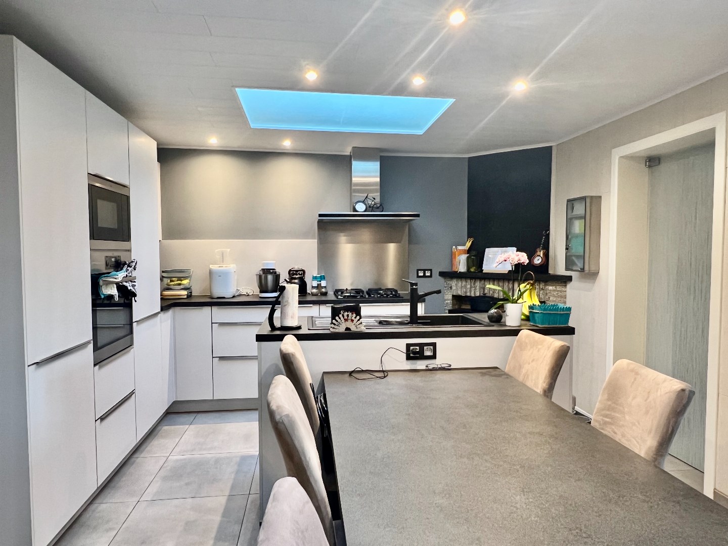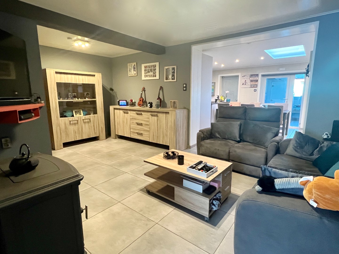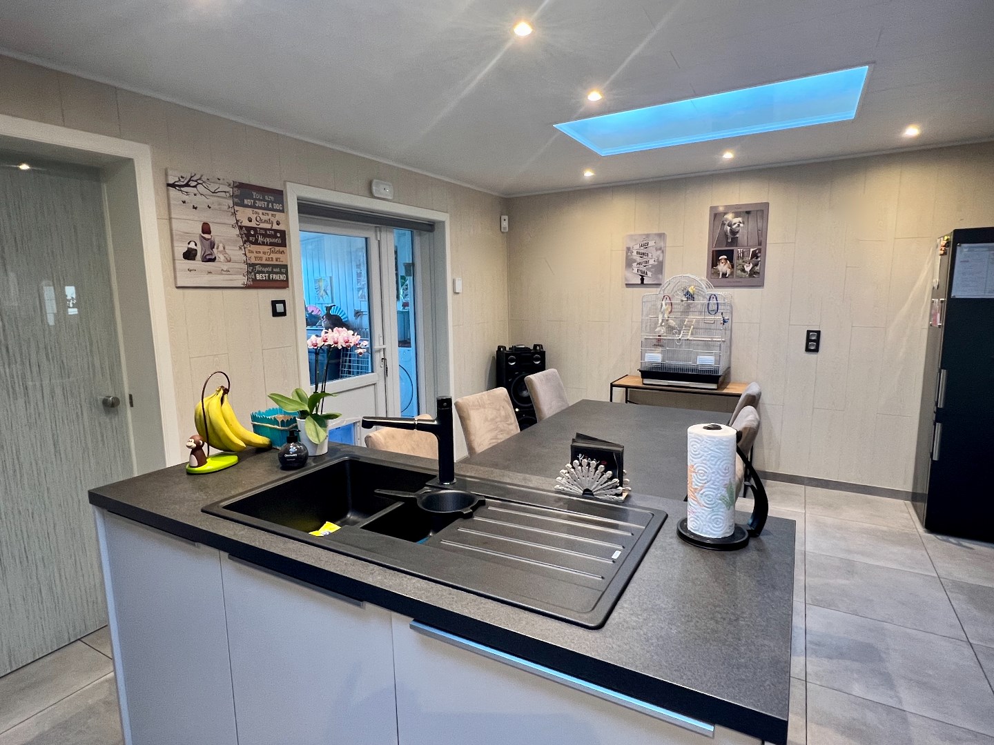 Binnenkomen in de hal, apart gastentoilet, Leefruimte in L-opstelling, open keuken met eiland, gelijkvloerse badkamer, berging.