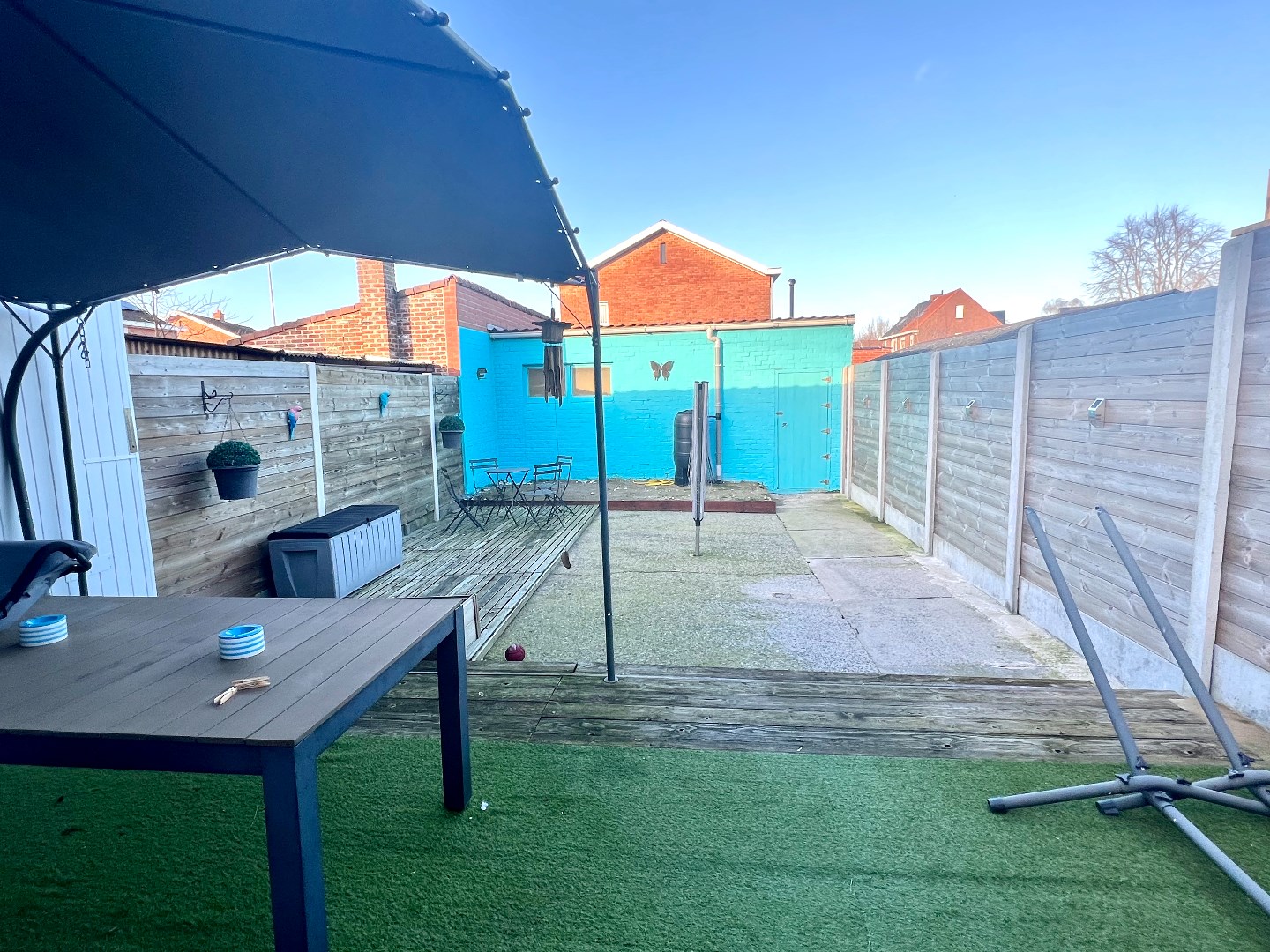 Groot terras en heel grote garage met uitweg.