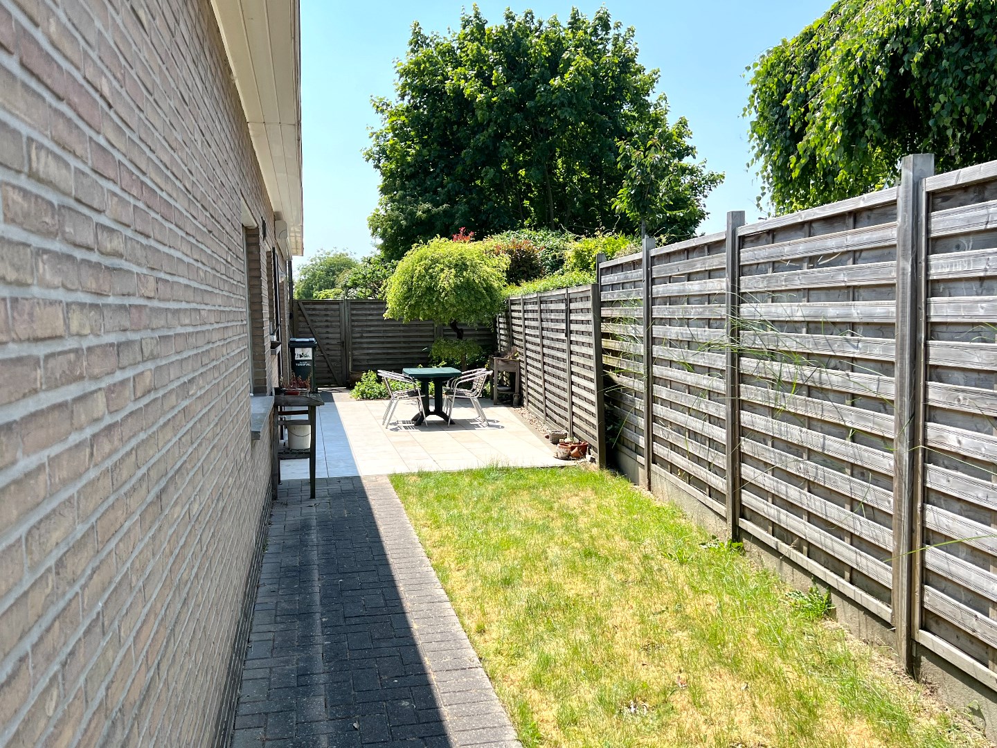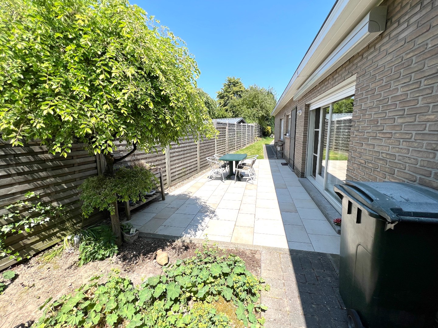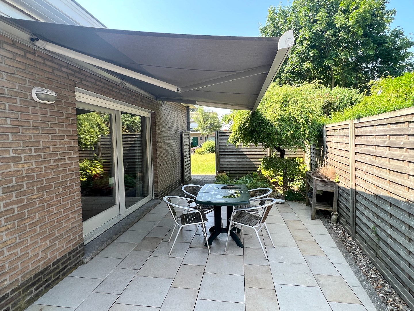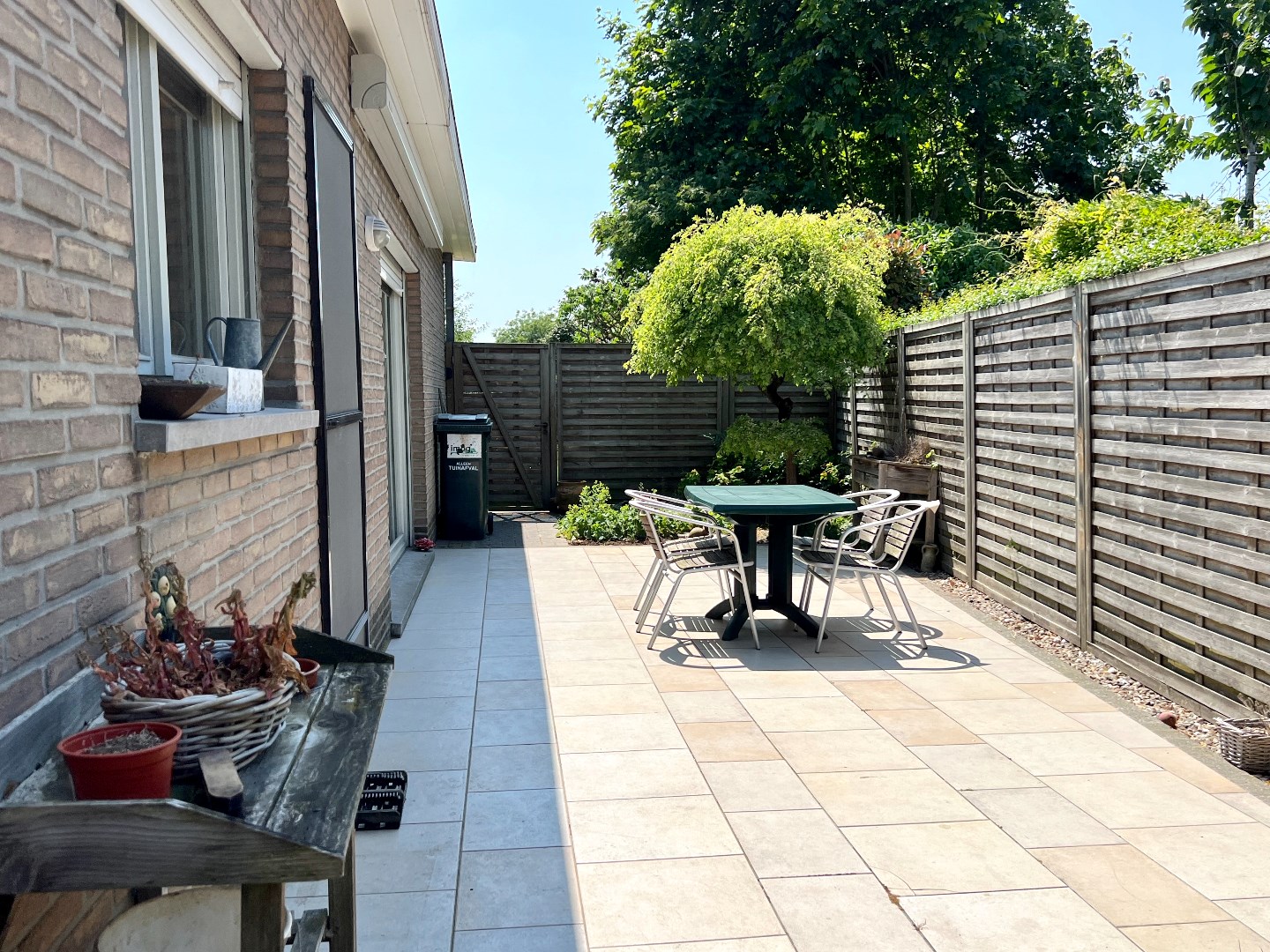 Het terras is een zalig plaatsje om aan tafel te schuiven, met de elektrische zonnewering tevens het favoriete plaatsje om te onbijten of te dineren. De tuin achteraan biedt volop plaats om de kinderen te laten ravotten en de propere was op een natuurlijke wijze te laten drogen.