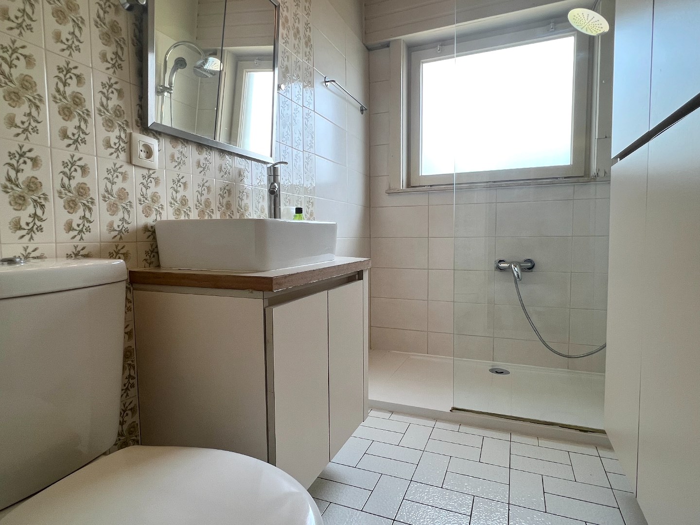 Binnenkomen in de inkomhal met gastentoilet, de gezellige leefruimte ligt vooraan met zicht op de tuin (straatkant) en op het zijdelings terras. Grote ramen laten de ruimte baden in het zonlicht. De keuken is net achter de leefruimte gelegen en geeft tevens toegang tot het terras. Drie ruime slaapkamers (waarvan 2 met ingebouwde kasten en eigen lavabo) en badkamer zijn achteraan gelegen. De garage biedt plaats voor een wagen en fietsen en geeft toegang tot de zolderberging.