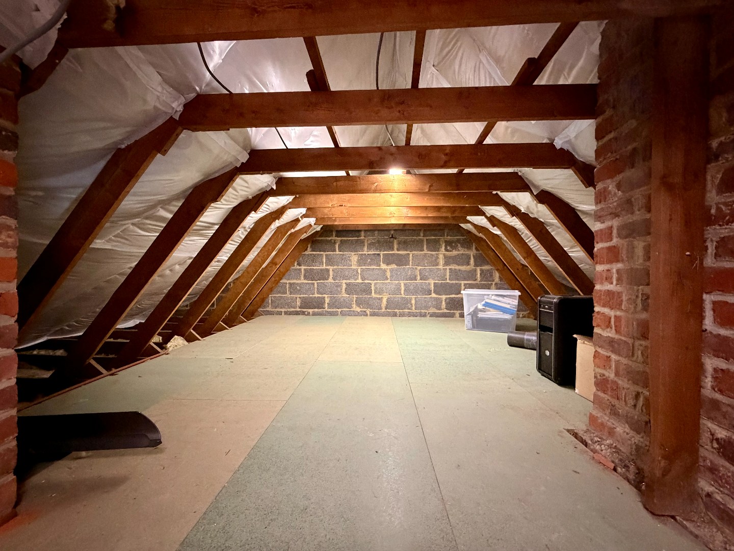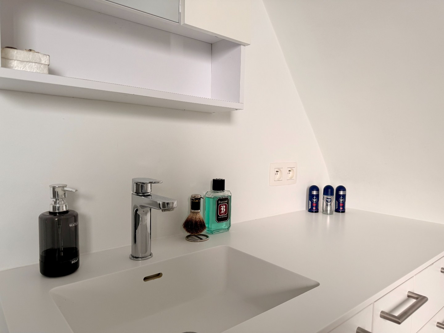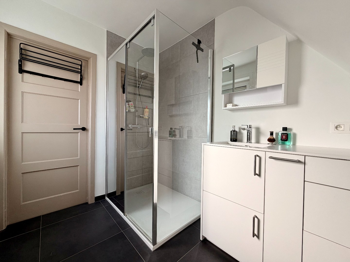 Op de eerste verdieping zijn er twee ruime slaapkamers en een badkamer uitgerust met een inloopdouche, wastafel en toilet. De geïsoleerde zolder, bereikbaar via een uitschuifbare trap, biedt extra opbergmogelijkheden.
