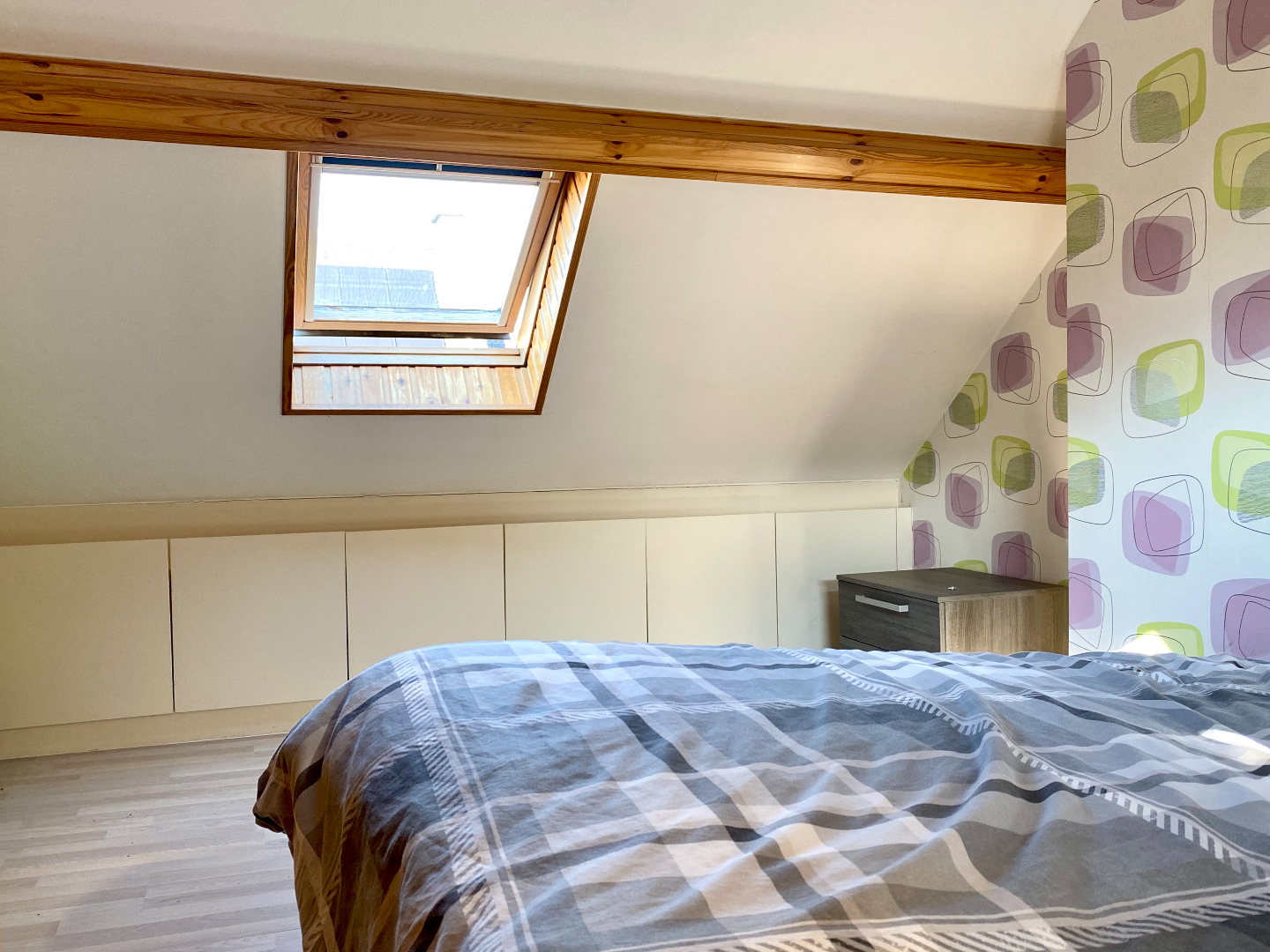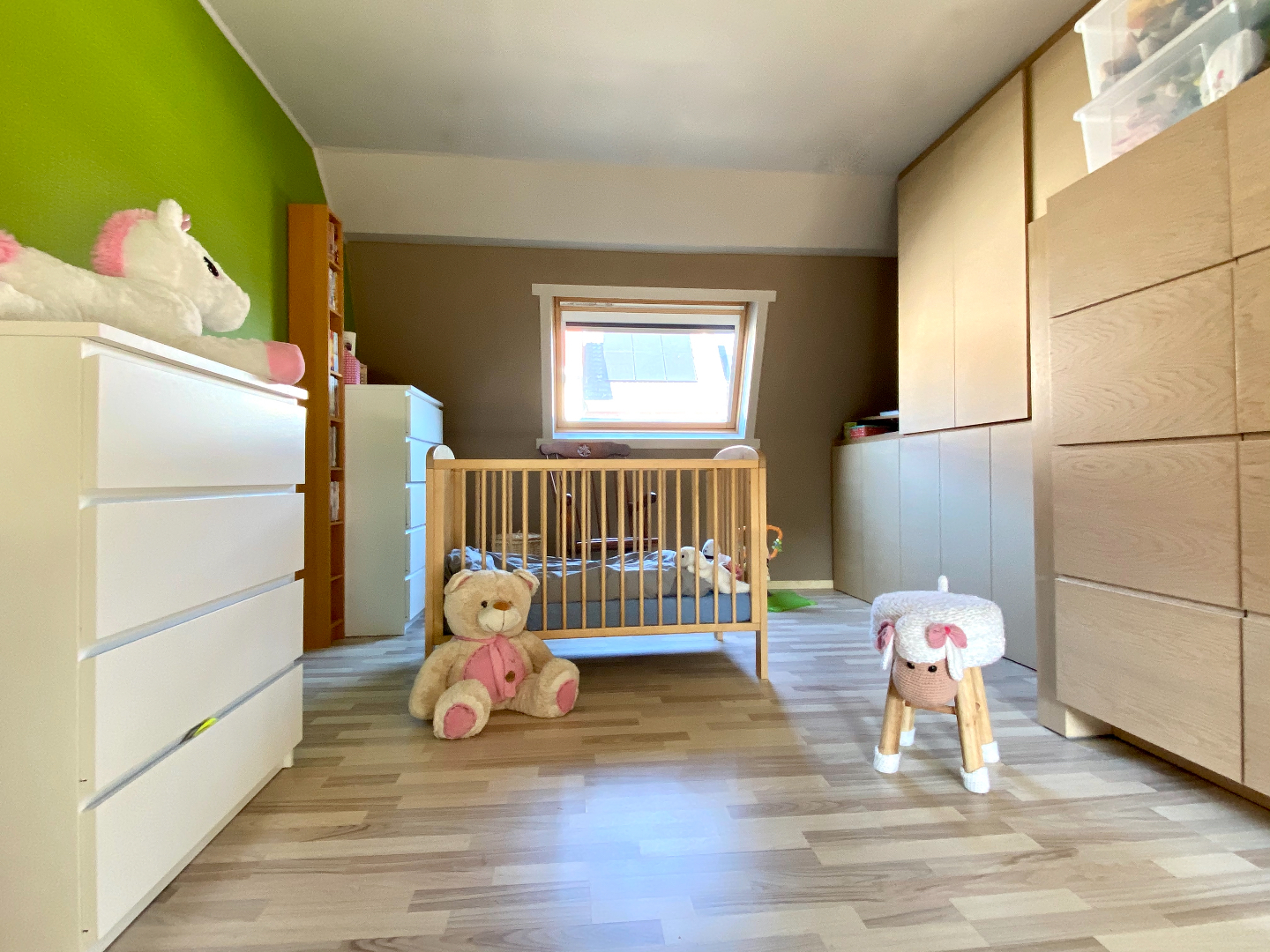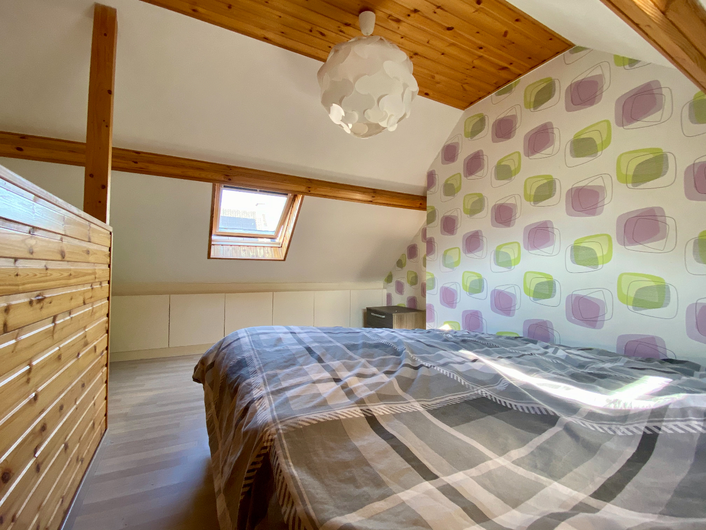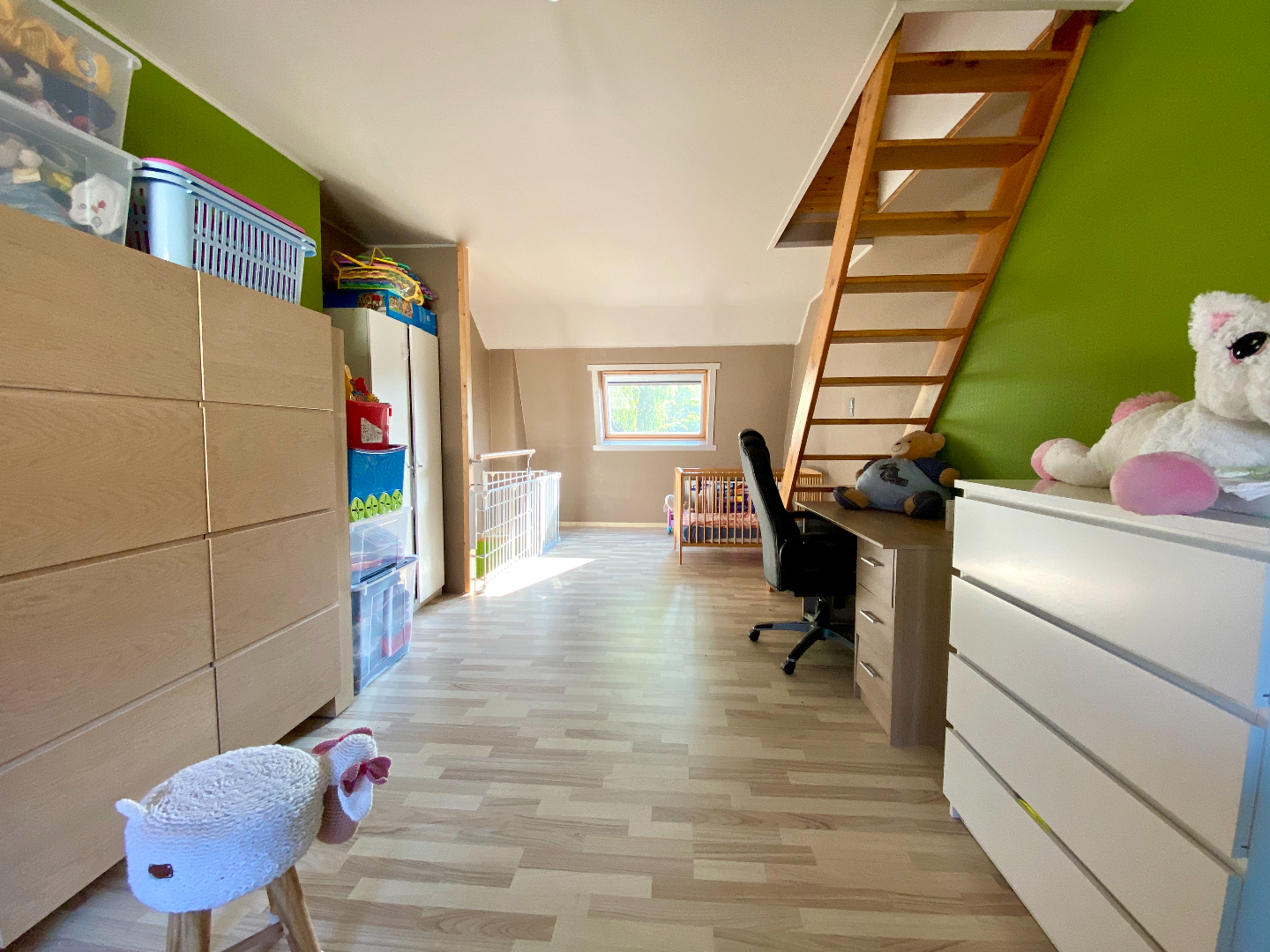 Op het verdiep een knap ingerichte ruimte (speelkamer en slaapkamer voor de kinderen) die gemakkelijk in twee kamers te verdelen is zonder breekwerk, onder het geïsoleerde dak een tweede slaapkamer.