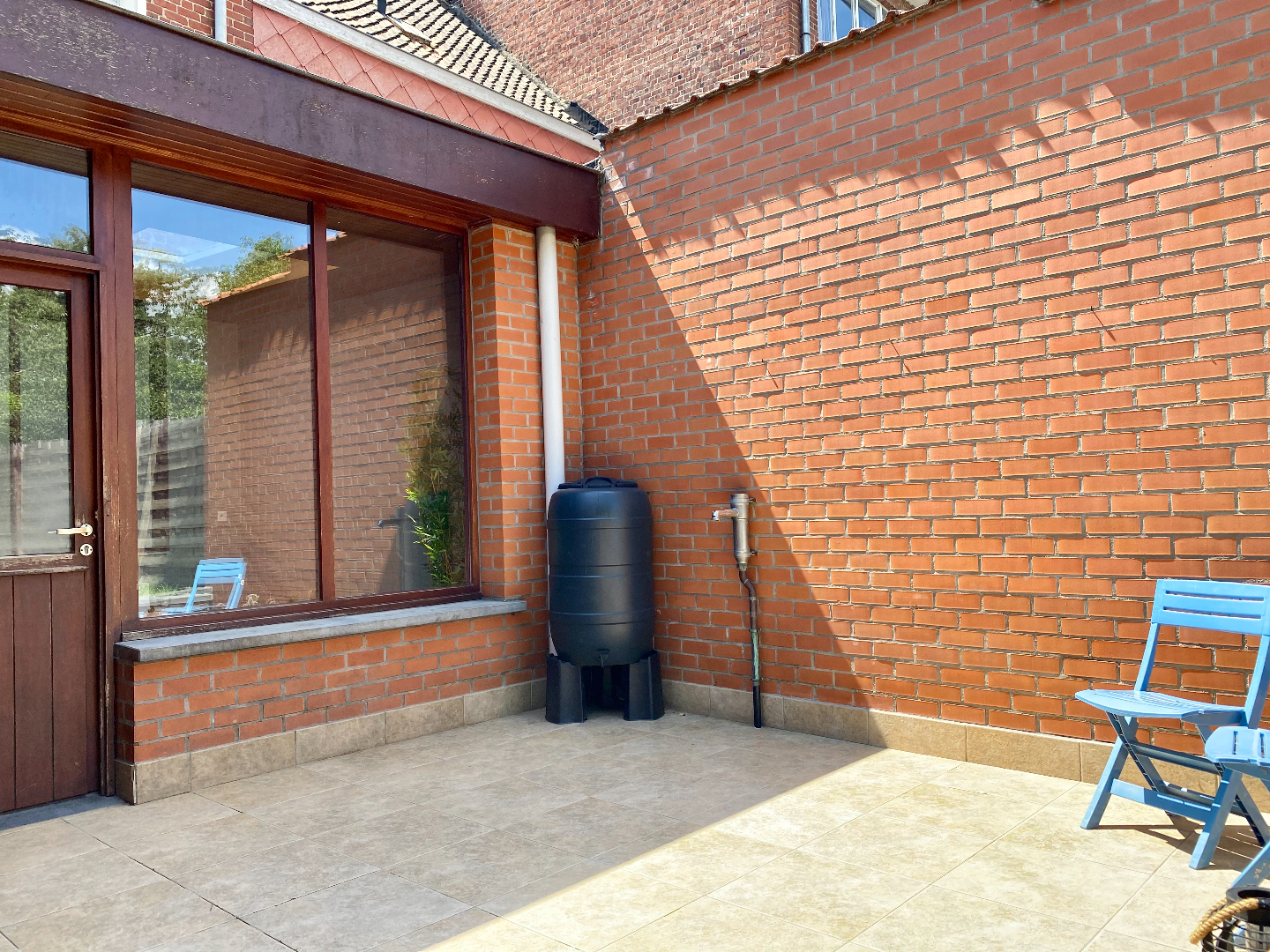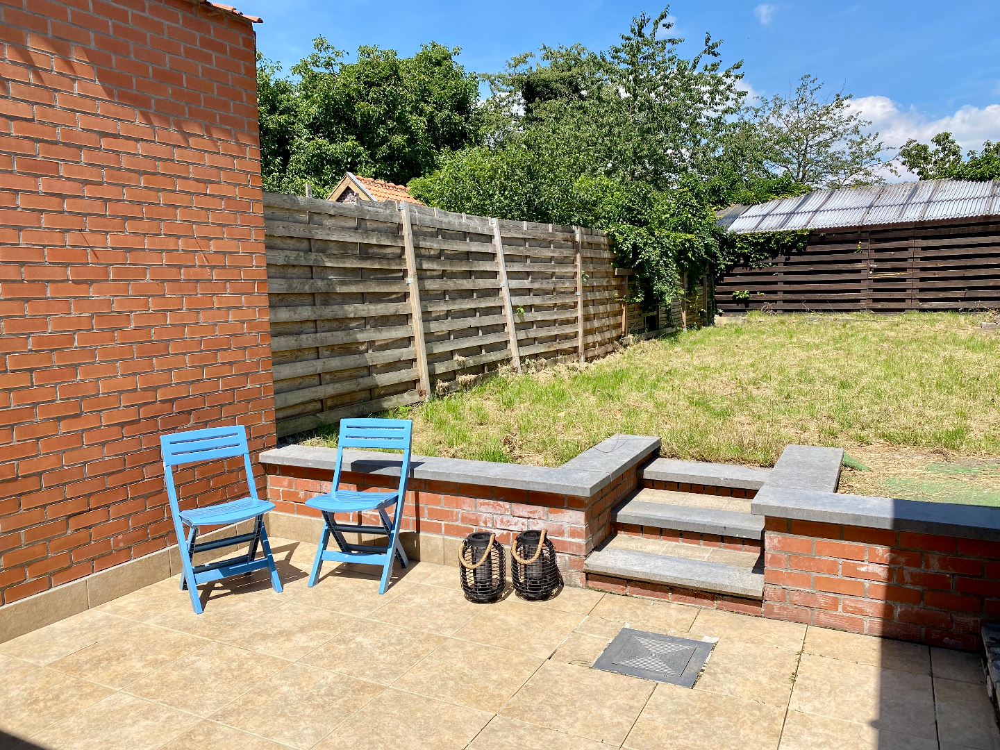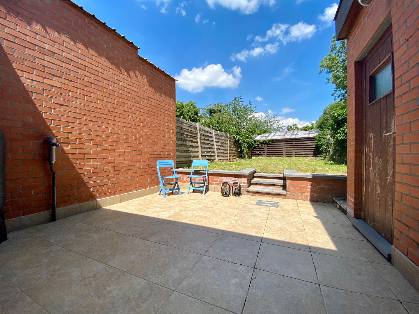 Gezellig zonnig terras en omheinde tuin met berging.
