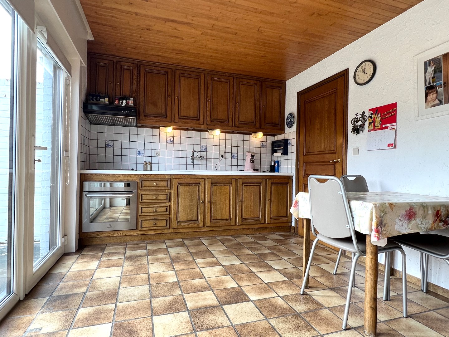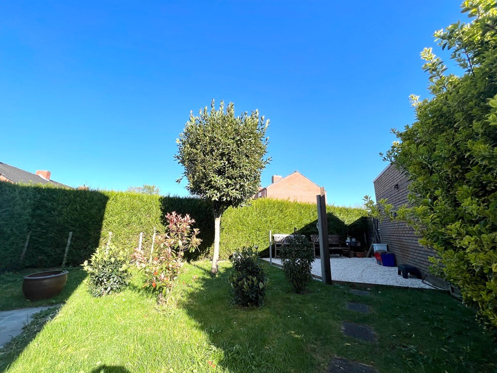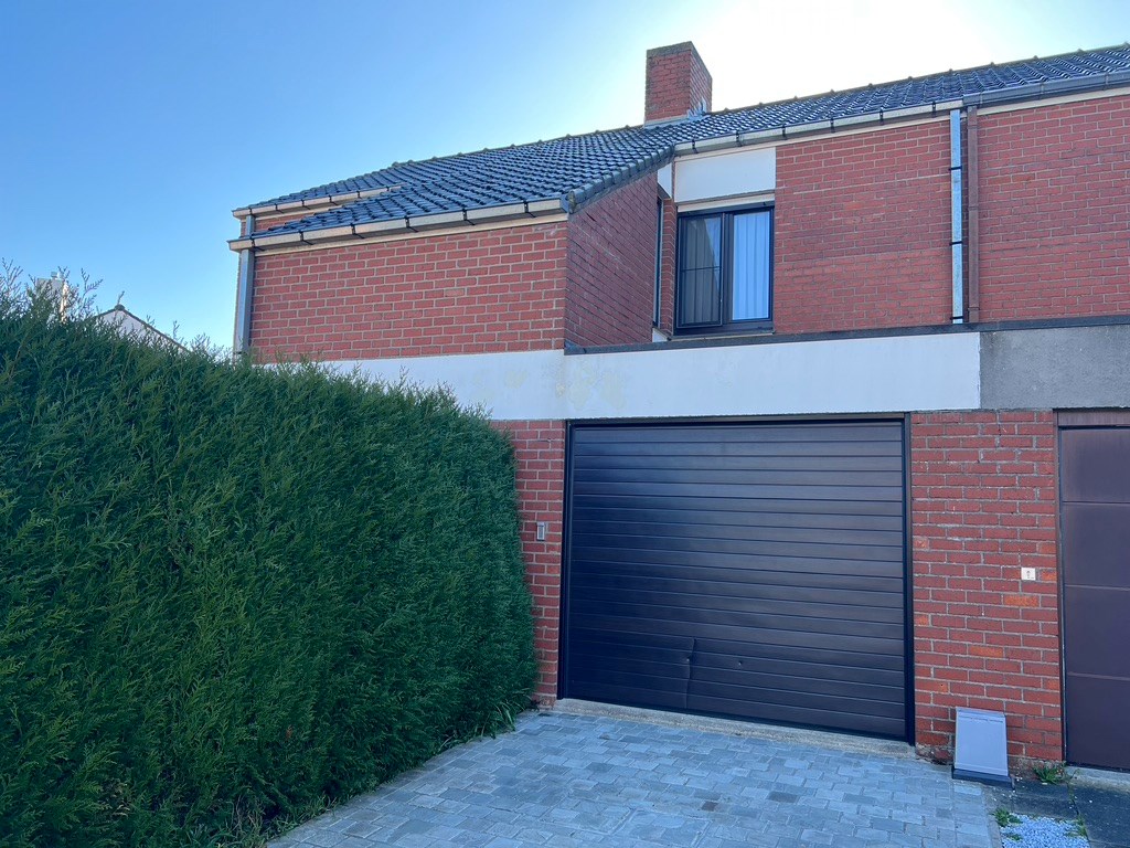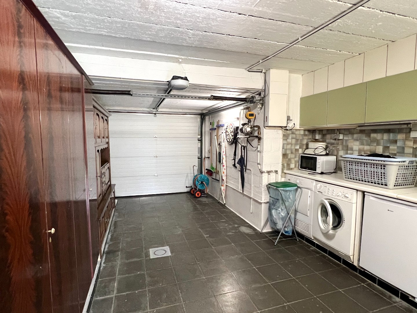 De keuken met eetmogelijkheid bevindt zich achteraan met zicht op de tuin, vanuit de keuken treedt je de grote garage met plaats voor de wasmachine en koelkast binnen.