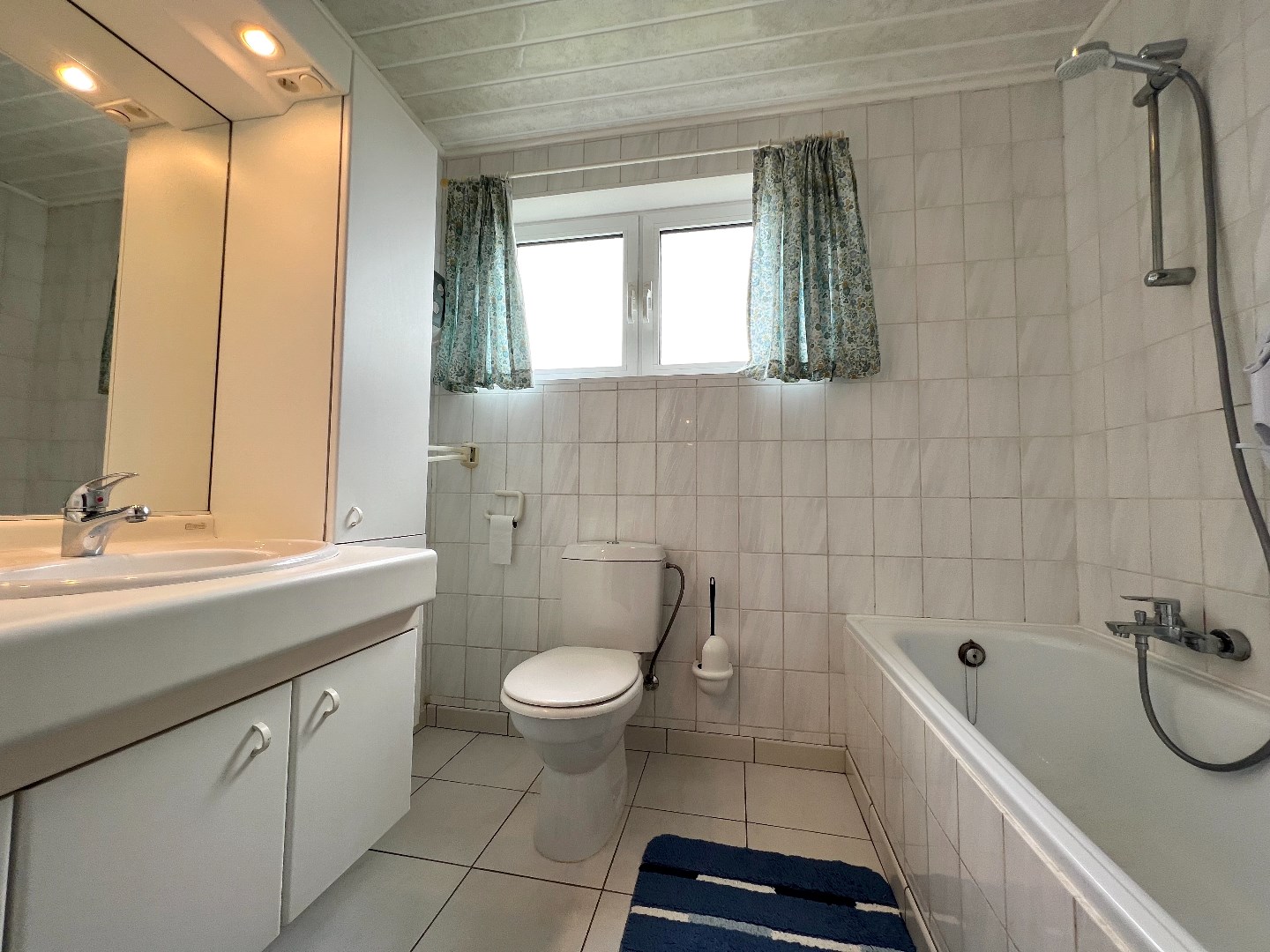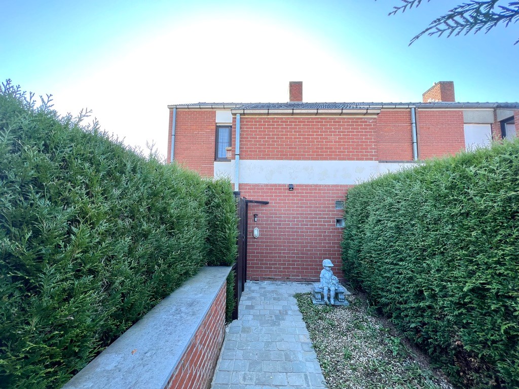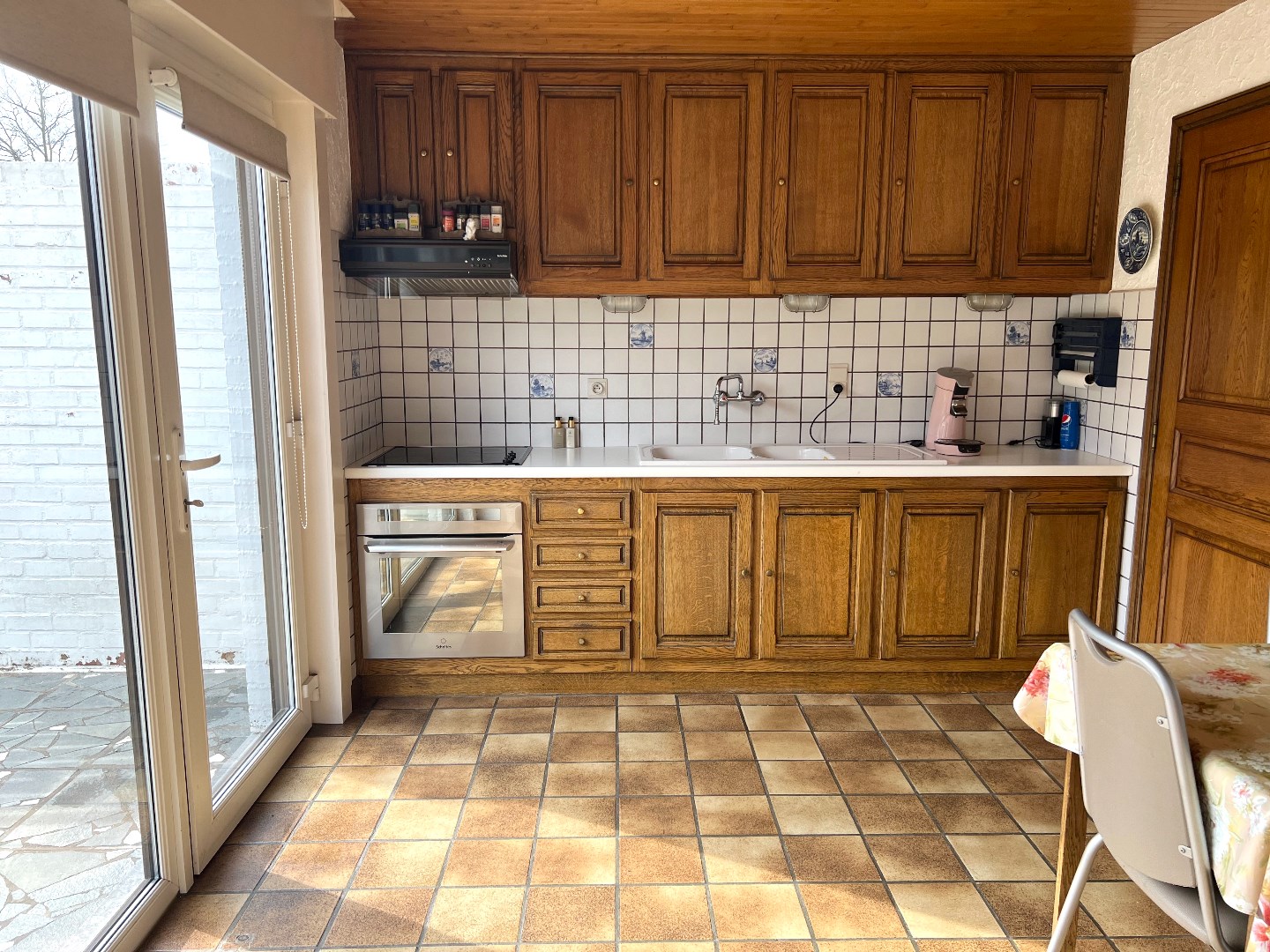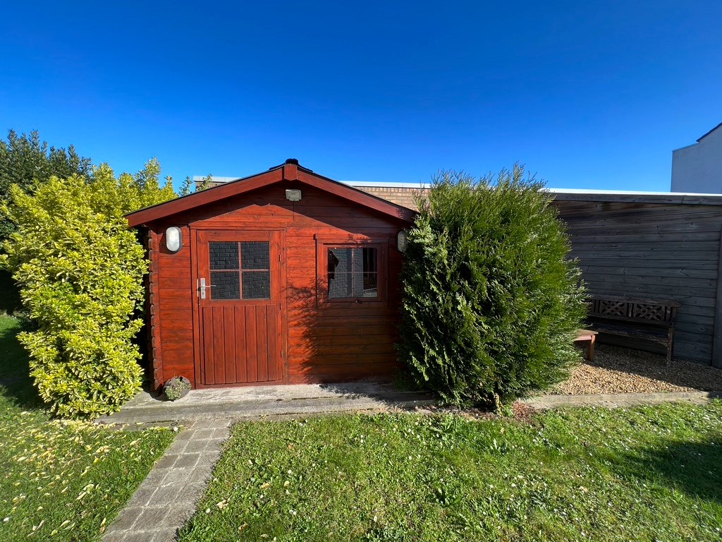 De keuken met eetmogelijkheid bevindt zich achteraan met zicht op de tuin, vanuit de keuken treedt je de grote garage met plaats voor de wasmachine en koelkast binnen.
