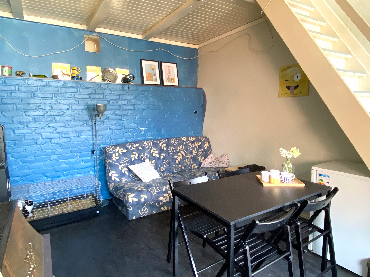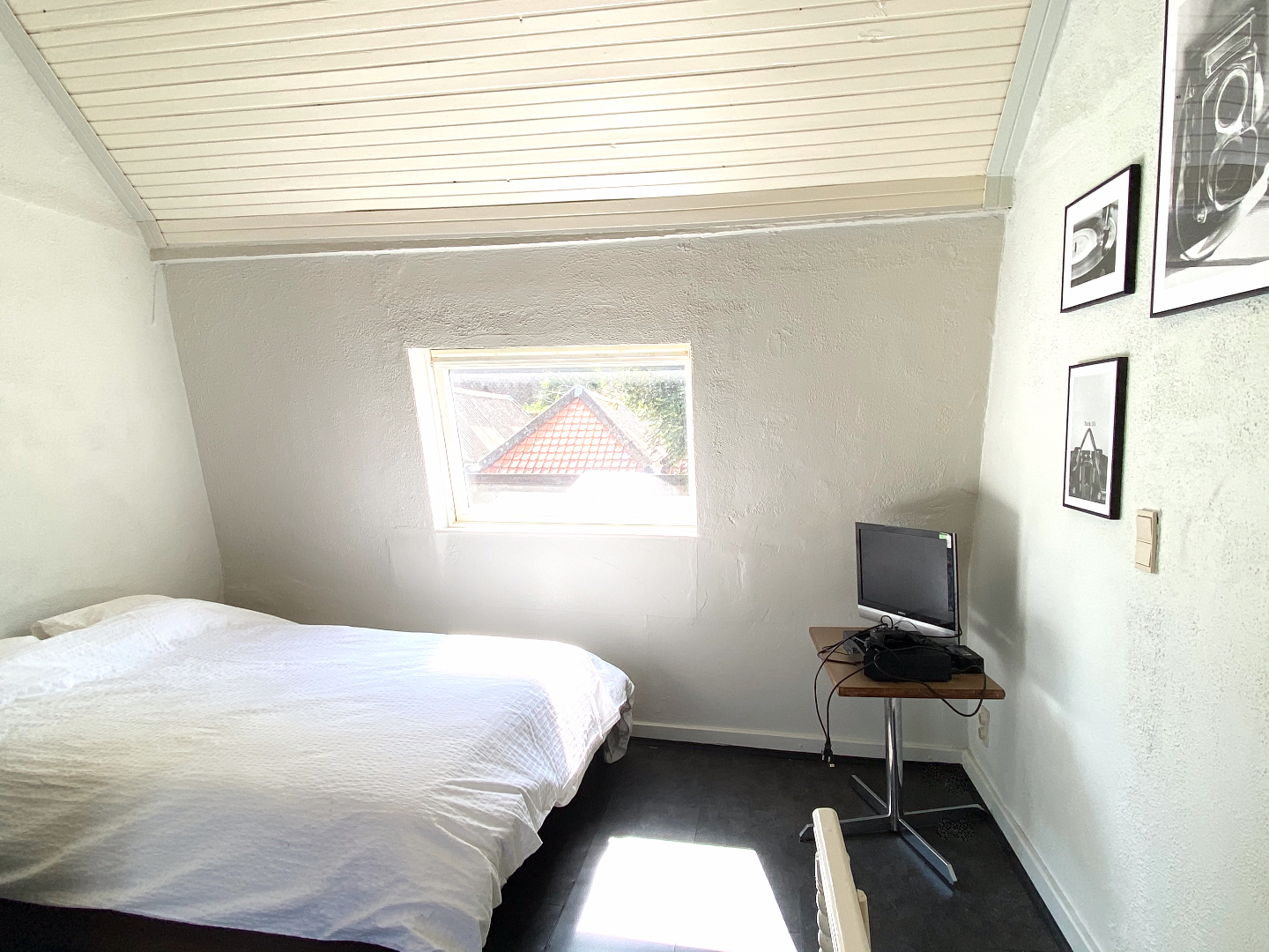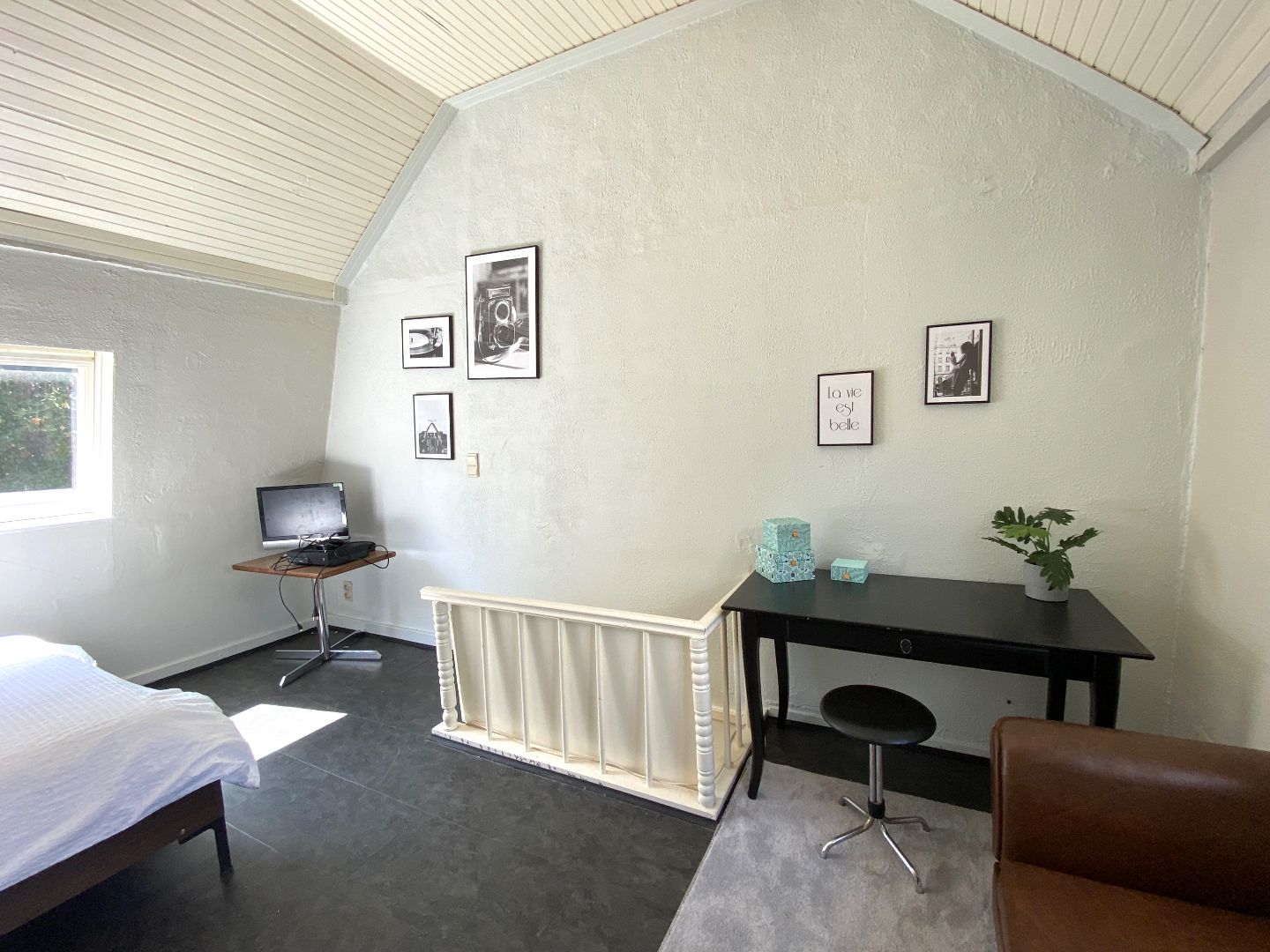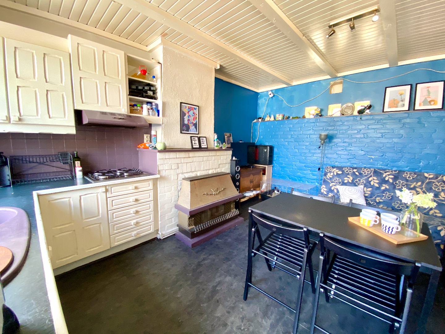 Leefruimte en keuken in één geheel, de slaapkamer en badkamer bevinden zich onder het dak.