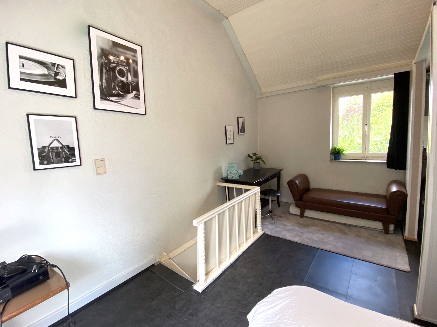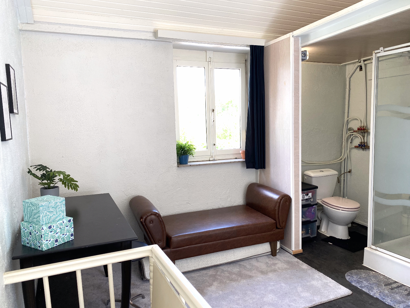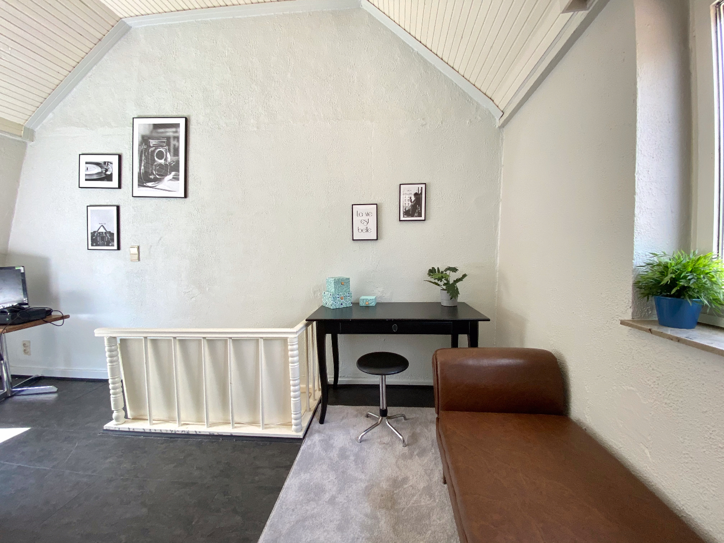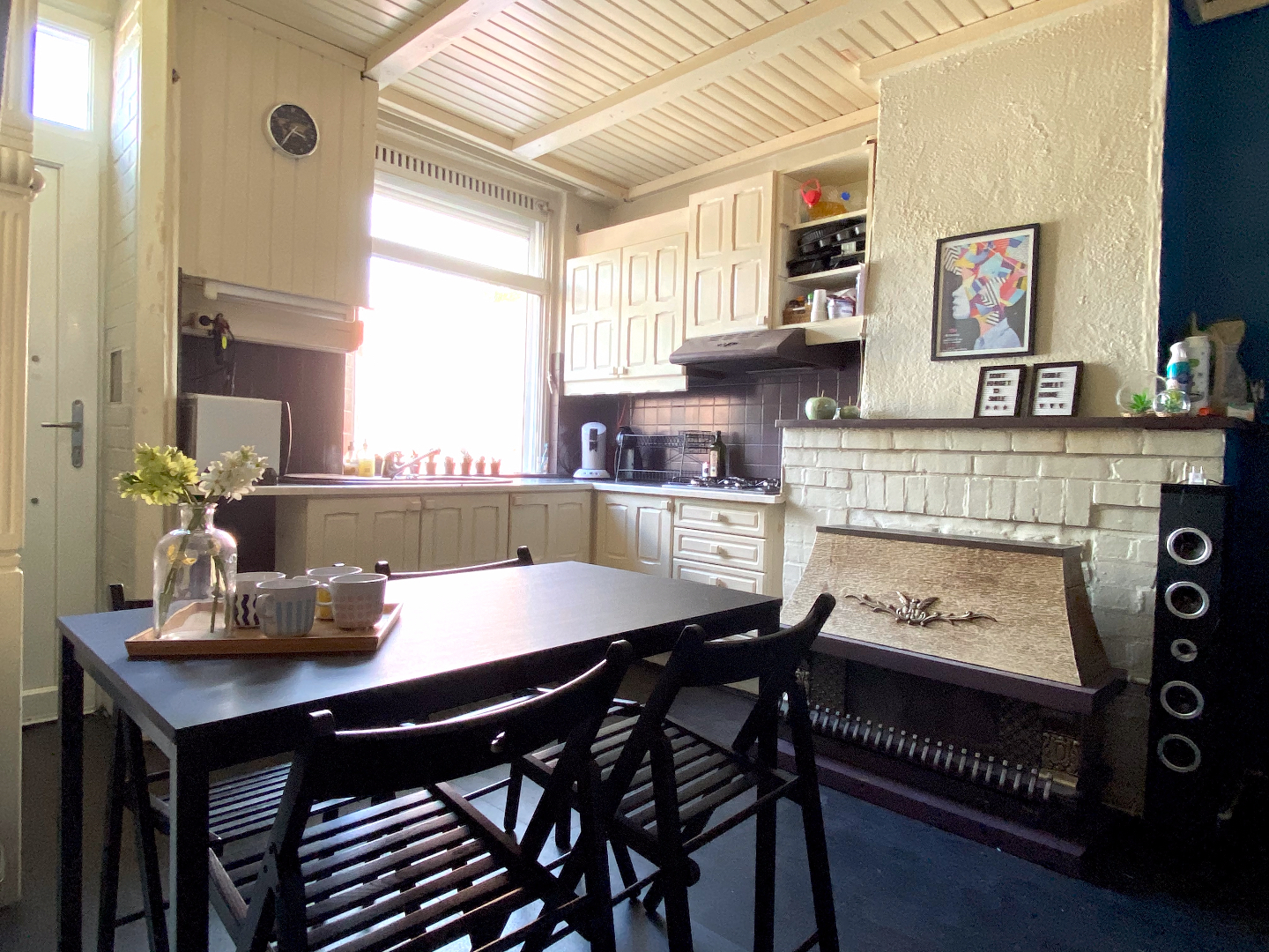Leefruimte en keuken in één geheel, de slaapkamer en badkamer bevinden zich onder het dak.
