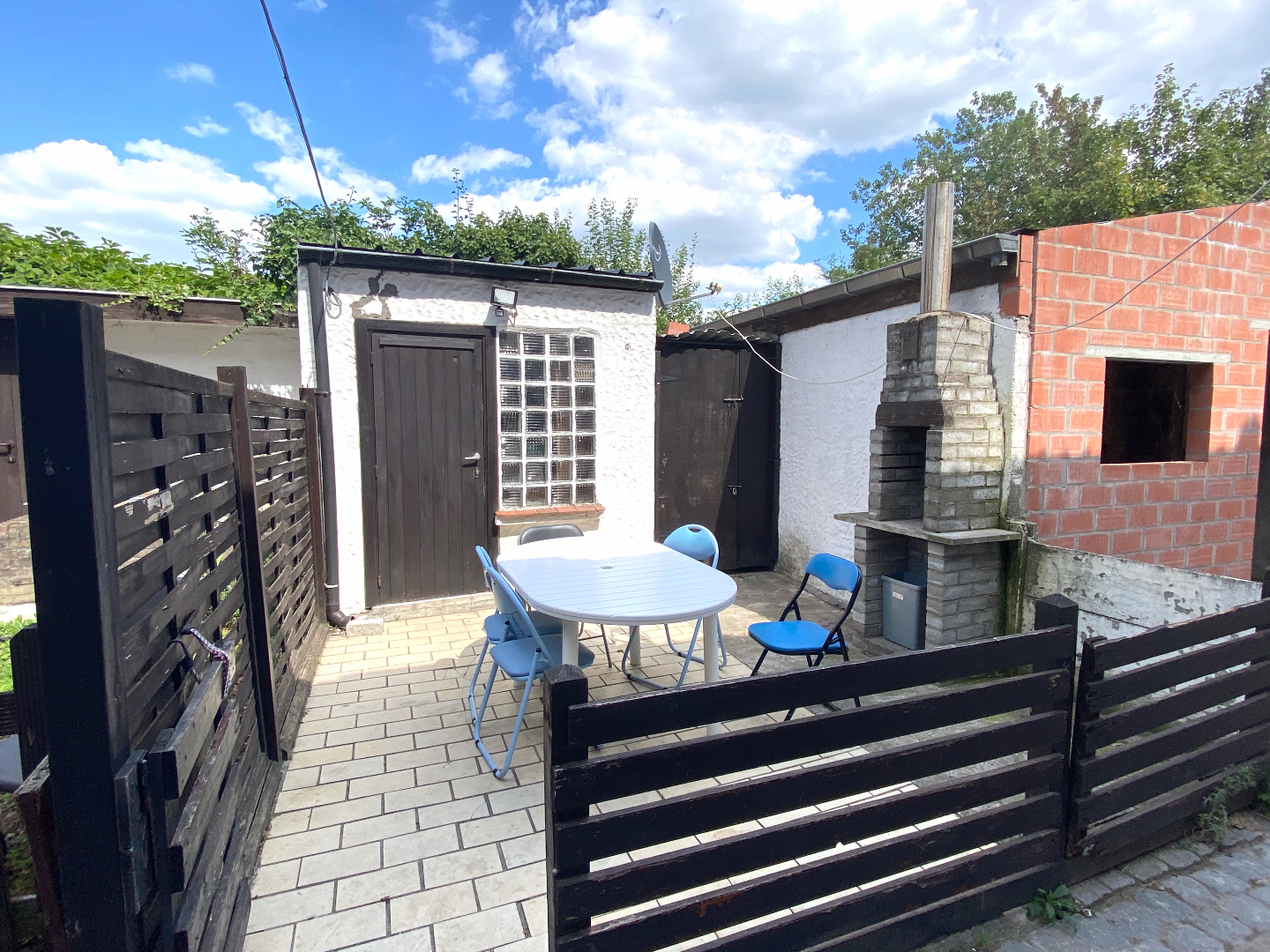 Een gezellig terrasje en grote berging voorzien van een extra toilet en lavabo met aansluitingen voor de wasmachine en nog een kleine berging (het dakje moet hier nog bekeken worden) voor de fietsen en vuilniszakken.