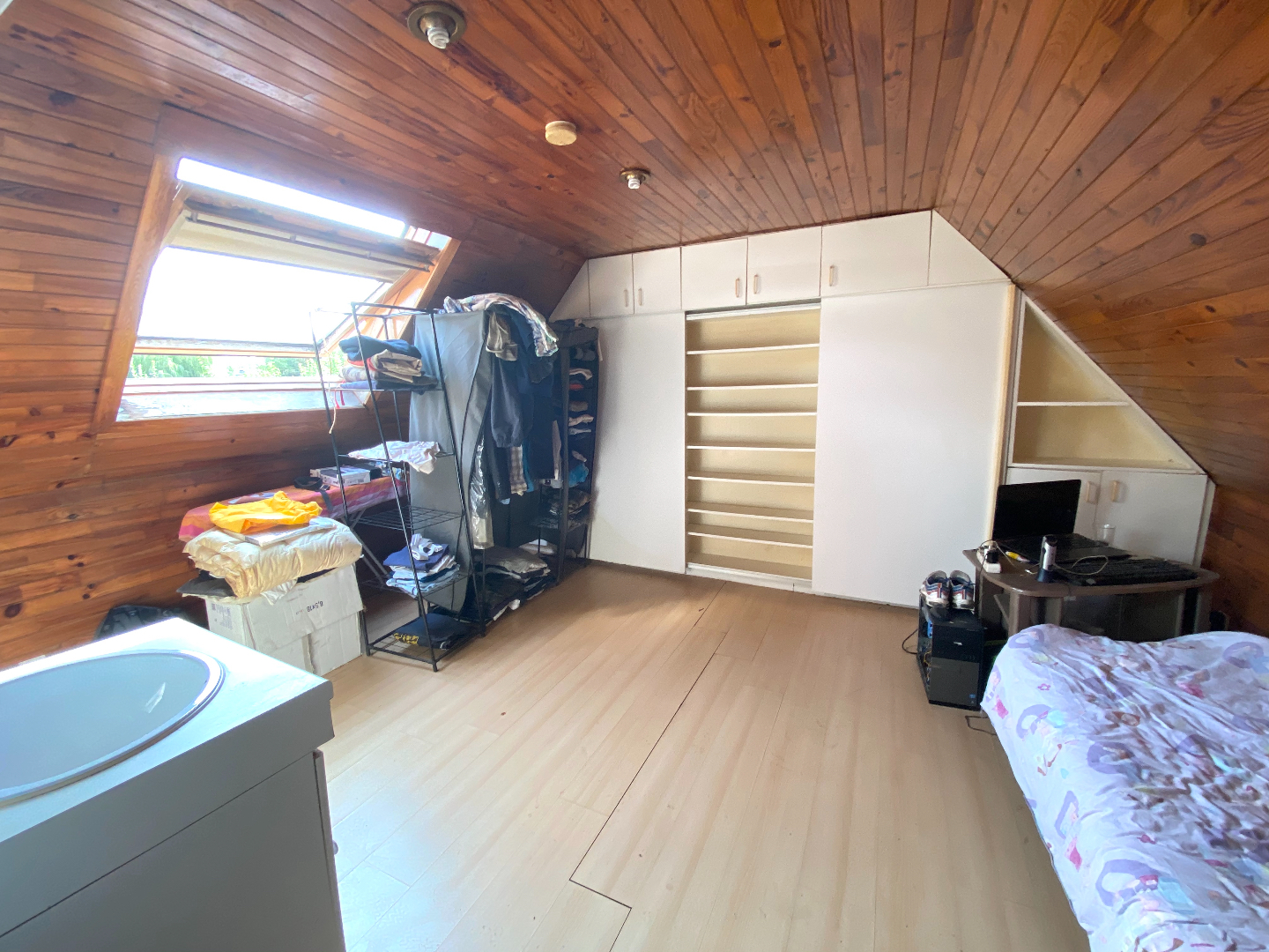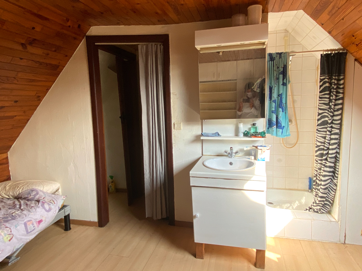Leefruimte en keukentje, op het verdiep een grote slaapkamer met apart toilet, wastafel en douche.