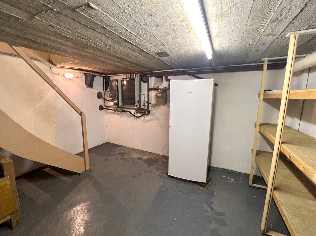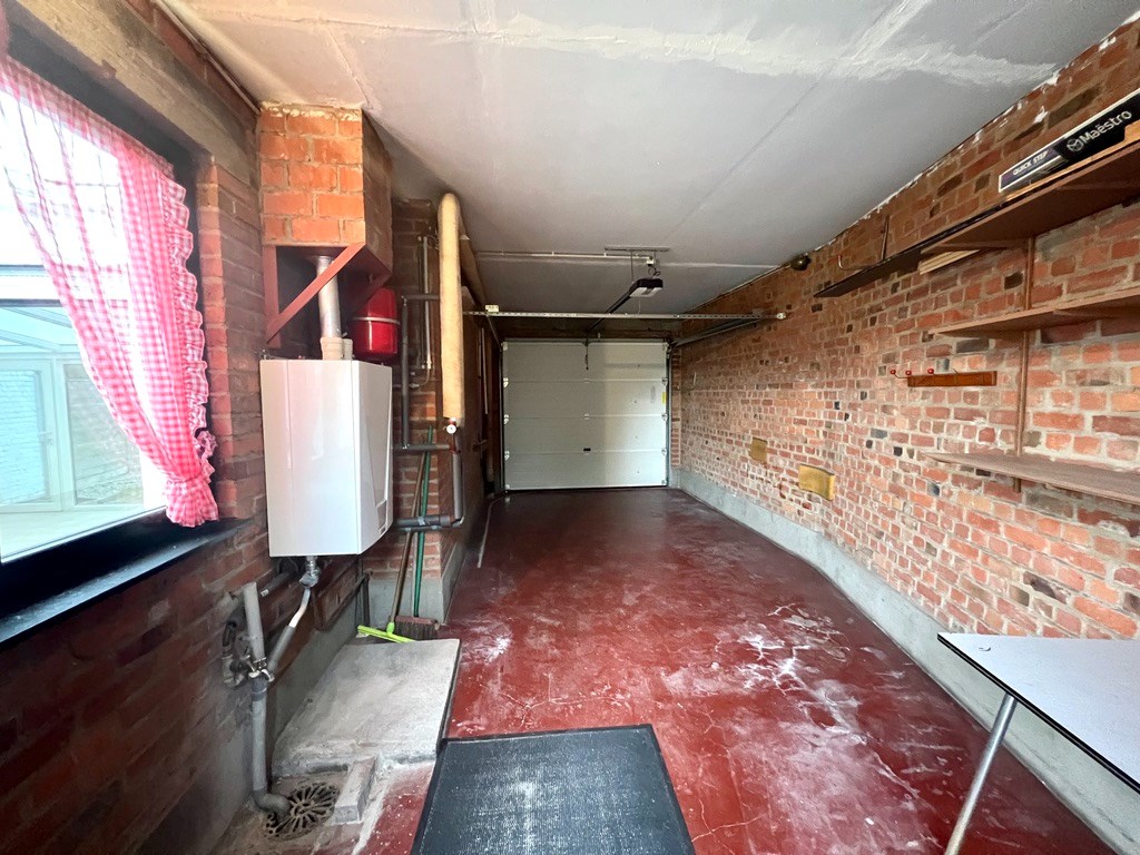 Inkomhal met gastentoilet. De leefruimte met open haard en veranda kijken uit op de tuin. De vernieuwde keuken is vooraan gelegen met toegang tot de droge kelder.