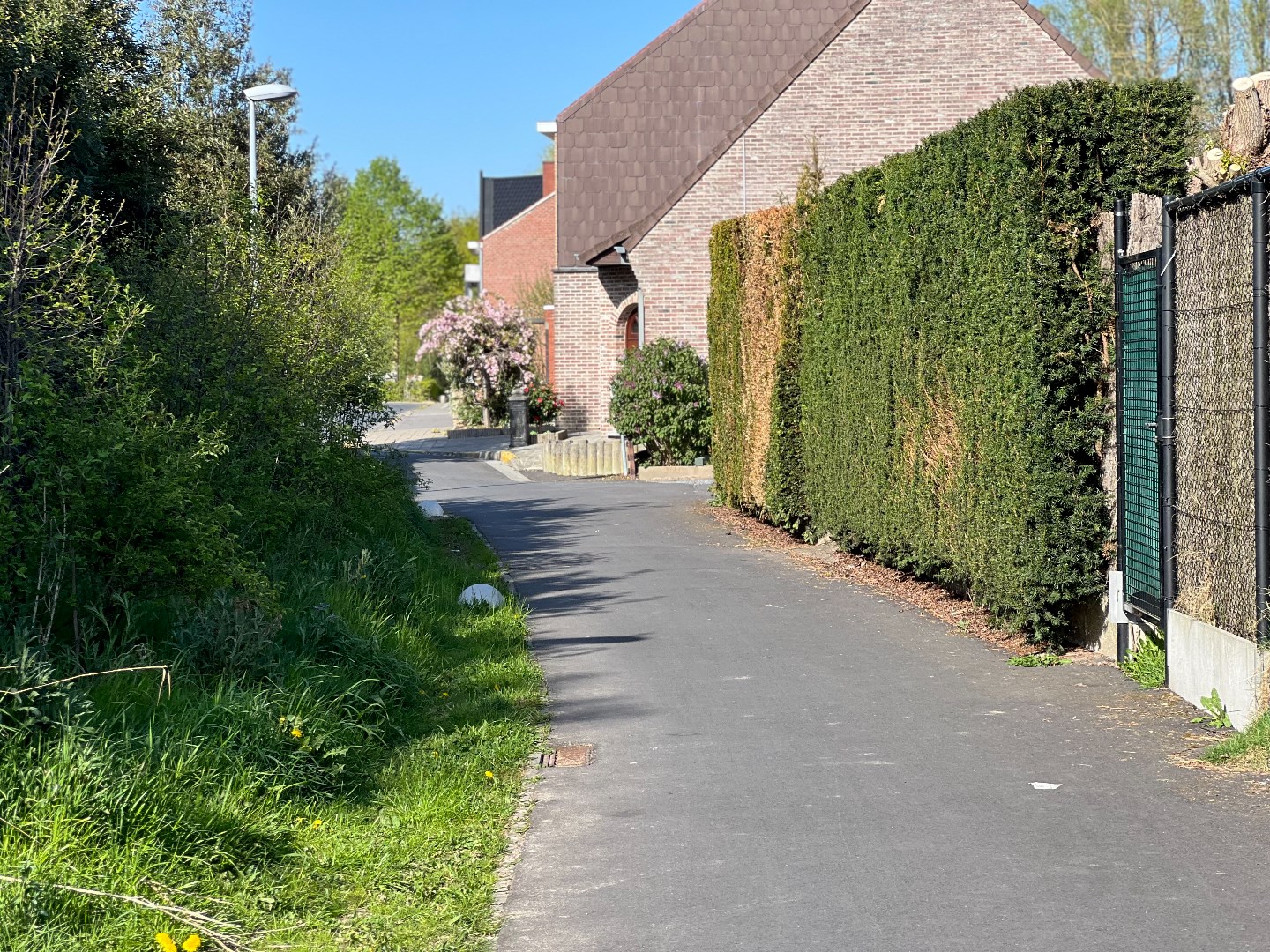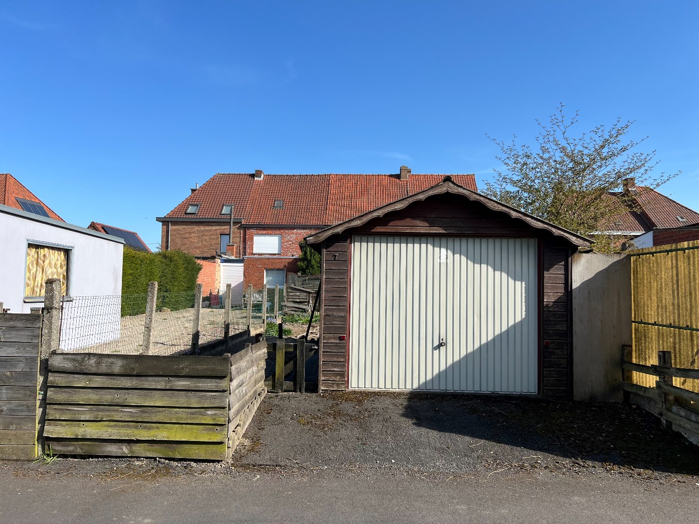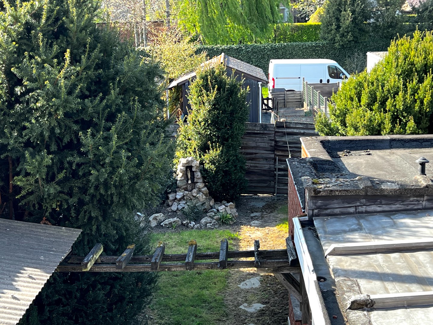 Diepe tuin met tuinhuis (met kantelpoort) waar de wagen kan geparkeerd worden en een uitweg.