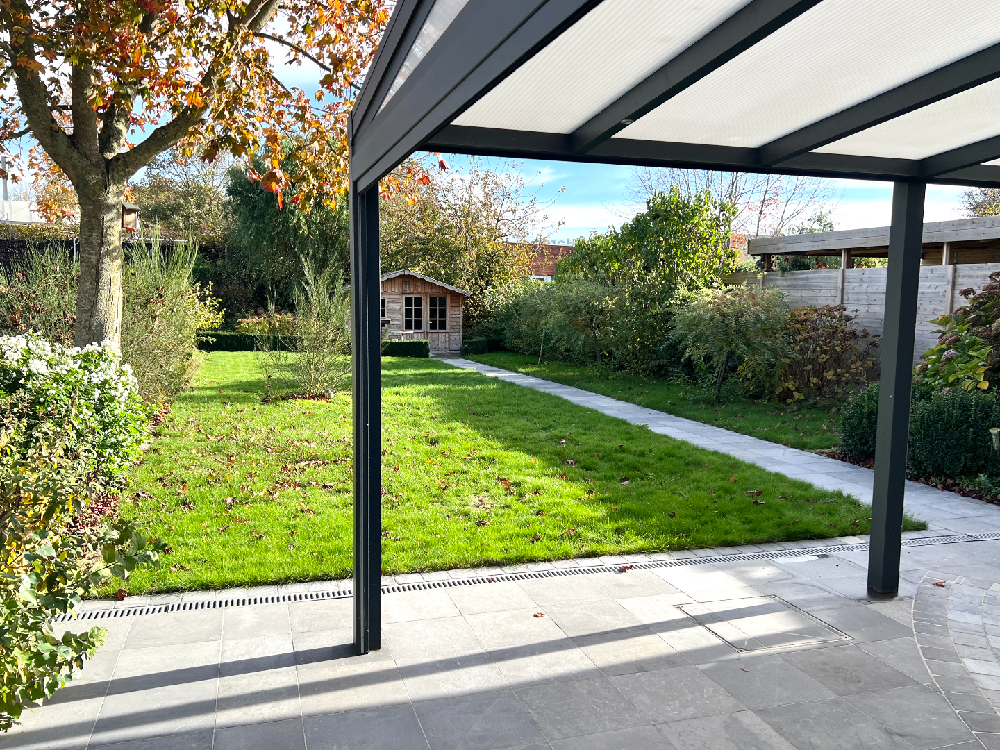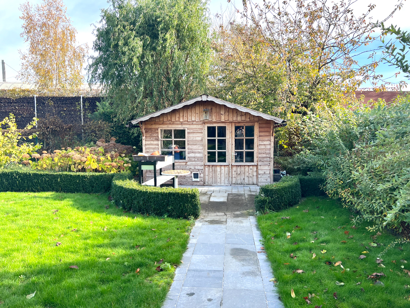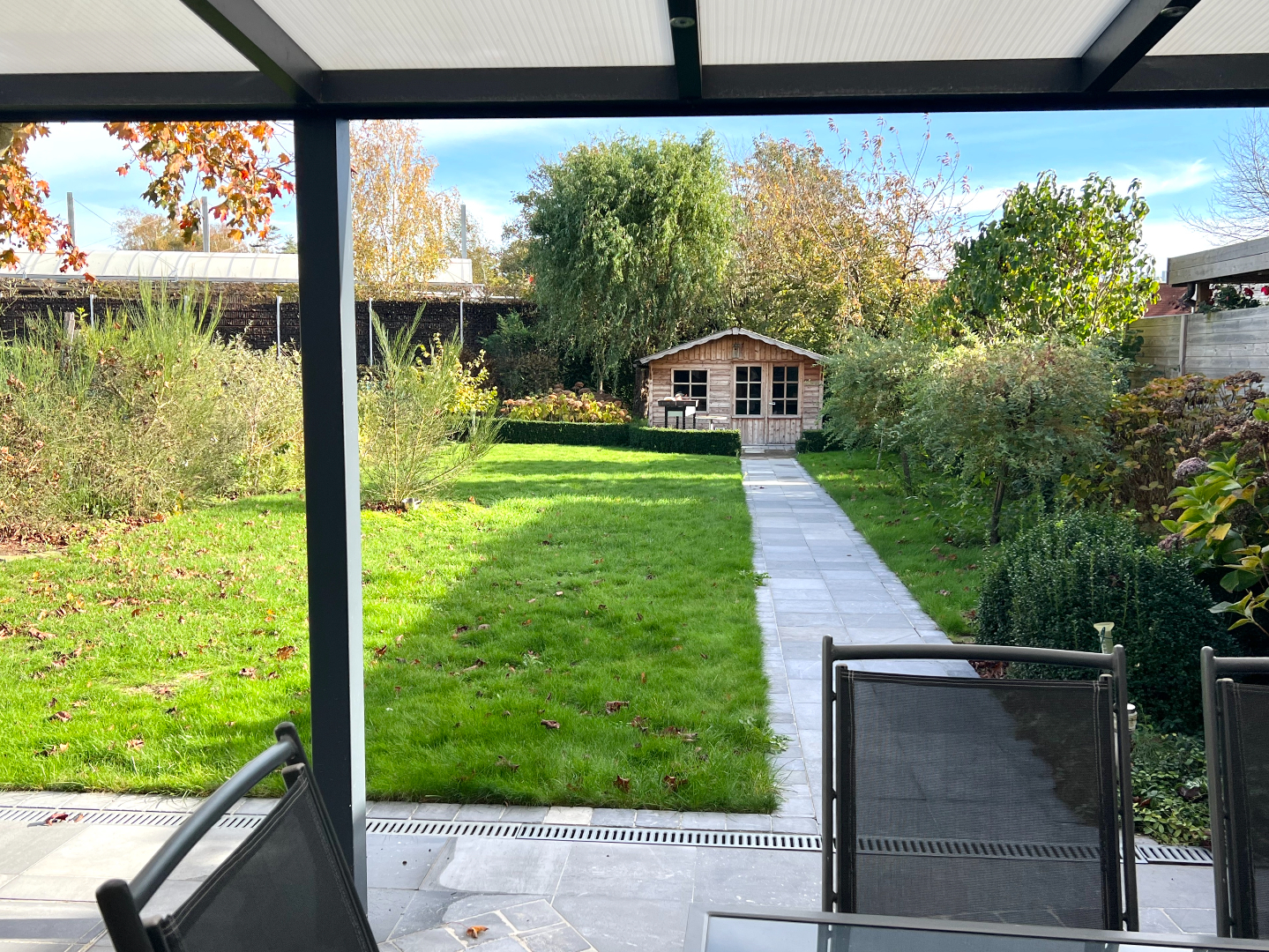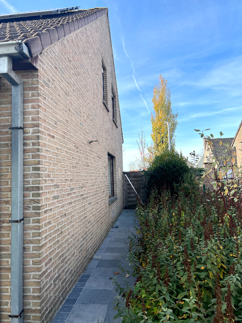 Komen we in de tuin terecht, heb je onmiddellijk een vakantie/thuisgevoel. Een groot overdekt terras om je tuinmeubilair te plaatsen, een mooi afgereden gazon, planten en een pad die leidt naar het knappe tuinhuis. Hier kan je echt je hartje bovenhalen om te genieten in je eigen tuin. Bovendien is er langs de zijkant van de woning een poortje voorzien zodat je zo met groenafval of andere zaken (zoals je fiets) niet doorheen je woning hoeft te gaan.